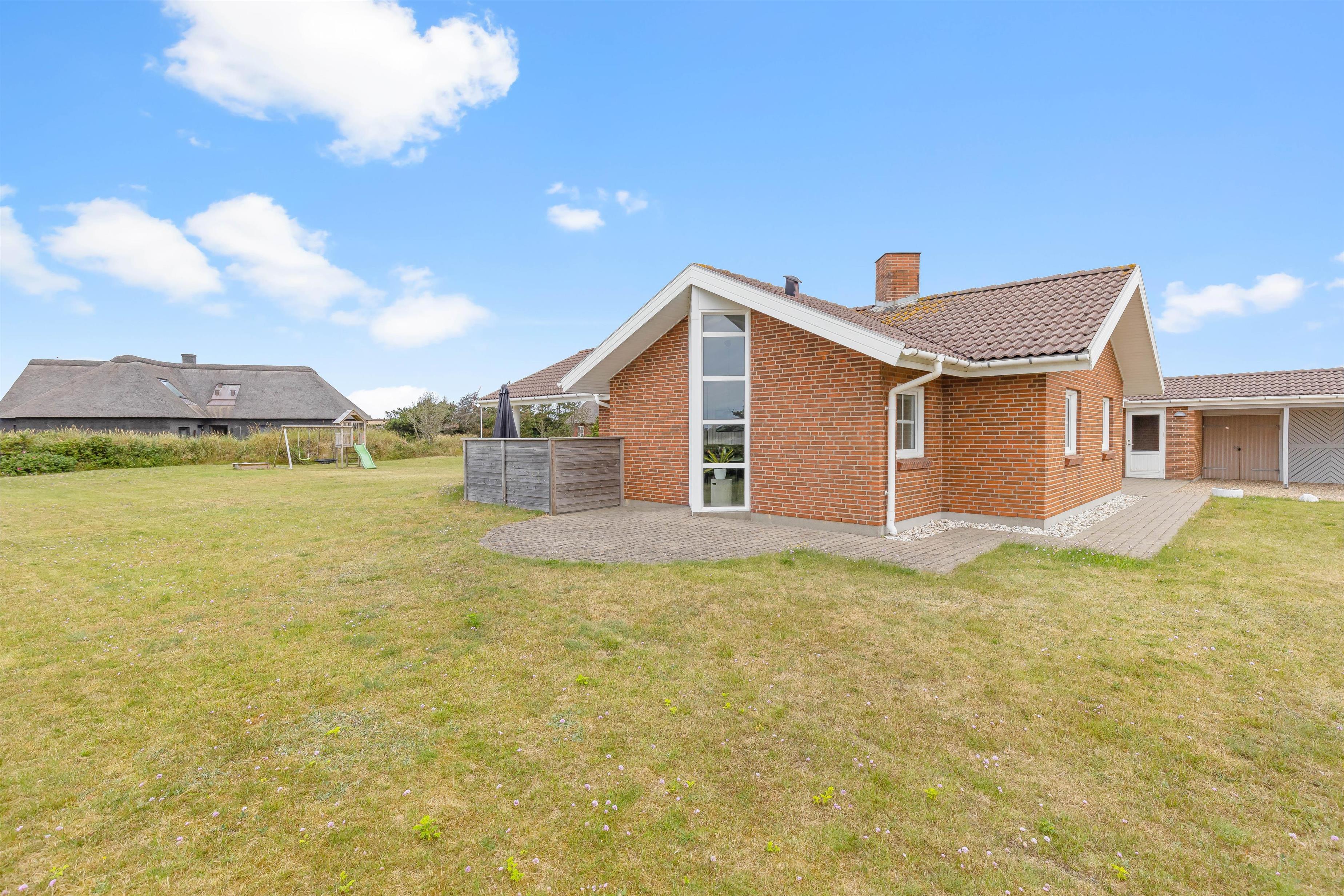På sommerhusets udeområde kan både store og små tilbringe feriens varme dage. Her venter jer en have med god plads, som feriens mindste gæster kan boltre sig på. Til dem er der desuden en sandkasse og et gyngestativ på udeområdet.