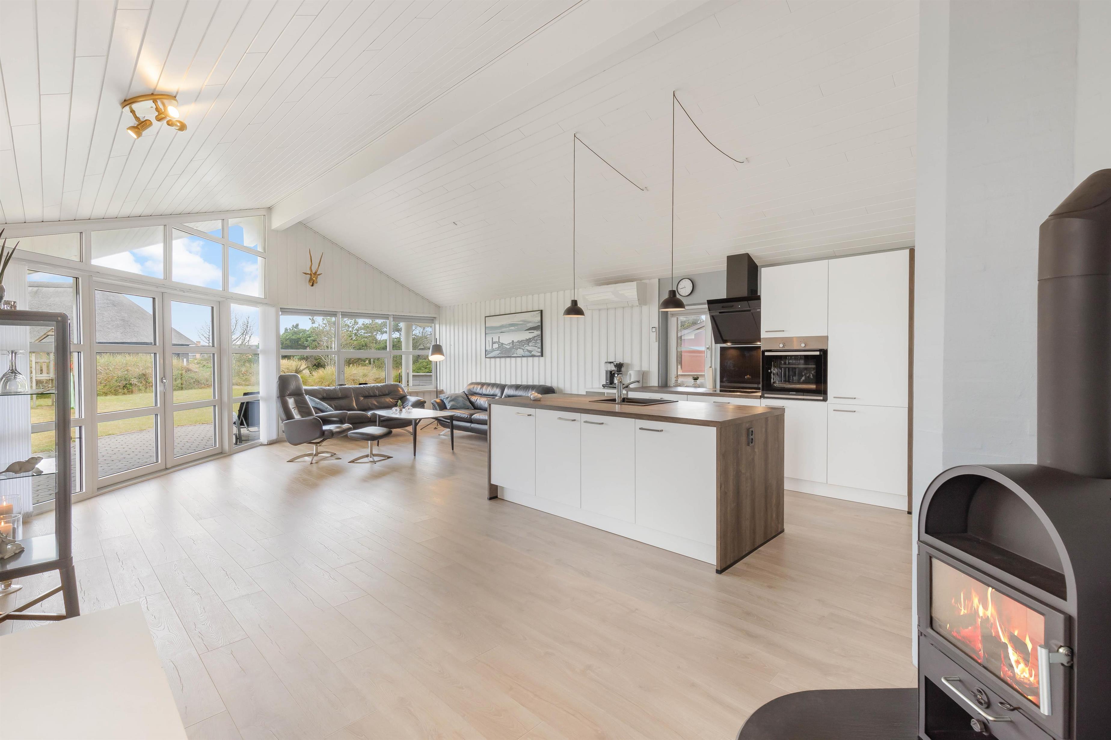 Brændeovnen i alrummet sørger med sin knitren og varme for at fuldende feriestemningen. Derudover har I også gulvvarme i alrummet, så I ikke fryser fødderne, samt en varmepumpe i feriehuset, der på energivenlig vis sørger for et godt indeklima.