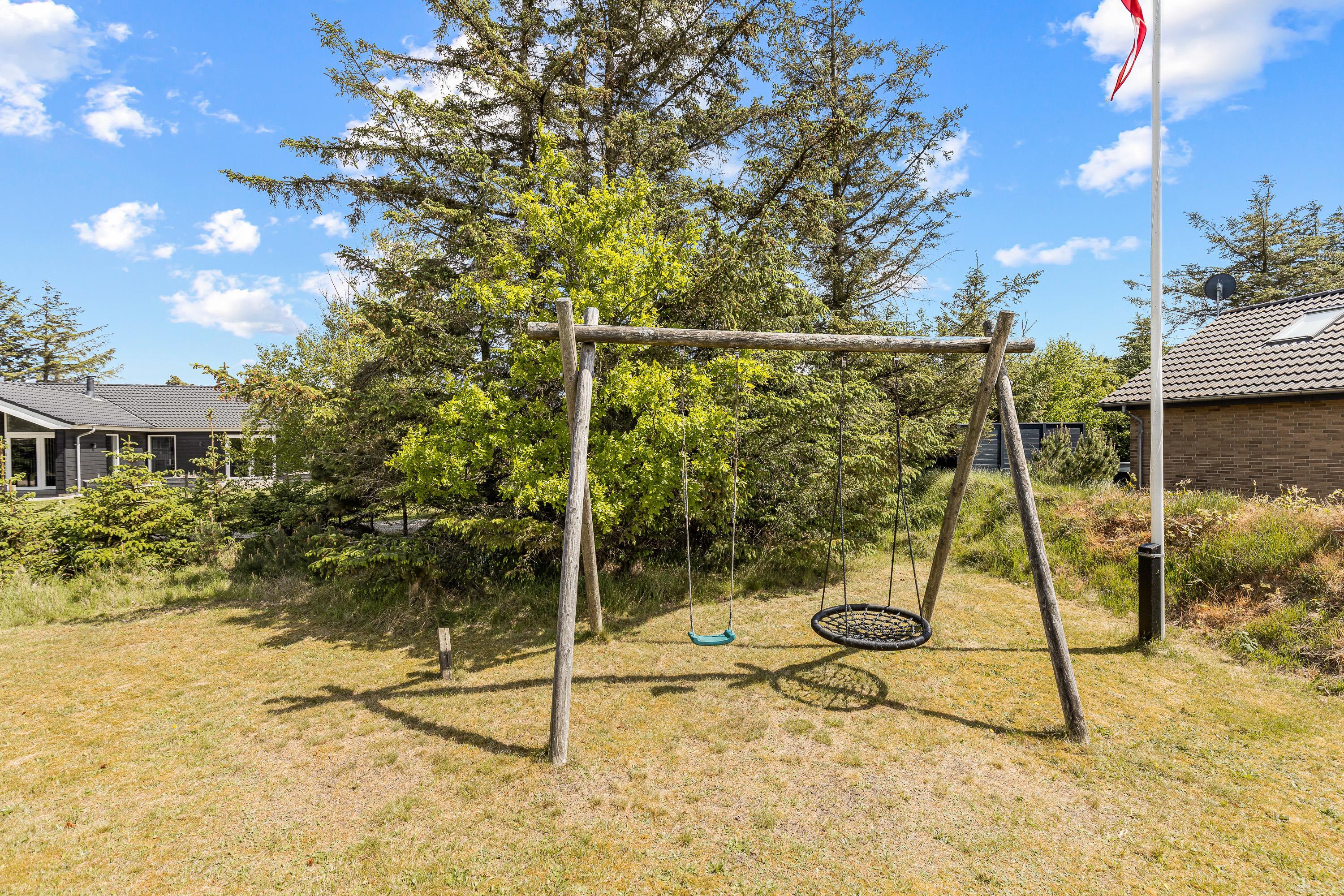 Sommerhuset ligger på en plænegrund, der er mere end 1.500 kvadratmeter stor, og her er der god plads til, at børnene kan boltre sig i haven. Til børnene er der desuden et gyngestativ i haven samt en trampolin, hvor de kan nyde nogle sjove timer.