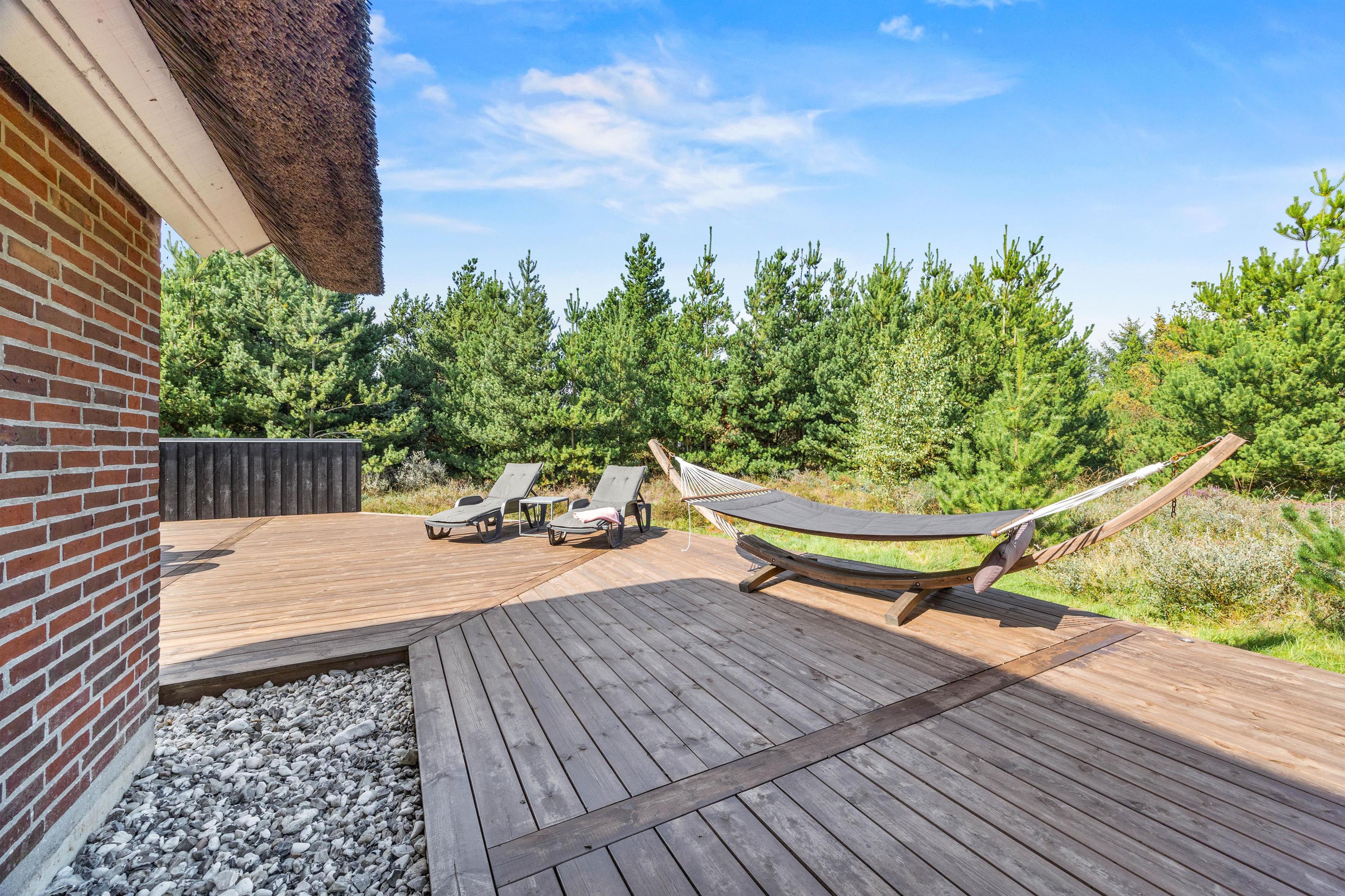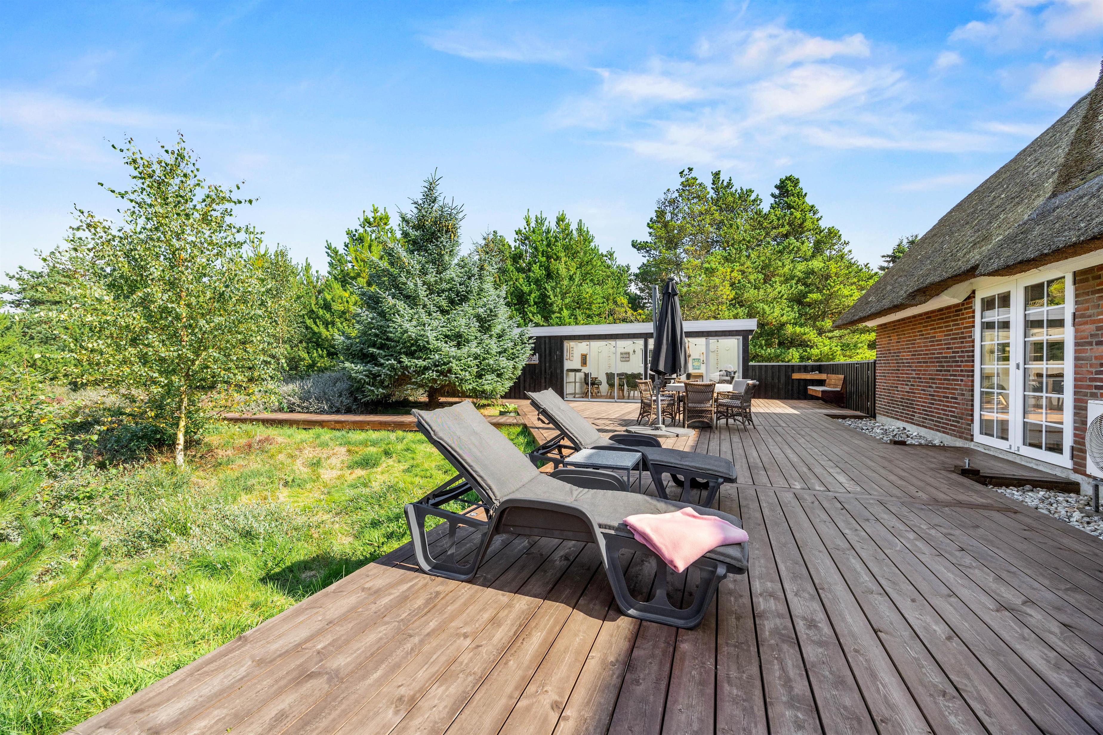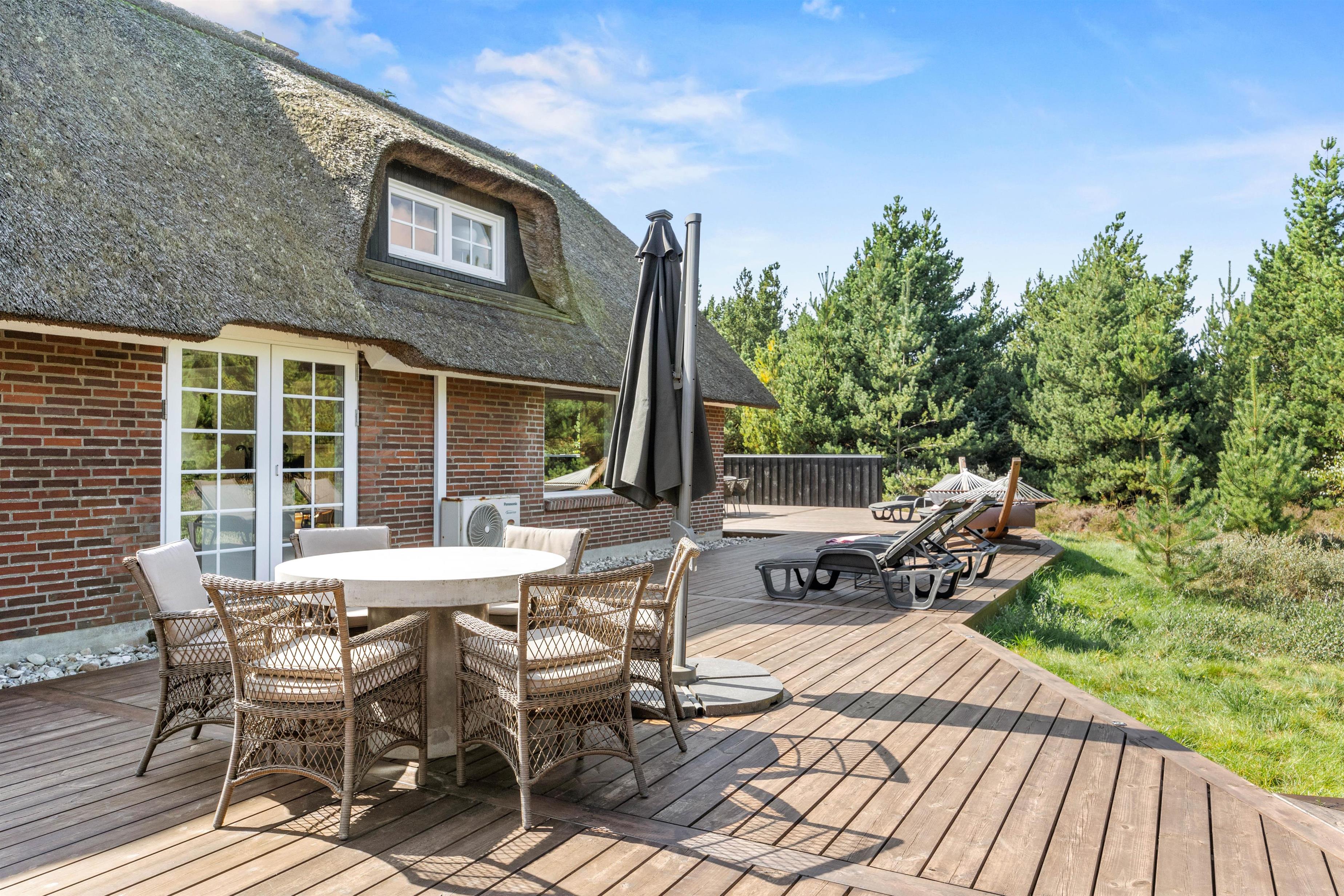 Den 250 m2 store delvist lukkede terrasse er udstyret med gode havemøbler, liggestole og en grill til de lune sommeraftener. Her finder hele familien og hunden en plads i solen. I forlængelse af Terassen er der en dejlig hytte, hvor man kan trække ind hvis duggen falder. Her er plads til at 8 personer kan sidde og hygge sig rundt bordet.