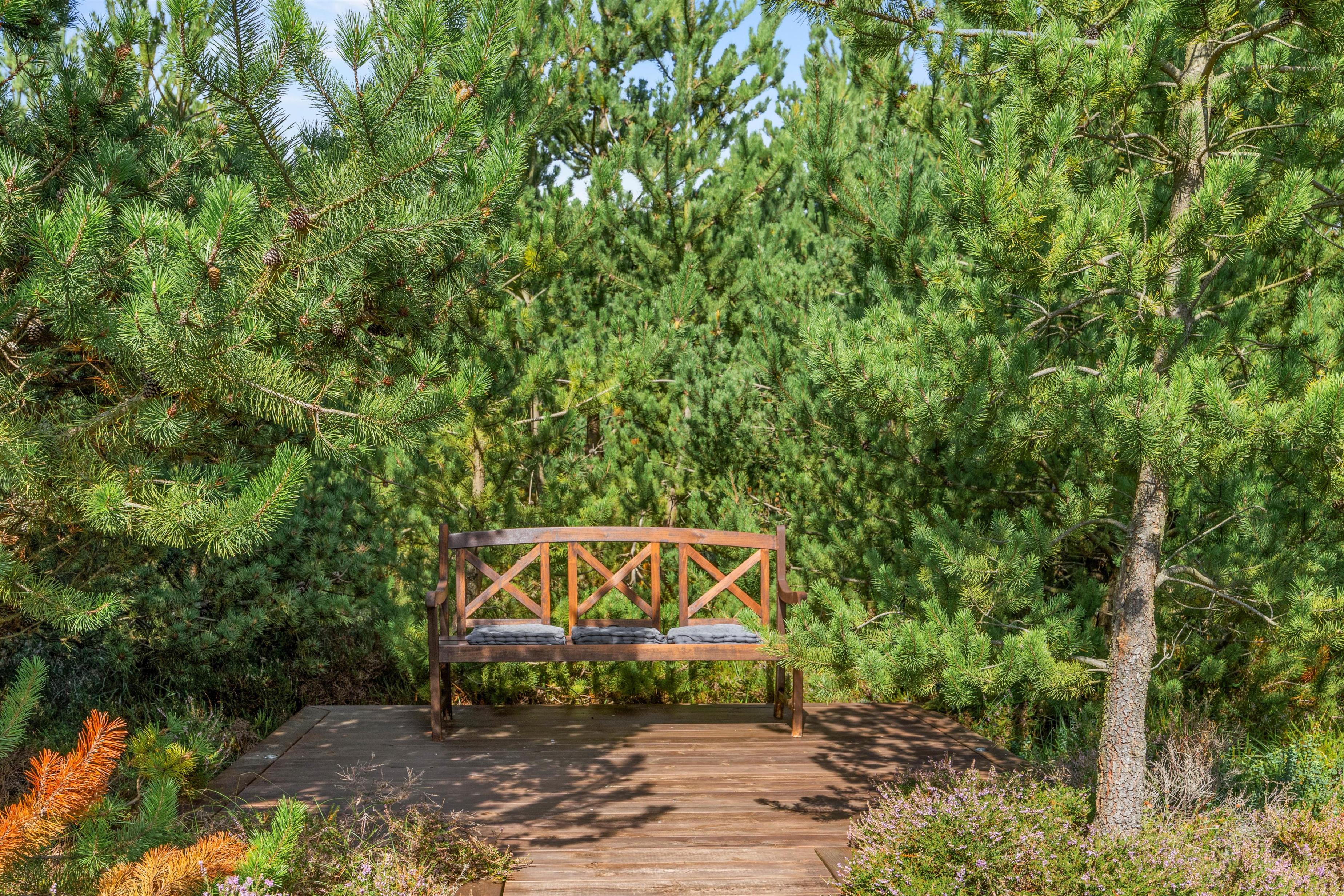Den 4.200 kvadratmeter store grund er omgivet af høje træer, der sørger for god læ og en helt ugeneret beliggenhed midt i den grønne natur. Børnene og hunden vil helt sikkert elske at gå på opdagelse eller spille bold på den velholdte græsplæne.