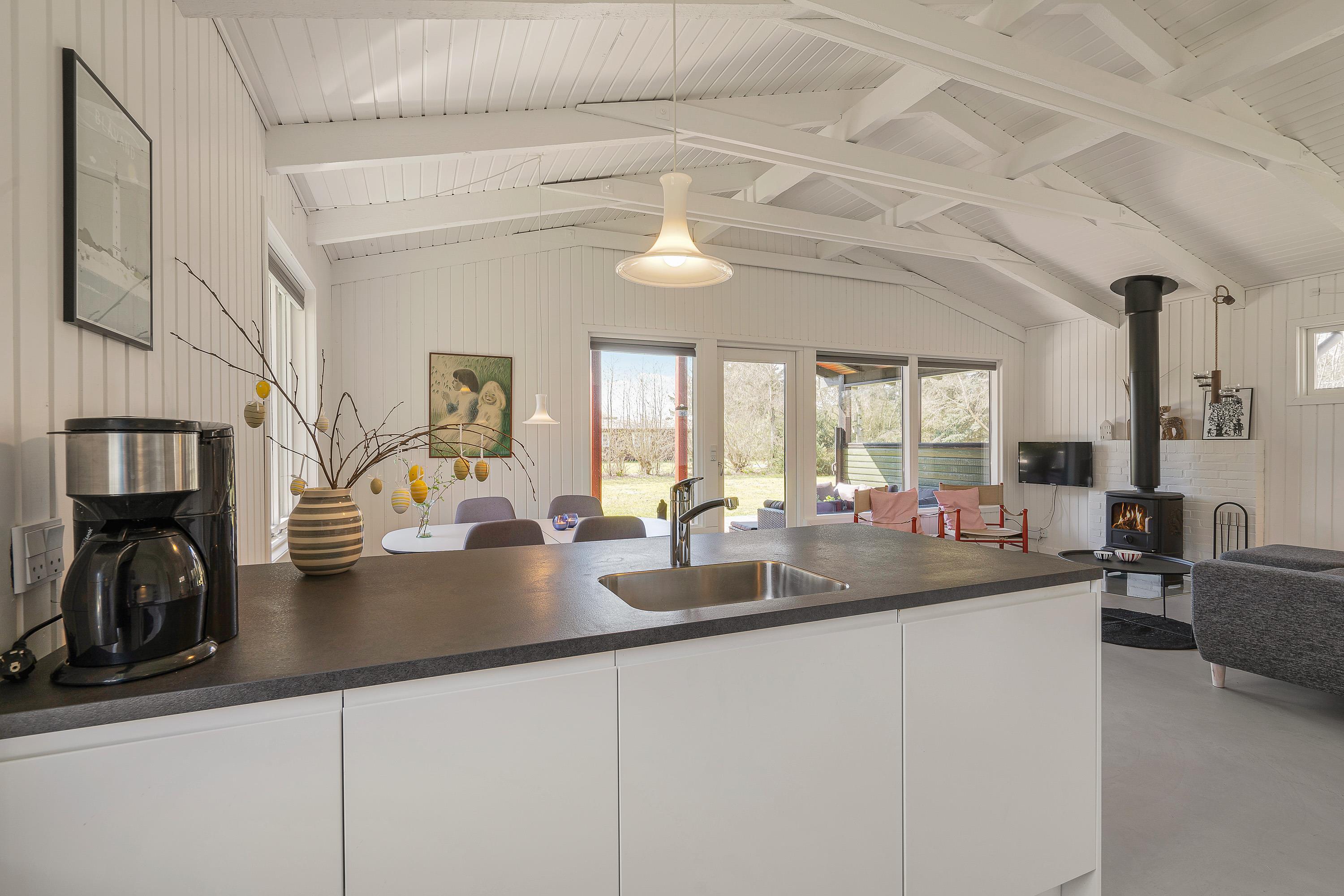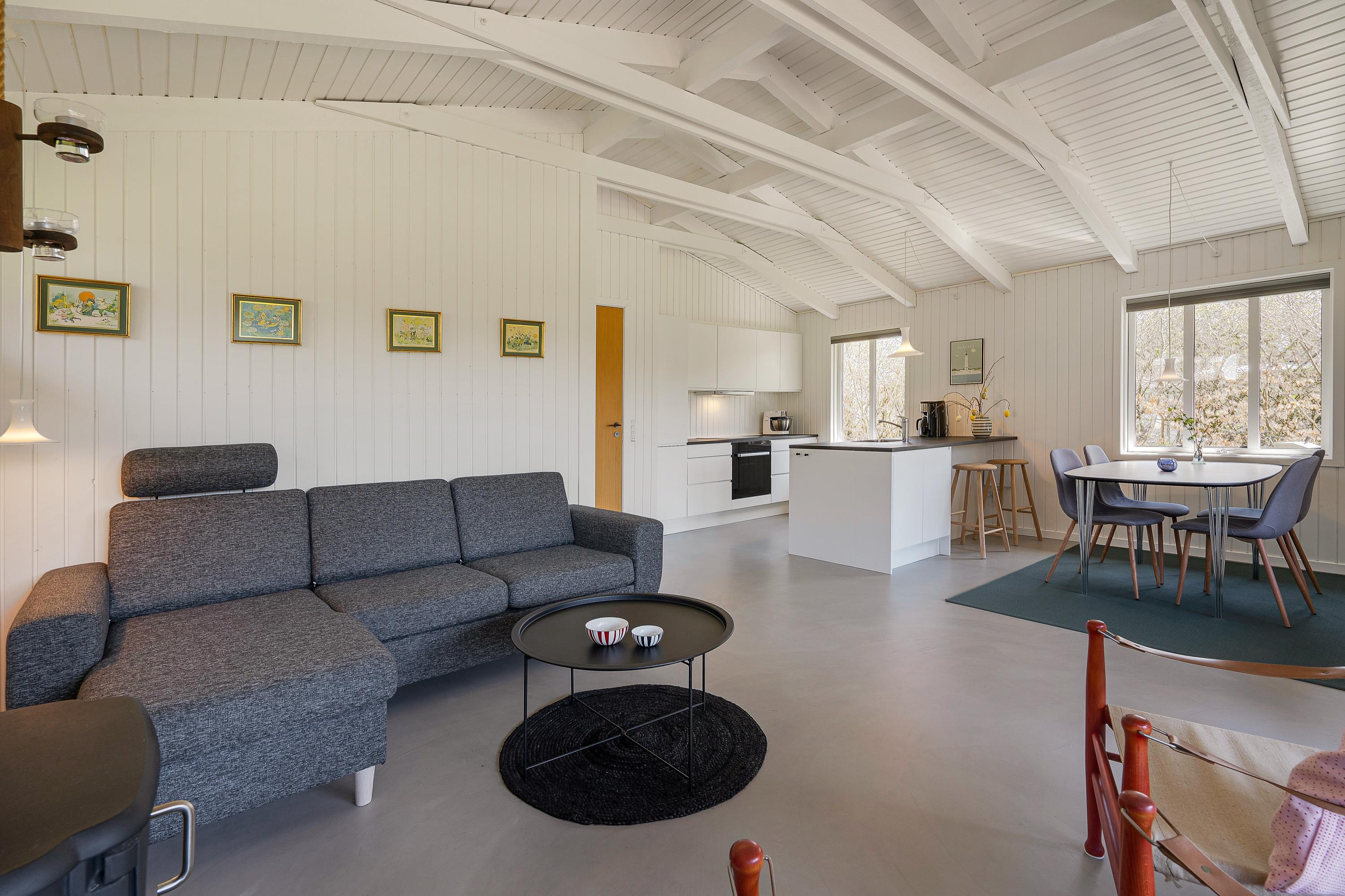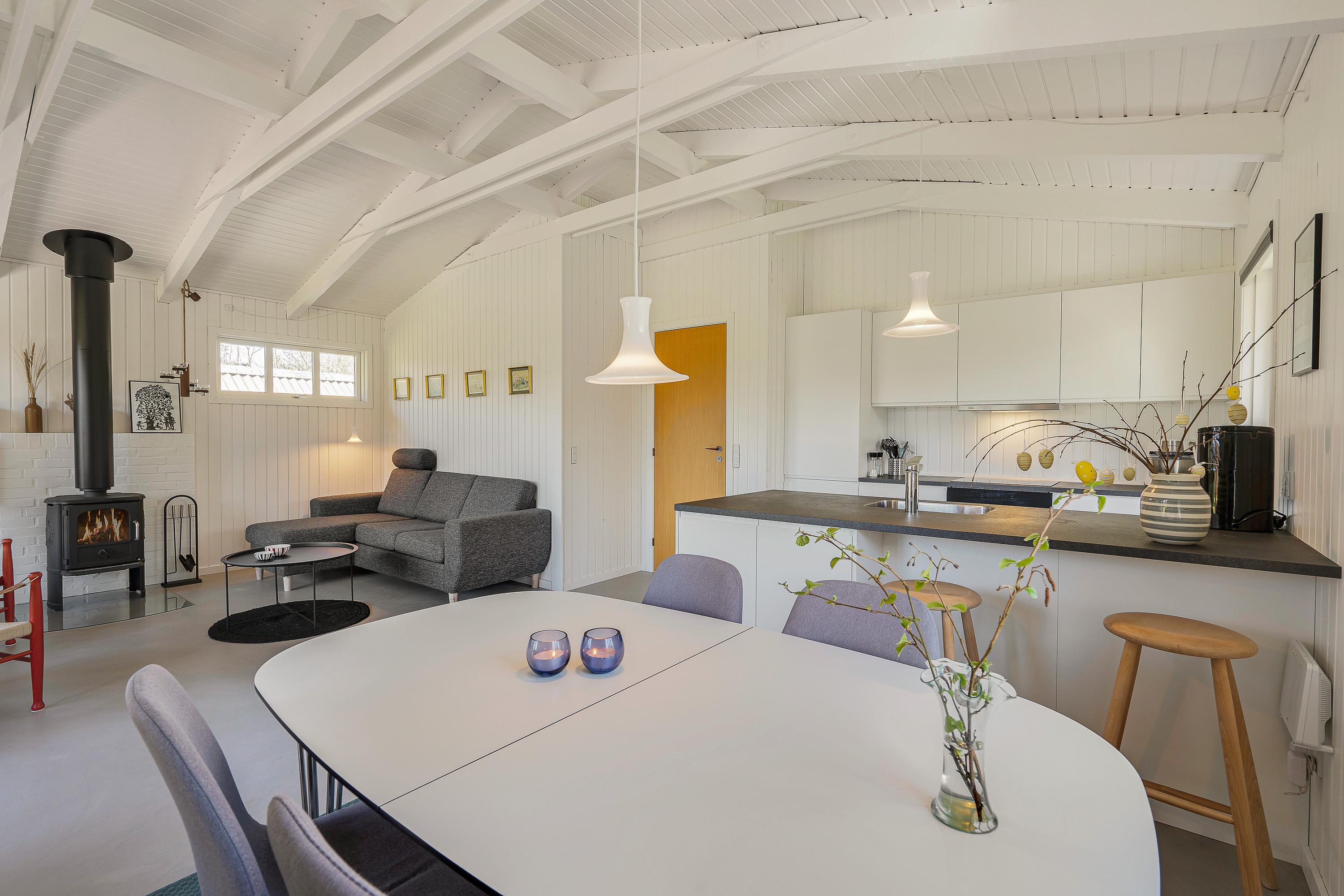 Opholdsrummet bliver med garanti centrum for hyggeligt samvær med stue, køkken og spisestue i ét - og på grå og regnfulde dage sørger brændeovnen for feriestemning i verdensklasse. Slå jer ned i den behagelige sofa med en god film på Smart-tv’et, eller tag et brætspil ved spisebordet. Mulighederne er mange.