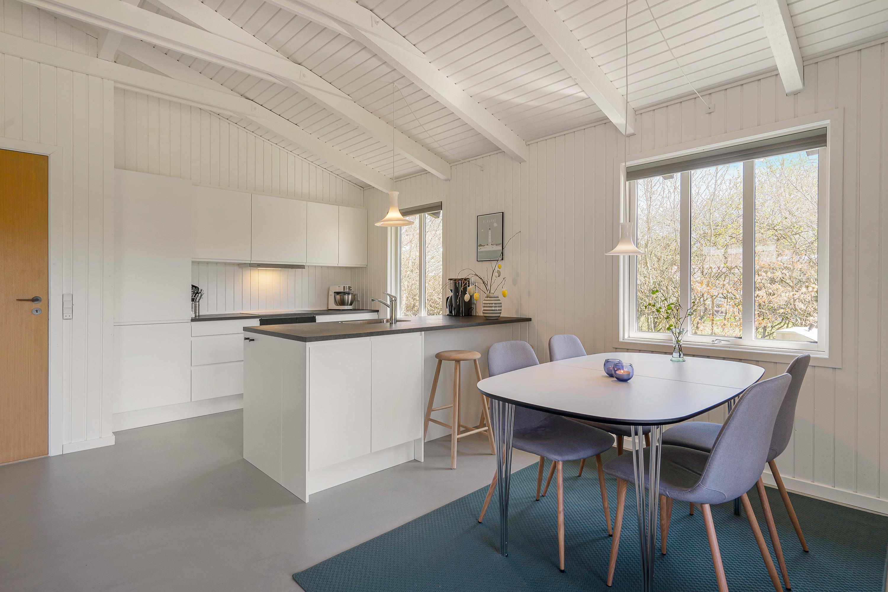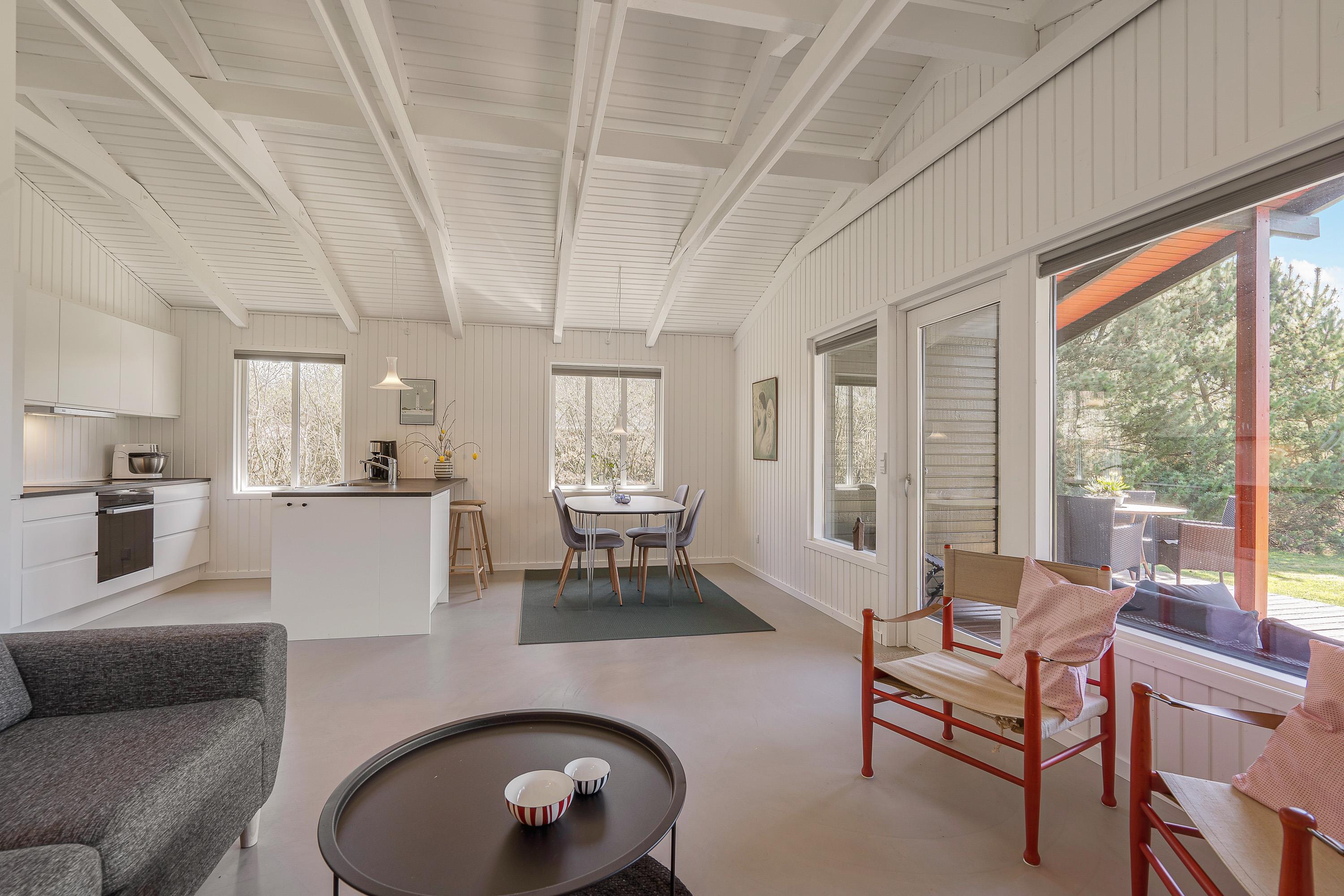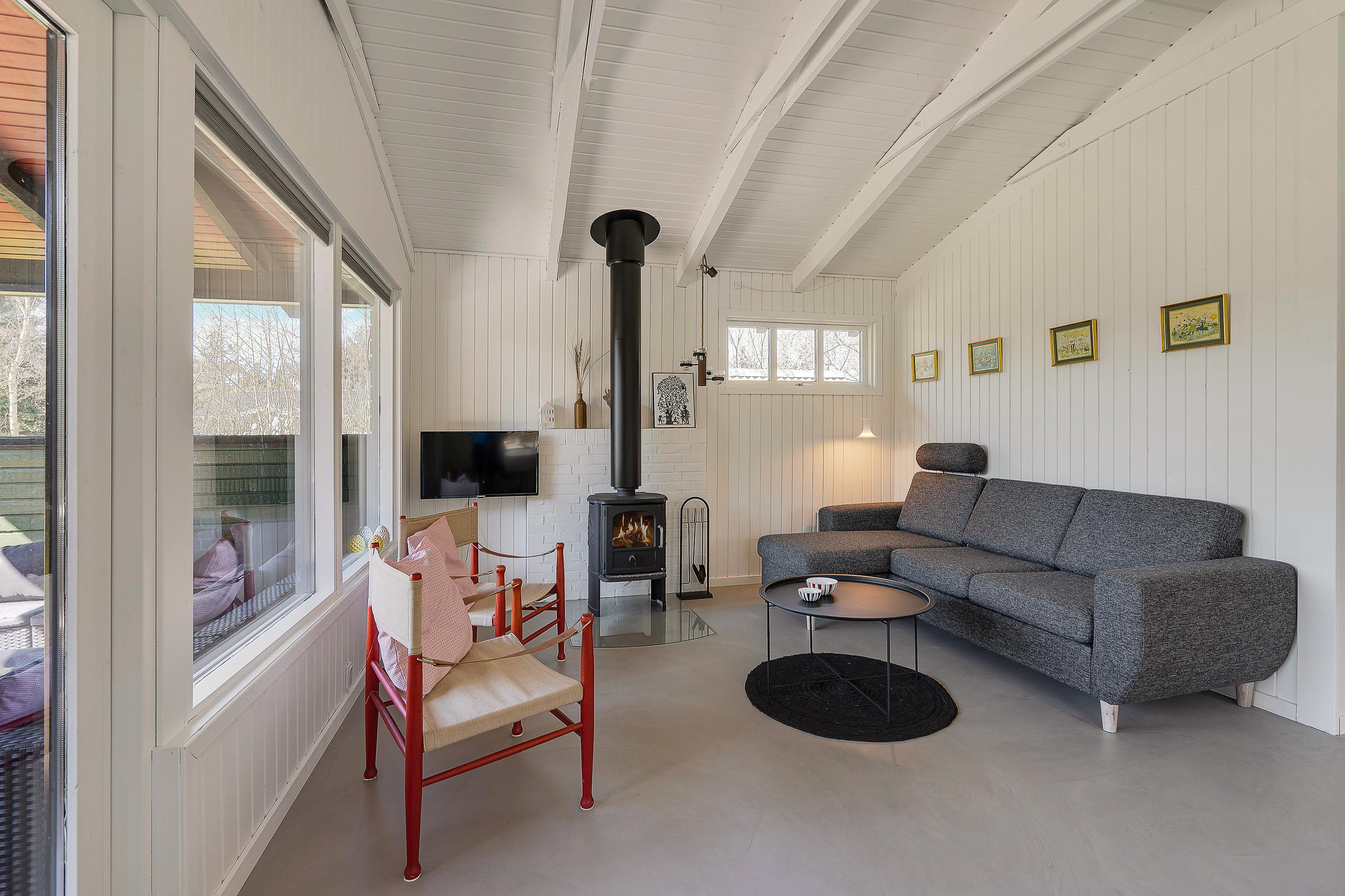 Opholdsrummet bliver med garanti centrum for hyggeligt samvær med stue, køkken og spisestue i ét - og på grå og regnfulde dage sørger brændeovnen for feriestemning i verdensklasse. Slå jer ned i den behagelige sofa med en god film på Smart-tv’et, eller tag et brætspil ved spisebordet. Mulighederne er mange.
