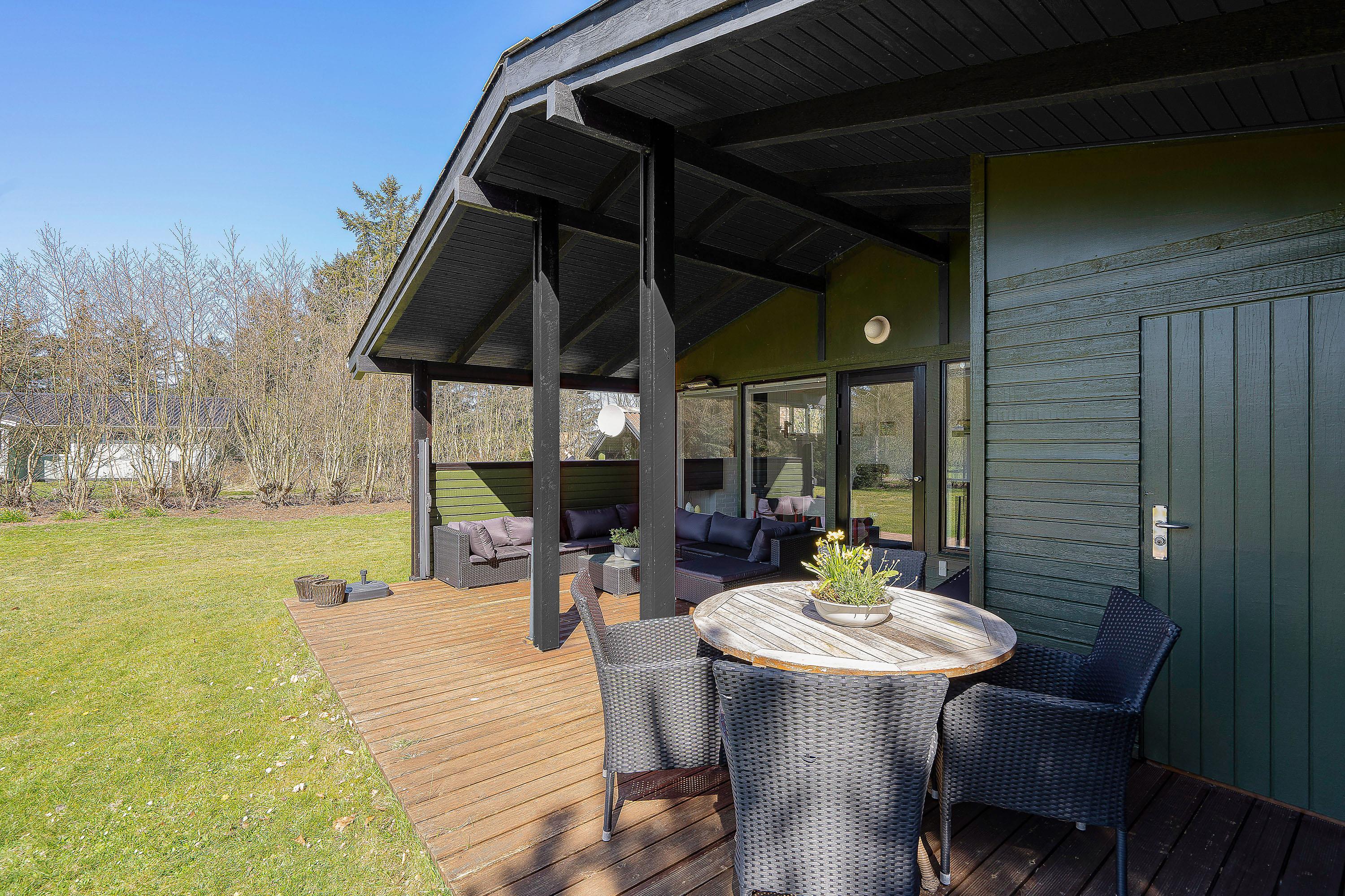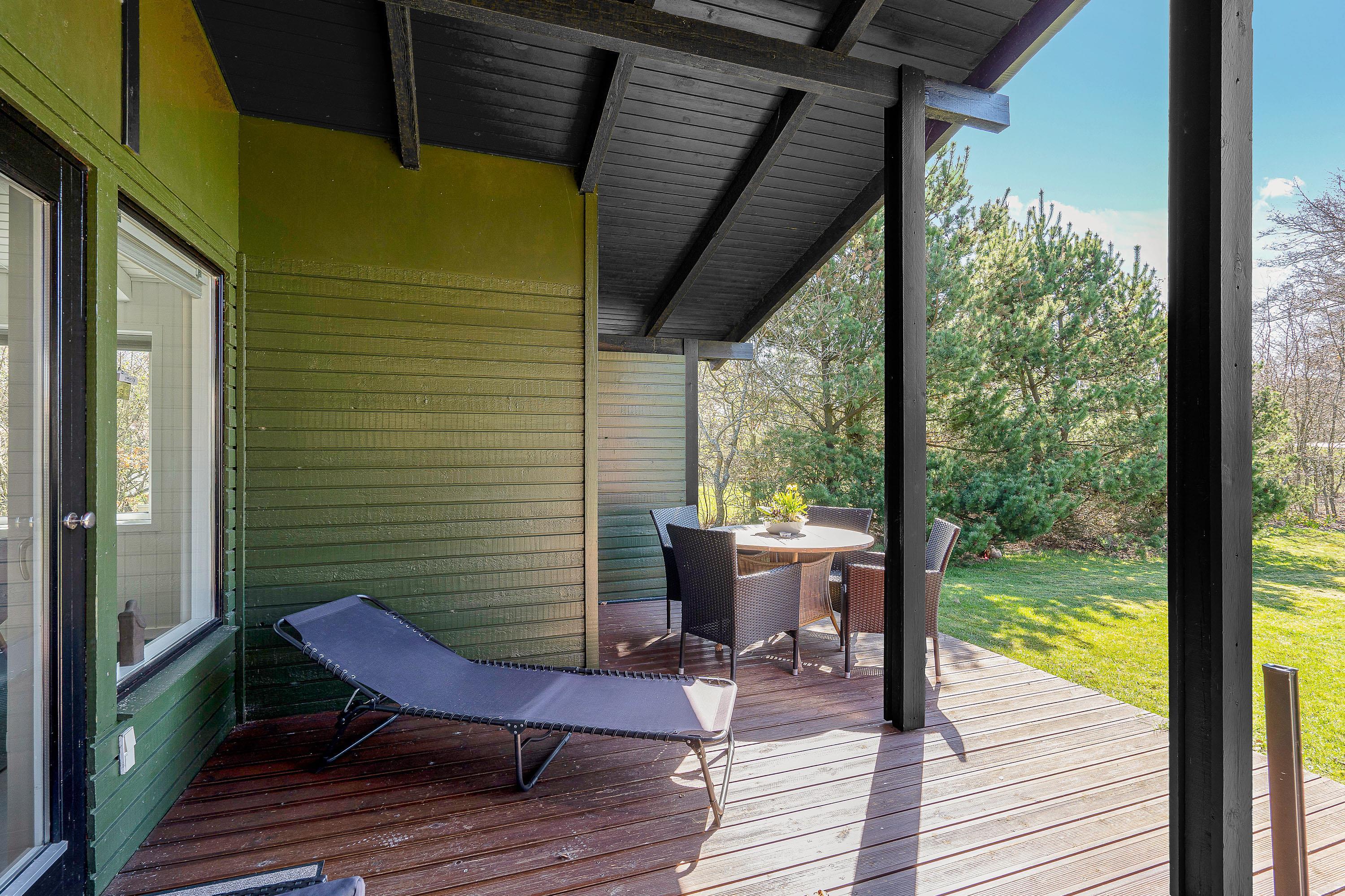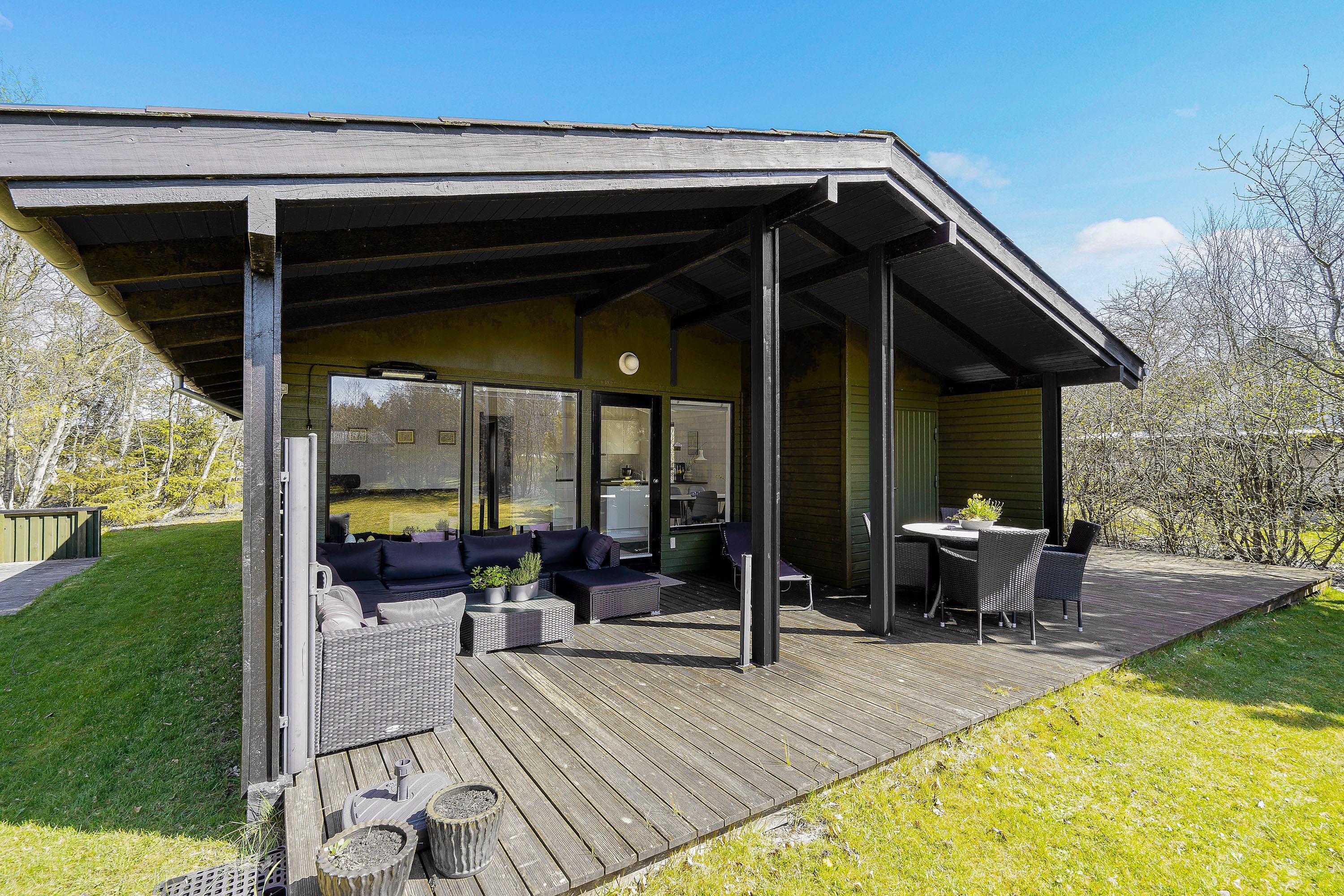 Sommerhuset er beliggende på en 2.300 kvadratmeter stor plænegrund, godt afskærmet af træer og buske. Her kan I på ugeneret vis tanke ny energi i den friske luft på terrassen – som tilmed er delvist overdækket.