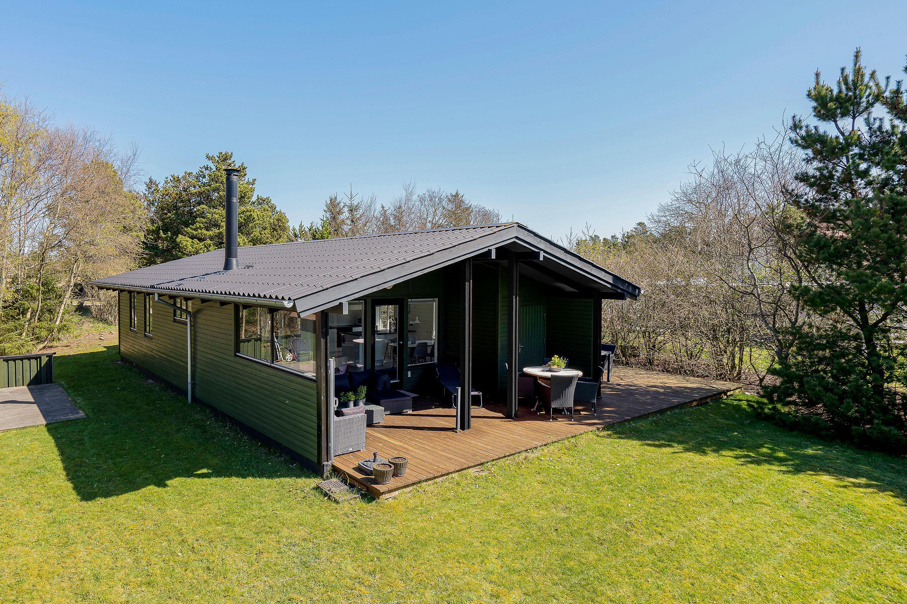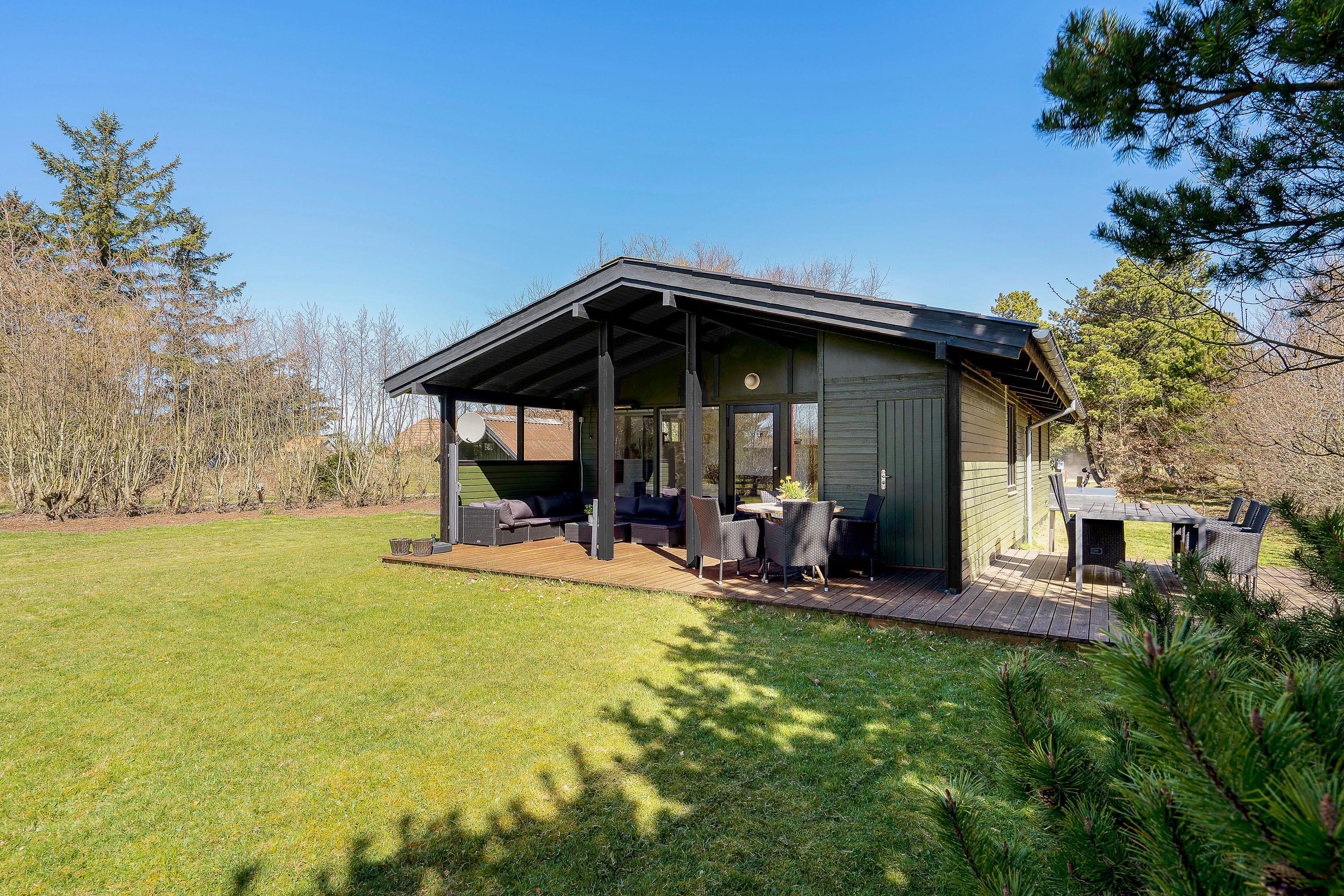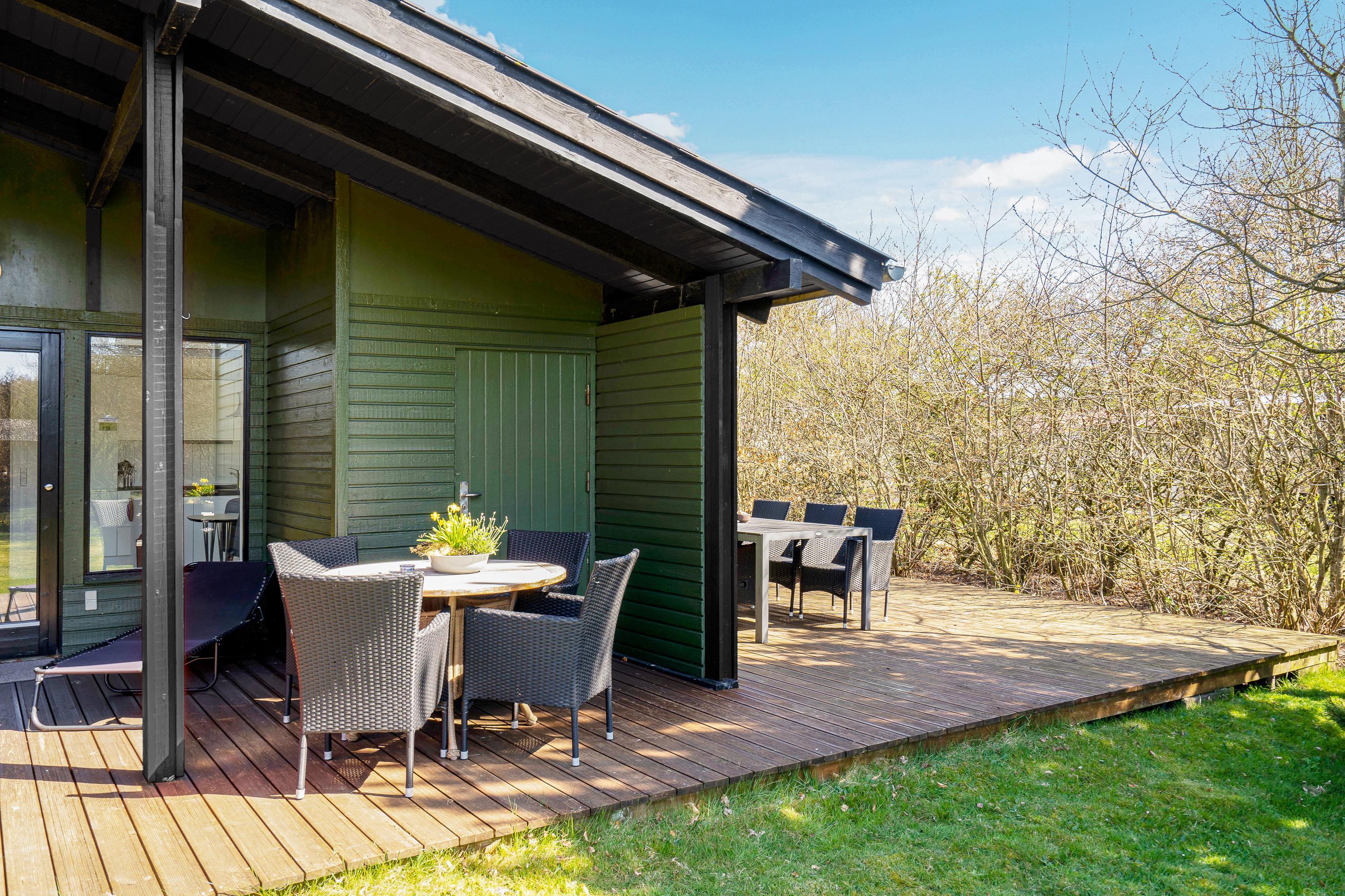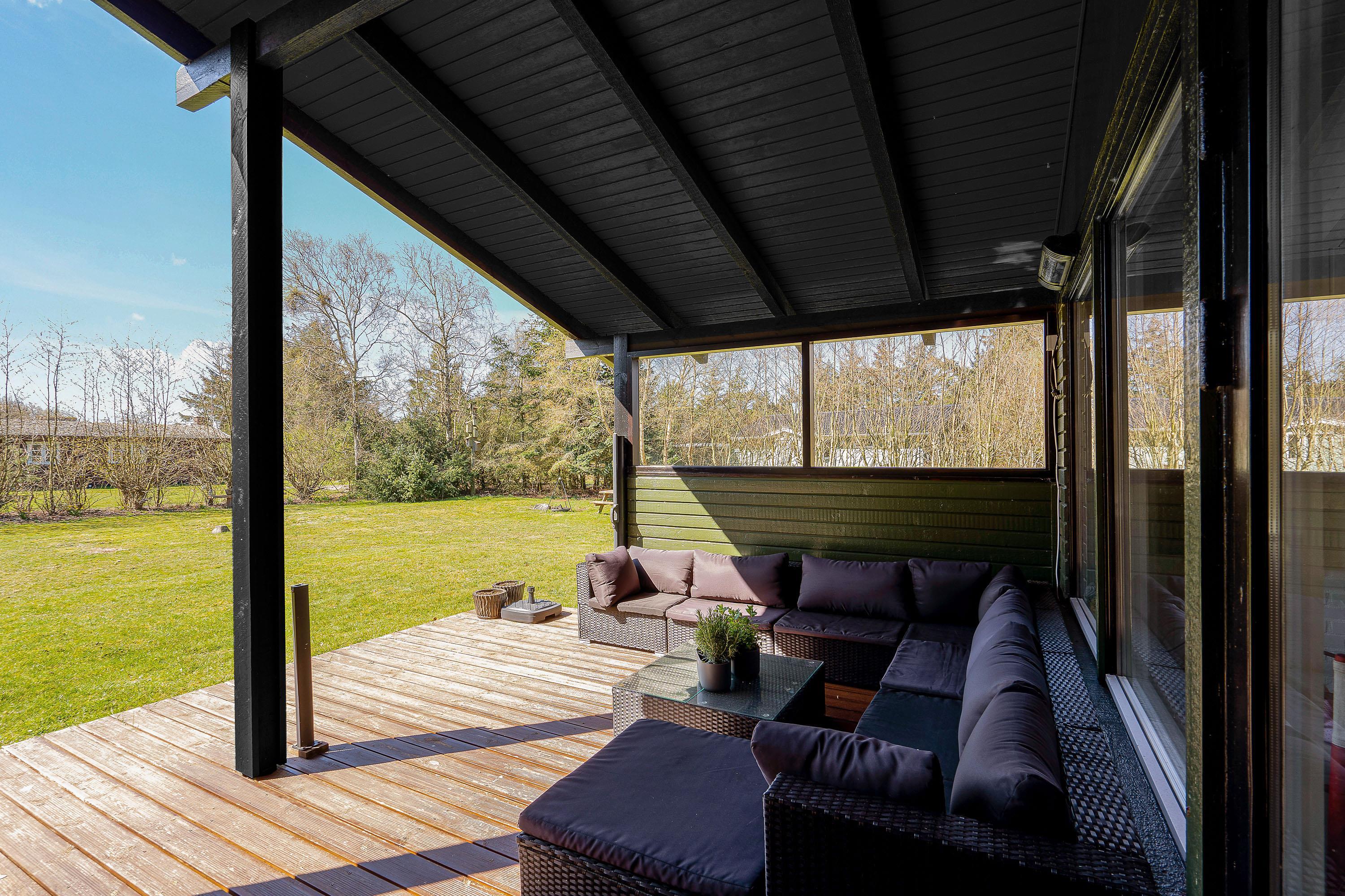 Sommerhuset er beliggende på en 2.300 kvadratmeter stor plænegrund, godt afskærmet af træer og buske. Her kan I på ugeneret vis tanke ny energi i den friske luft på terrassen – som tilmed er delvist overdækket.