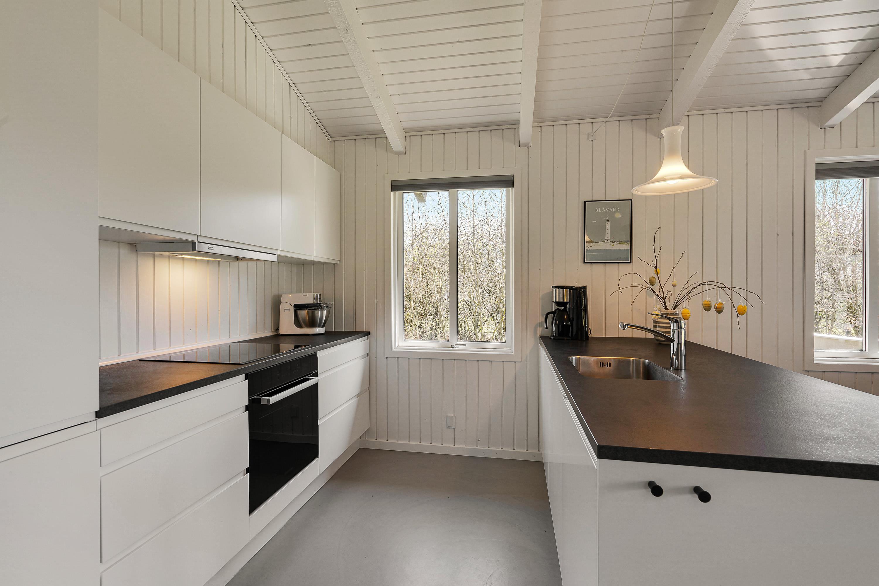 Feriehuset er lyst, enkelt og smagfuldt indrettet med moderne mikrocement-gulve og behagelige møbler, og badeværelset er udstyret med gulvvarme, så I ikke kommer til at fryse fødderne om morgenen. Der står desuden gratis internetforbindelse til rådighed.