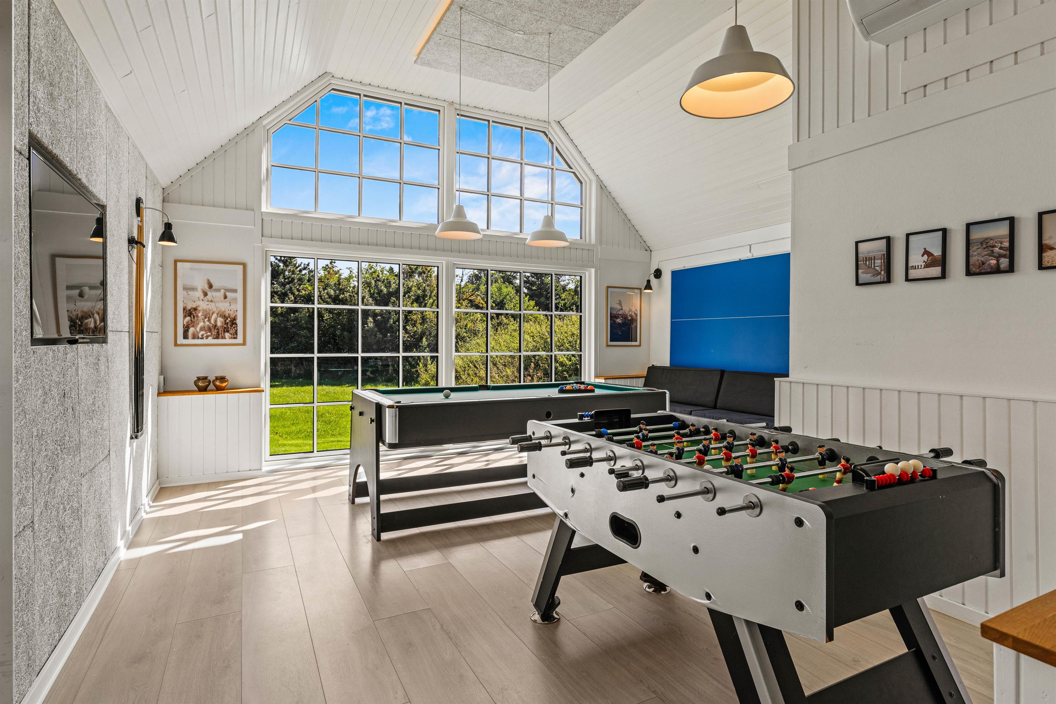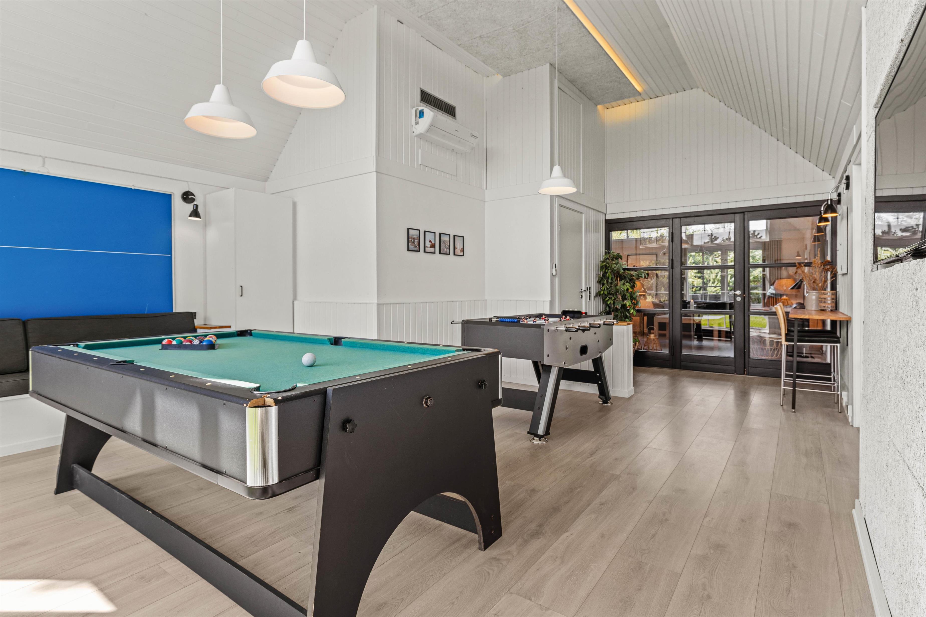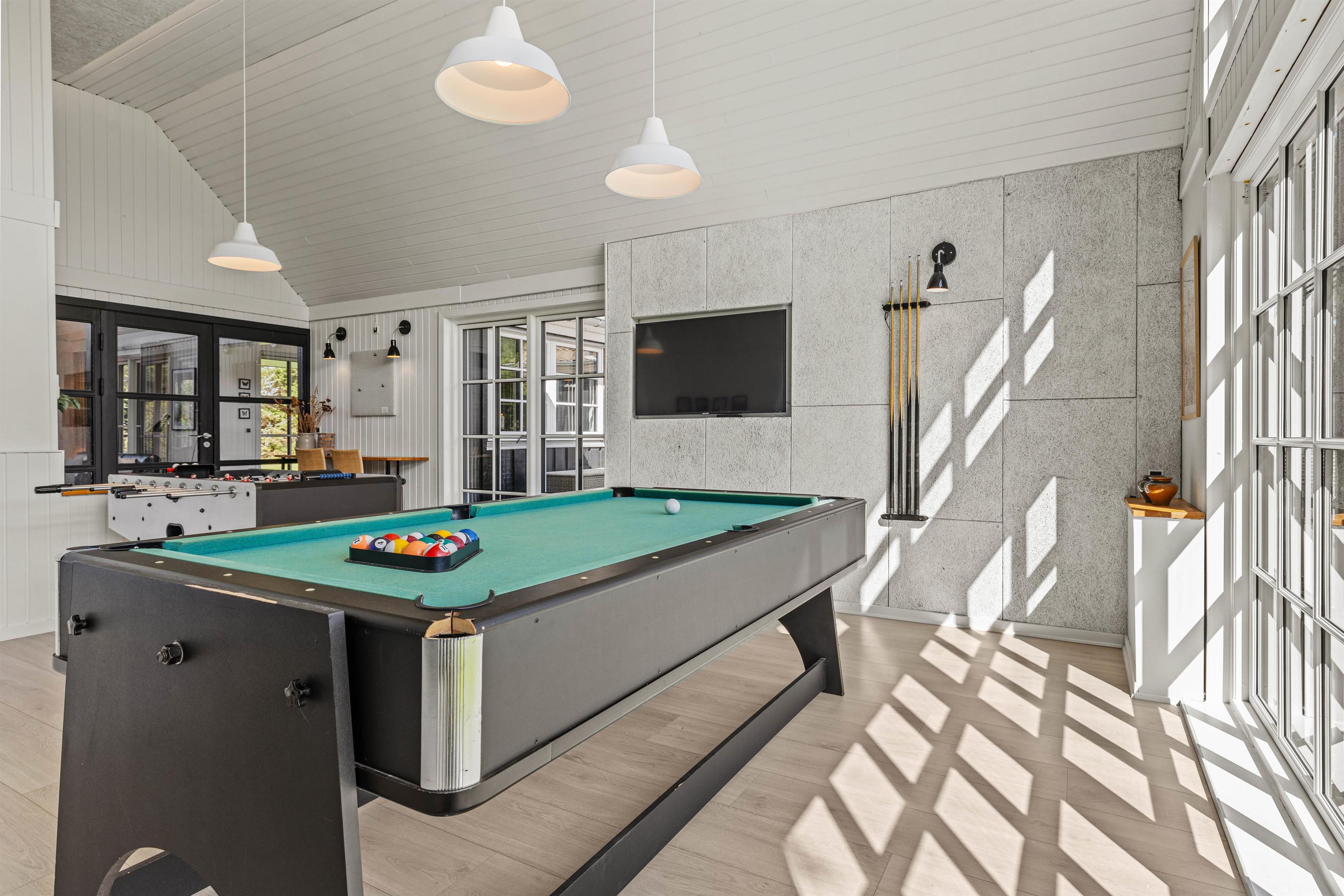 Det 172 m2 store flotte hus er stilfuldt indrette og rummer alle vigtige faciliteter og mere til. De store lyse fællesrum – det moderne køkken og stuen med brændeovnen og et opholdsrum med pool billard, air hockey eller bordtennis lover masser af fælles feriehygge. Her føler hele familien sig godt tilpas, og en regnvejrsdag kan sagtens blive til feriens hyggeligste! I det moderne køkken er der naturligvis opvaskemaskine og det store køleskab lover kolde drinks med masser af is på varme dage. Naturligvis er huset udstyret med både vaskemaskine og tørretumbler.