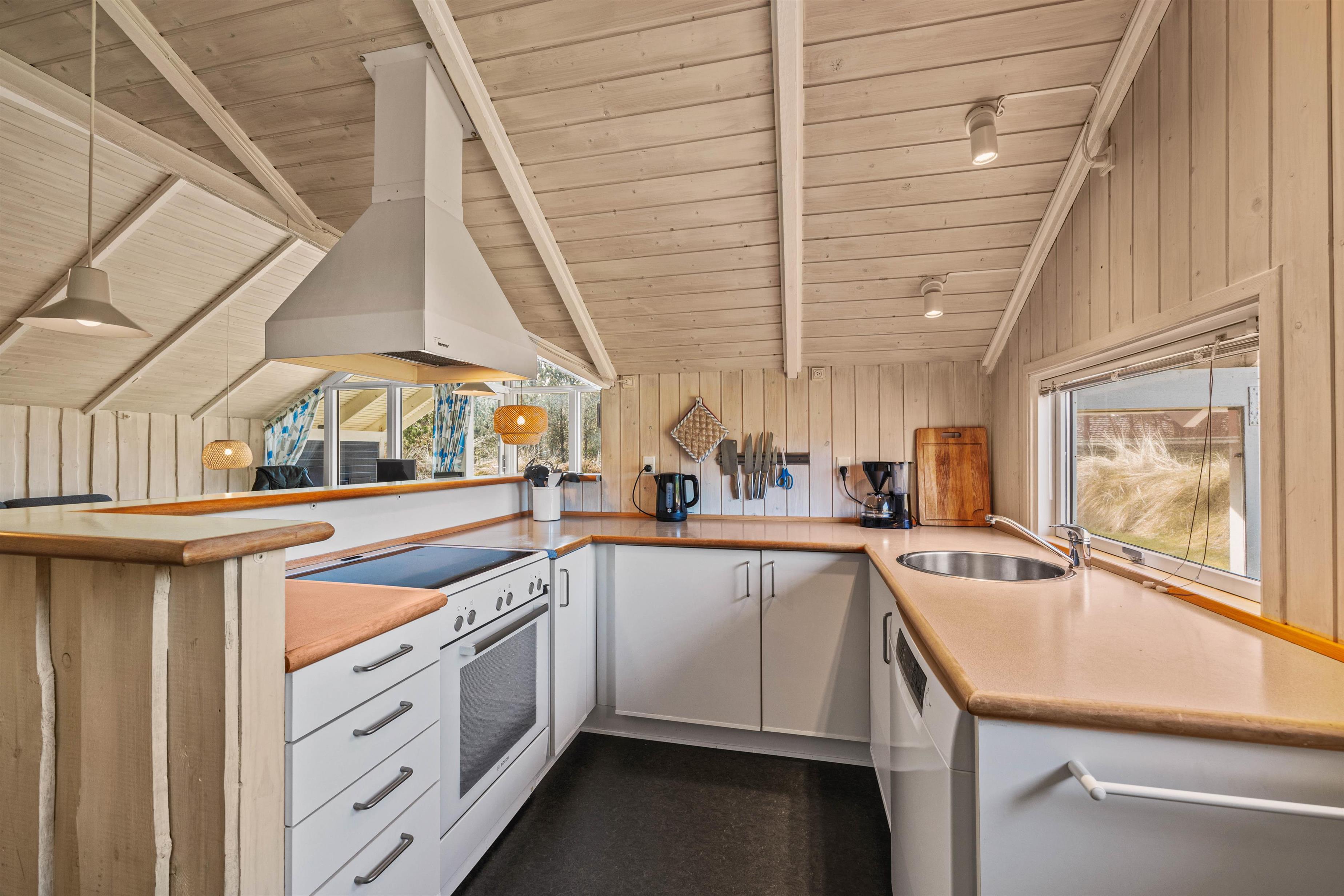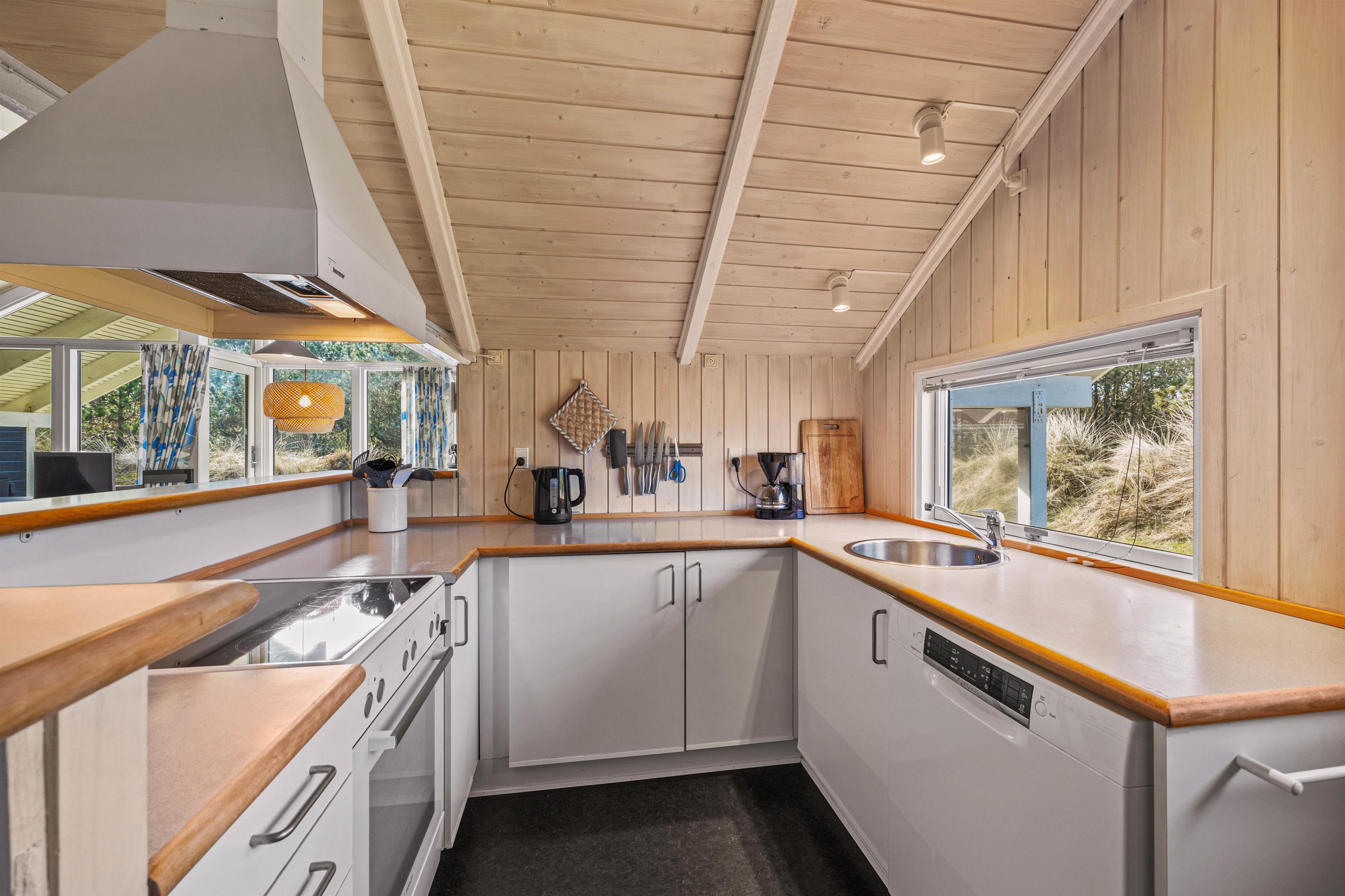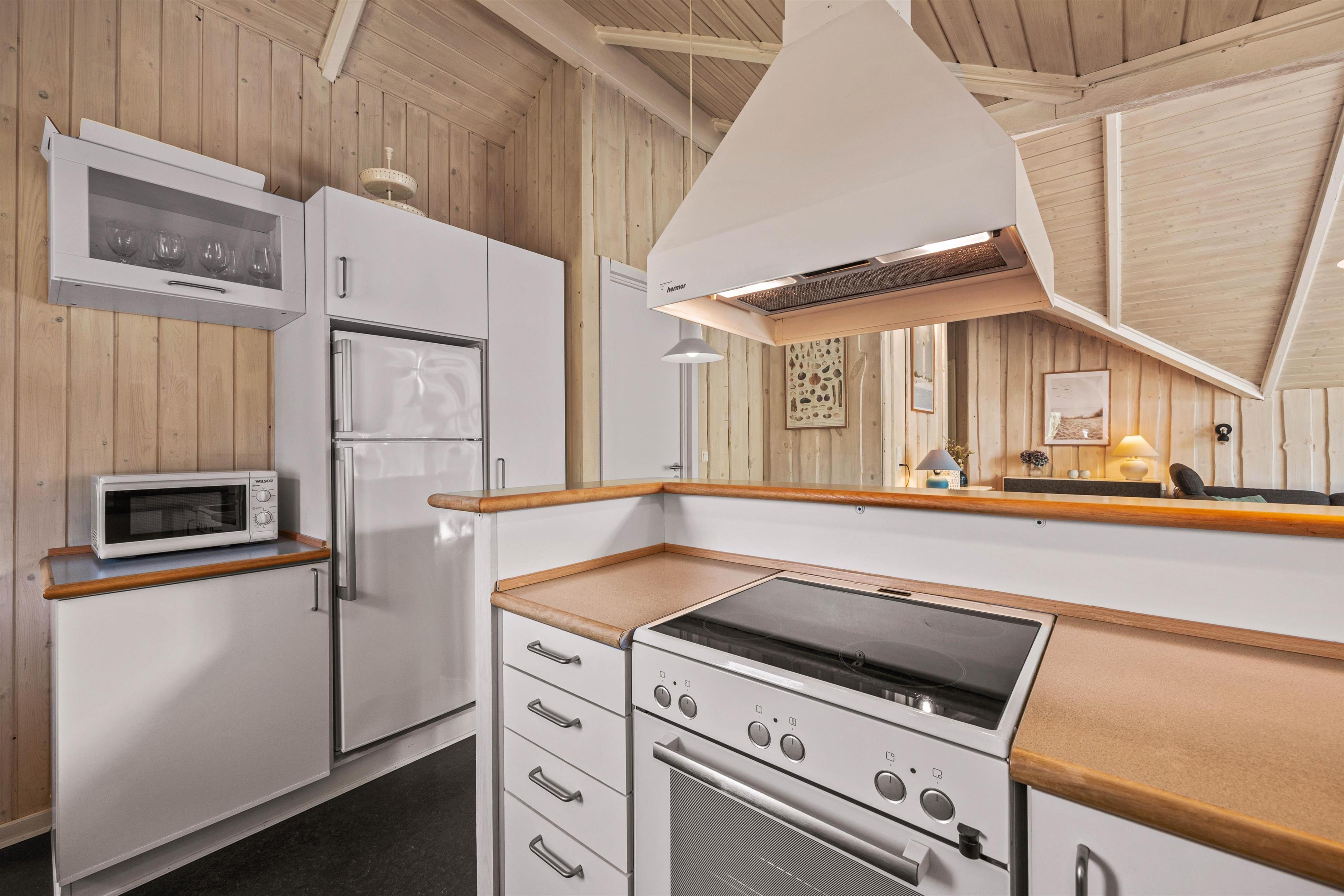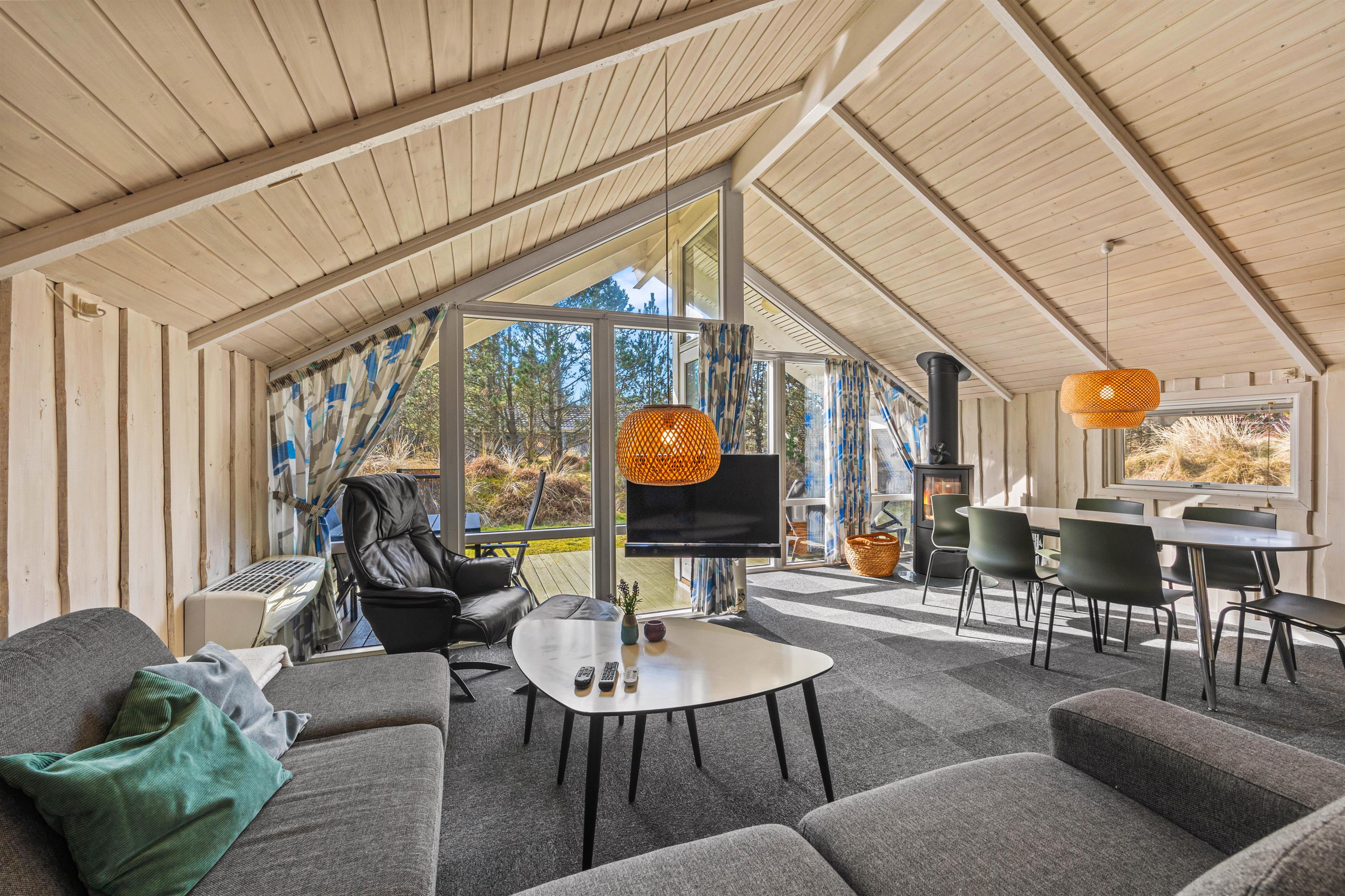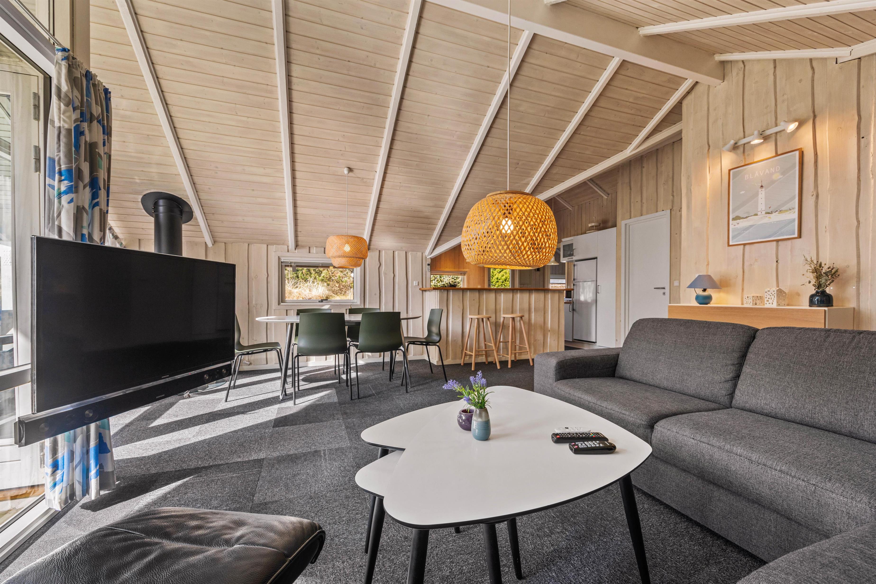Køkken og stue er slået sammen i opholdsrummet, som er husets hjerte. Her vil der helt sikkert blive skabt masser af nye ferieminder med hyggelige kortspil og sene filmaftener, mens brændeovnen knitrer i baggrunden.