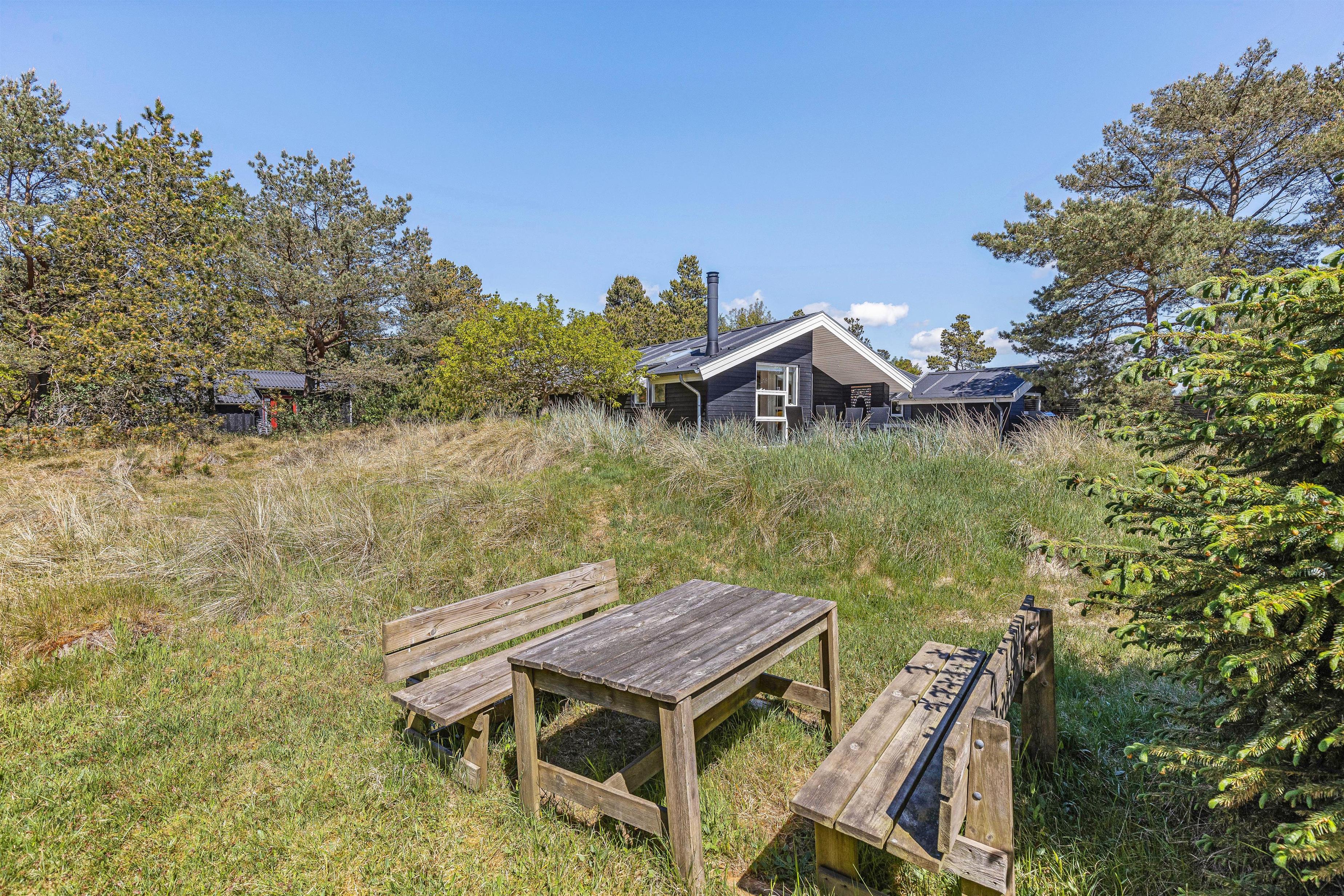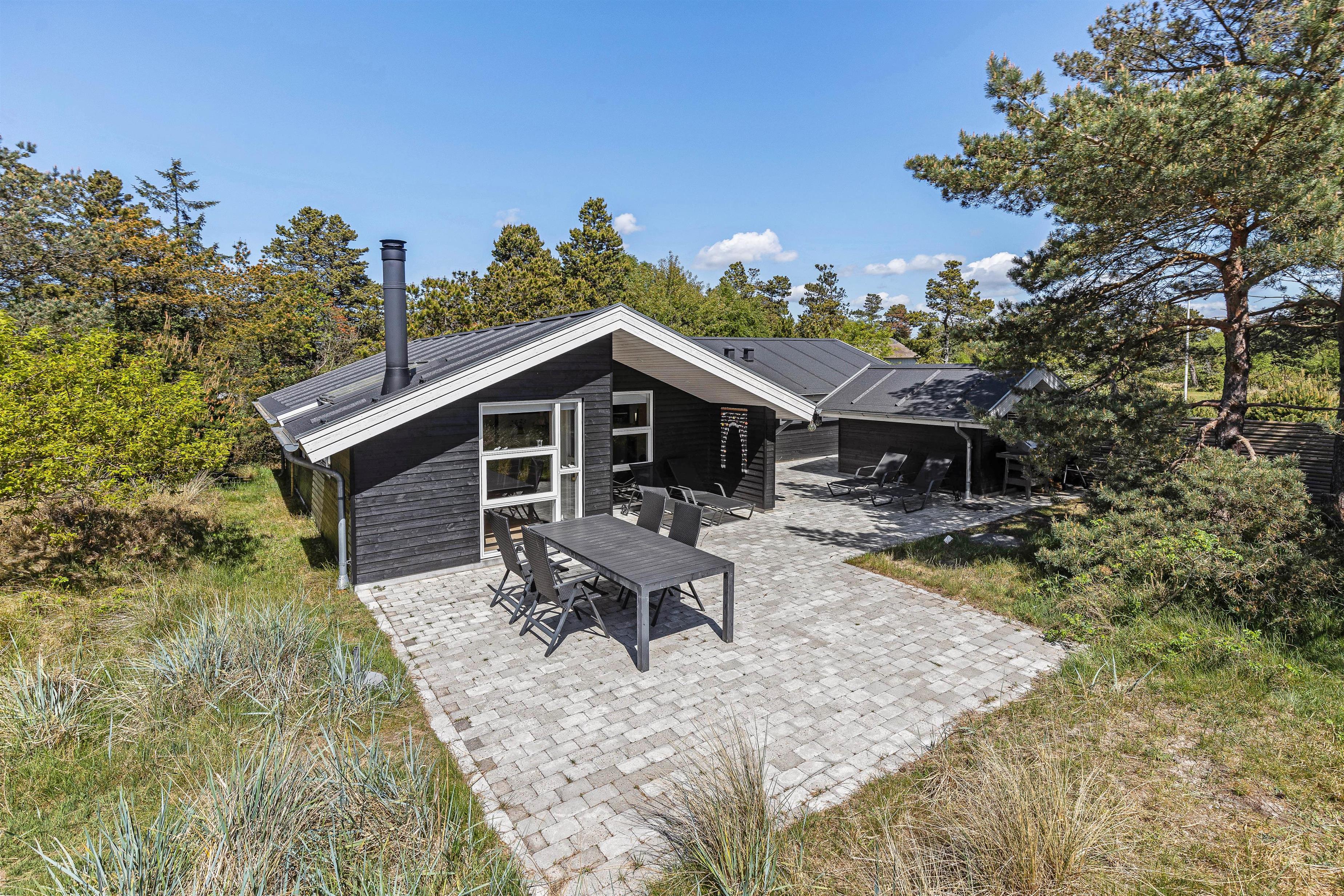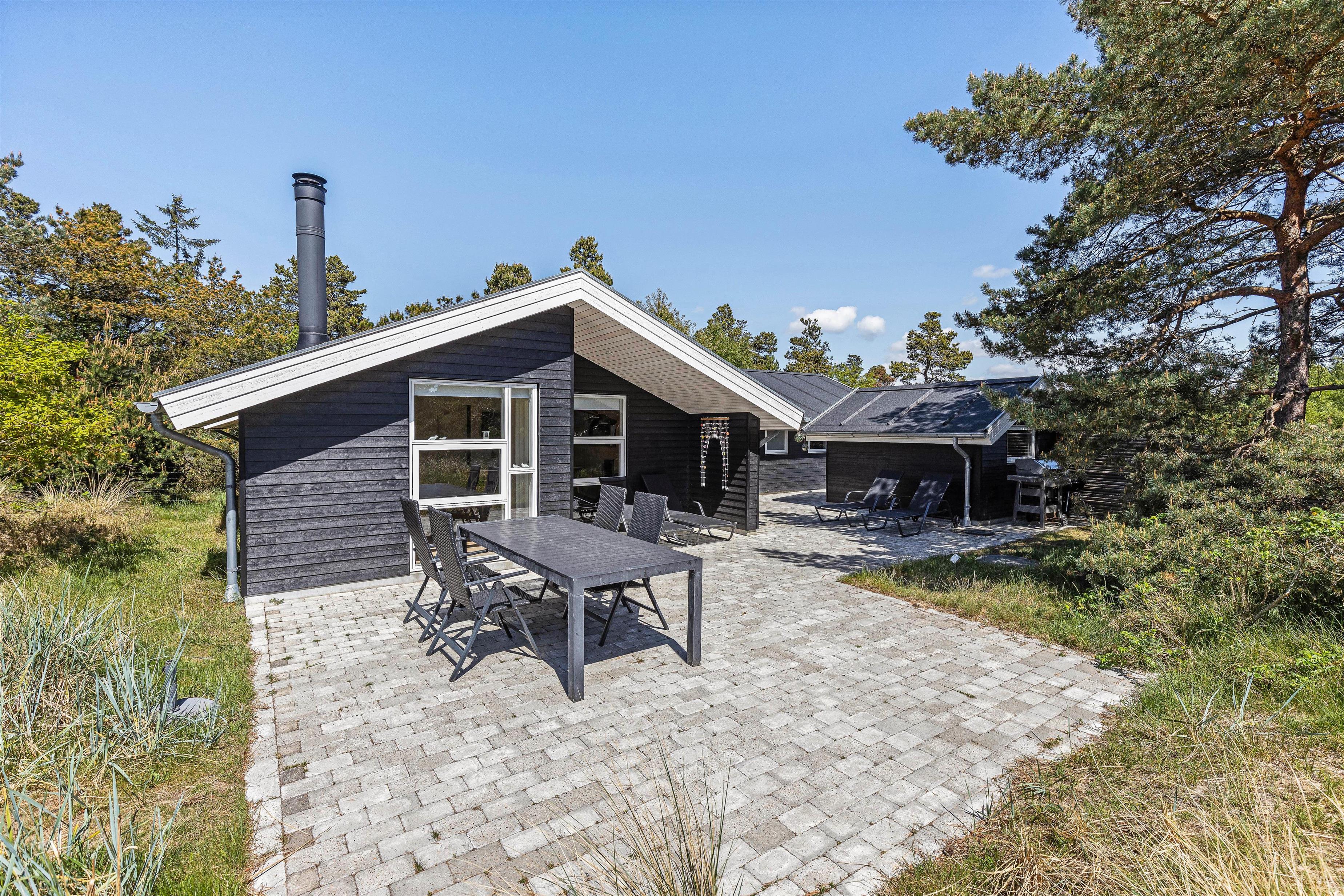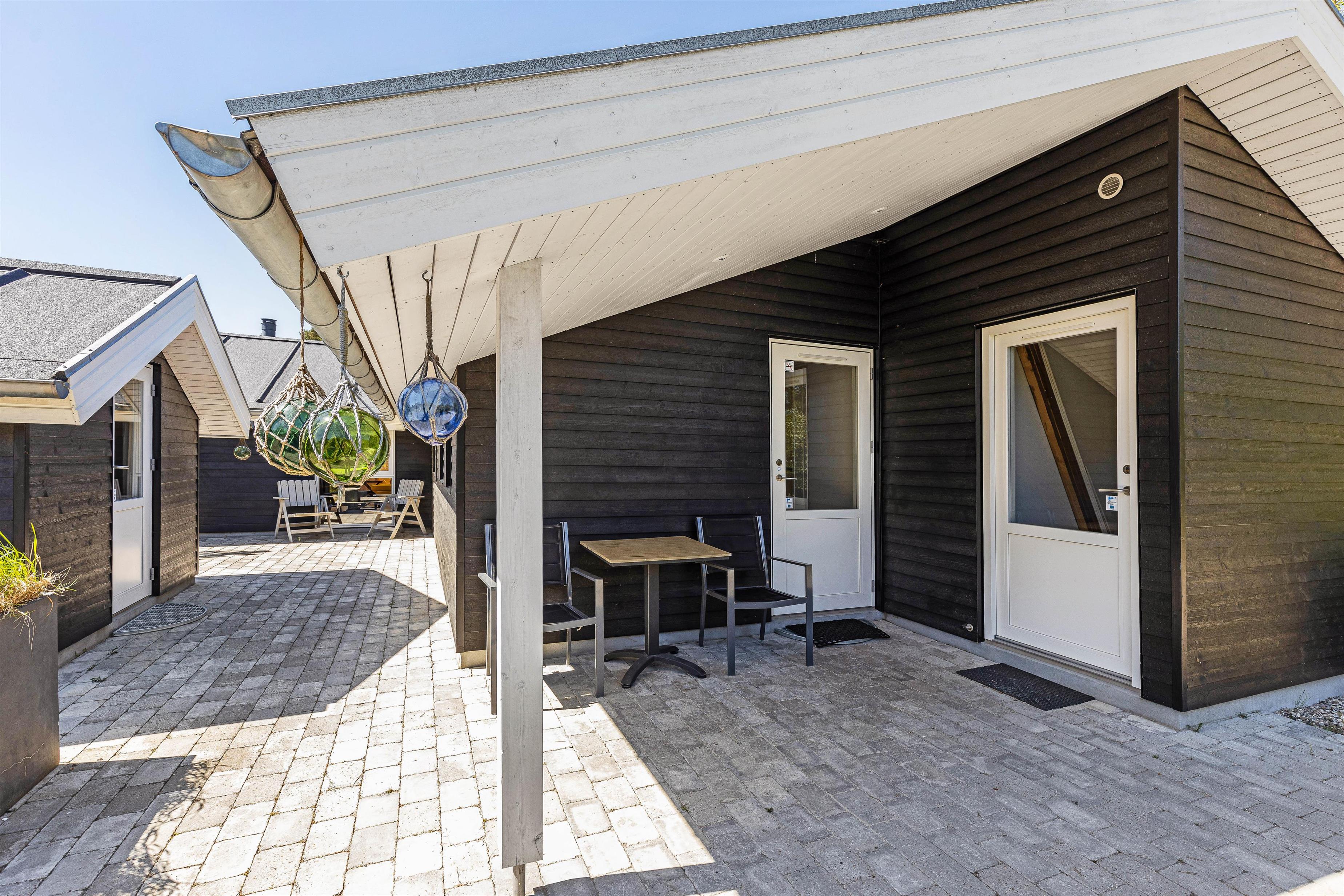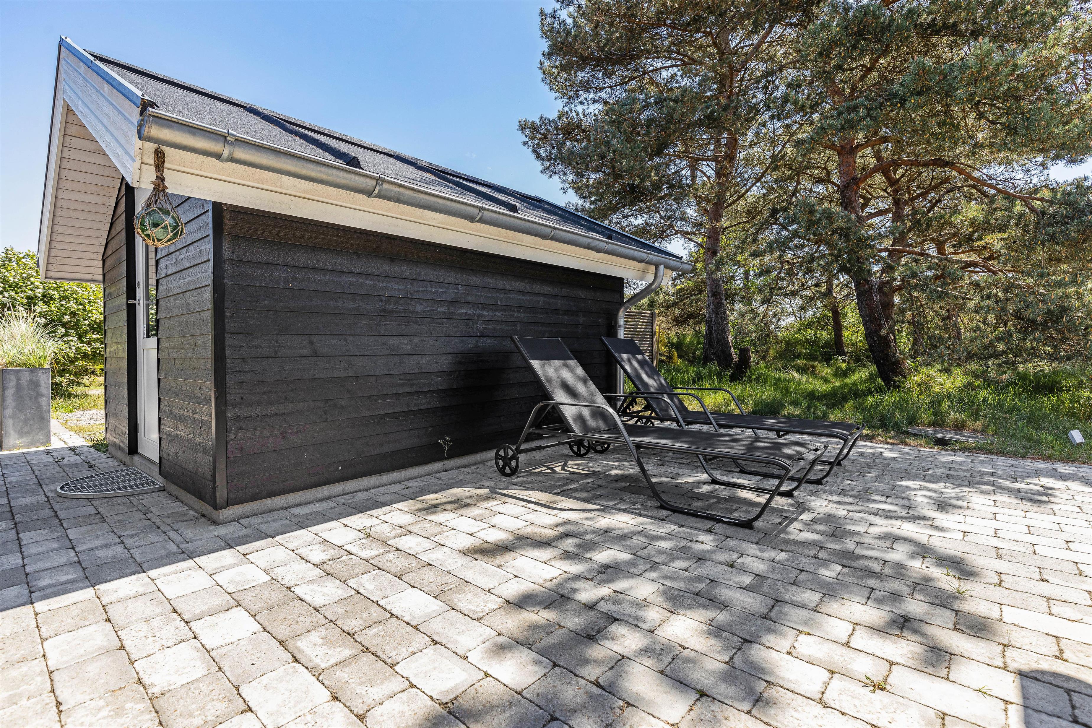 Til sommerhuset hører også en stor, åben terrasse, som I kan nyde feriens solskinsfyldte dage fra. Her står havemøbler og liggestole til jeres rådighed, så I kan finde jer godt til rette i solens stråler. Terrassen har flere overdækkede spots, hvis I skulle trænge til en stund i skyggen.