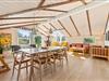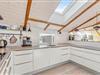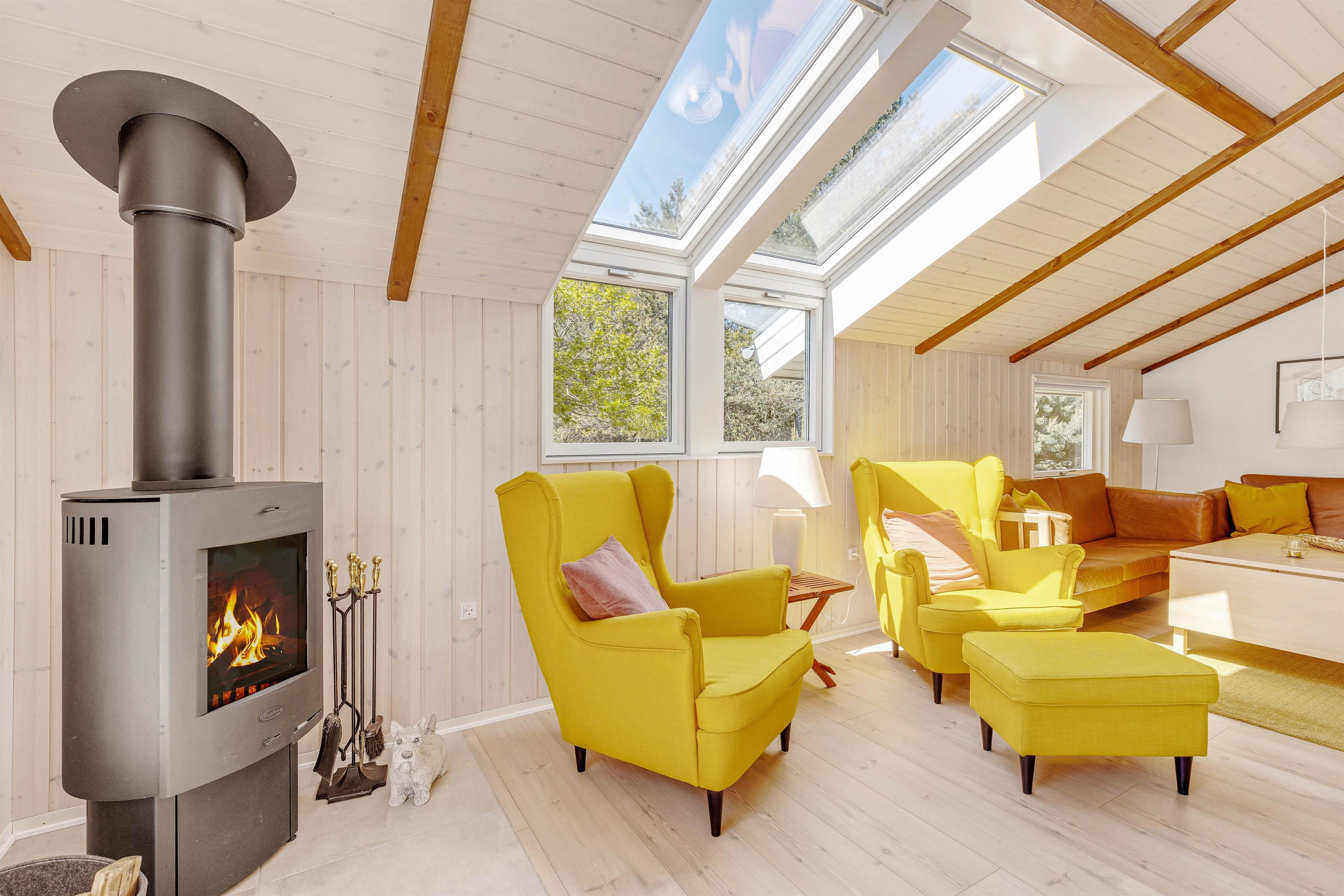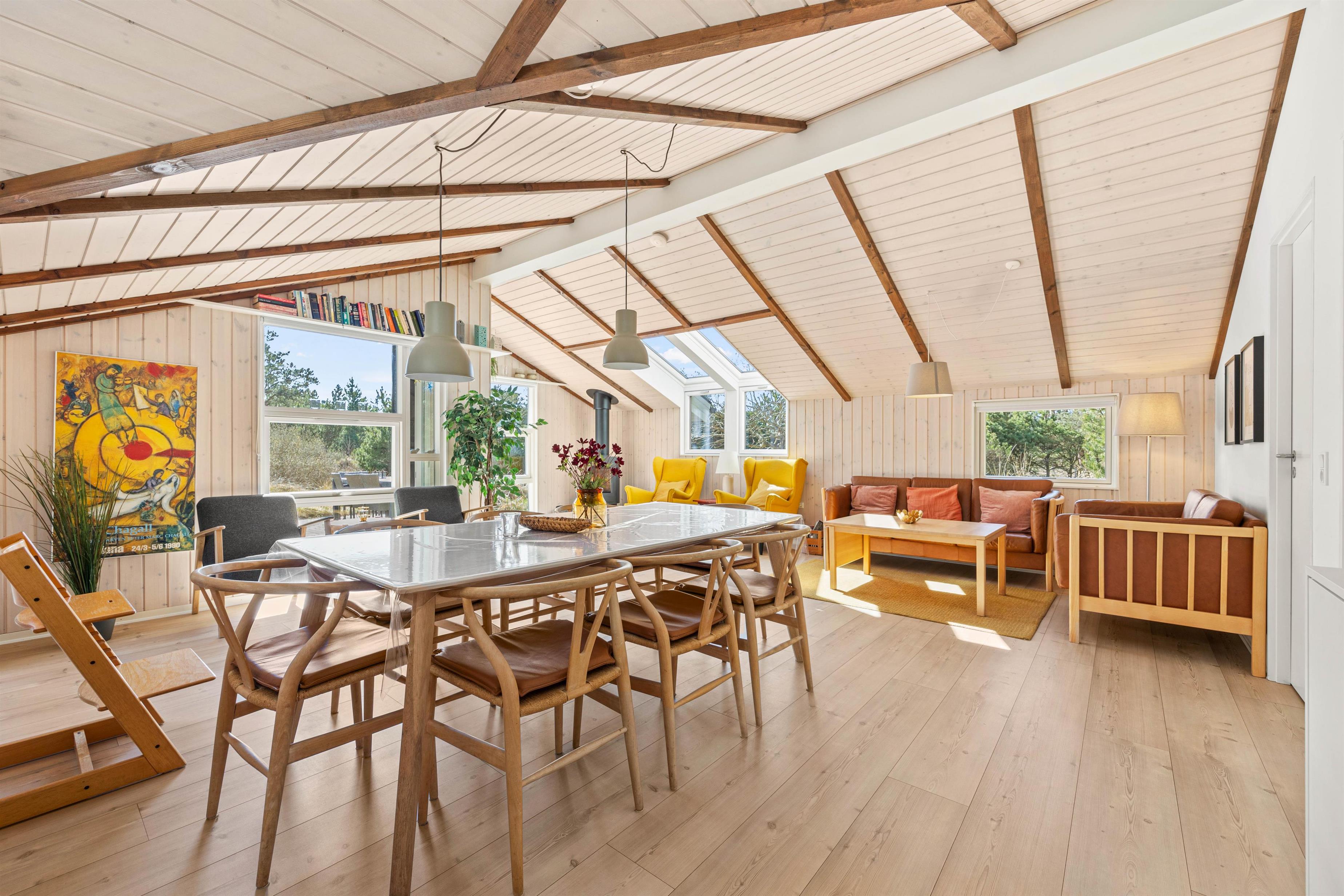 En sommerhusferie involverer selvfølgelig også mange hyggelige stunder sammen, og her er sommerhusets opholdsstue det oplagte sted. Det store rum forener stue, spisestue og køkken, så her har I rig mulighed for at tilbringe mange gode feriestunder sammen. Trælofterne med synlige bjælker og brændeovnen lader jer mærke den klassiske sommerhusstemning – og brændeovnen sørger selvfølgelig for god varme. Feriehuset er også udstyret med energibesparende varmepumper og allrummet også med gulvvarme.