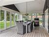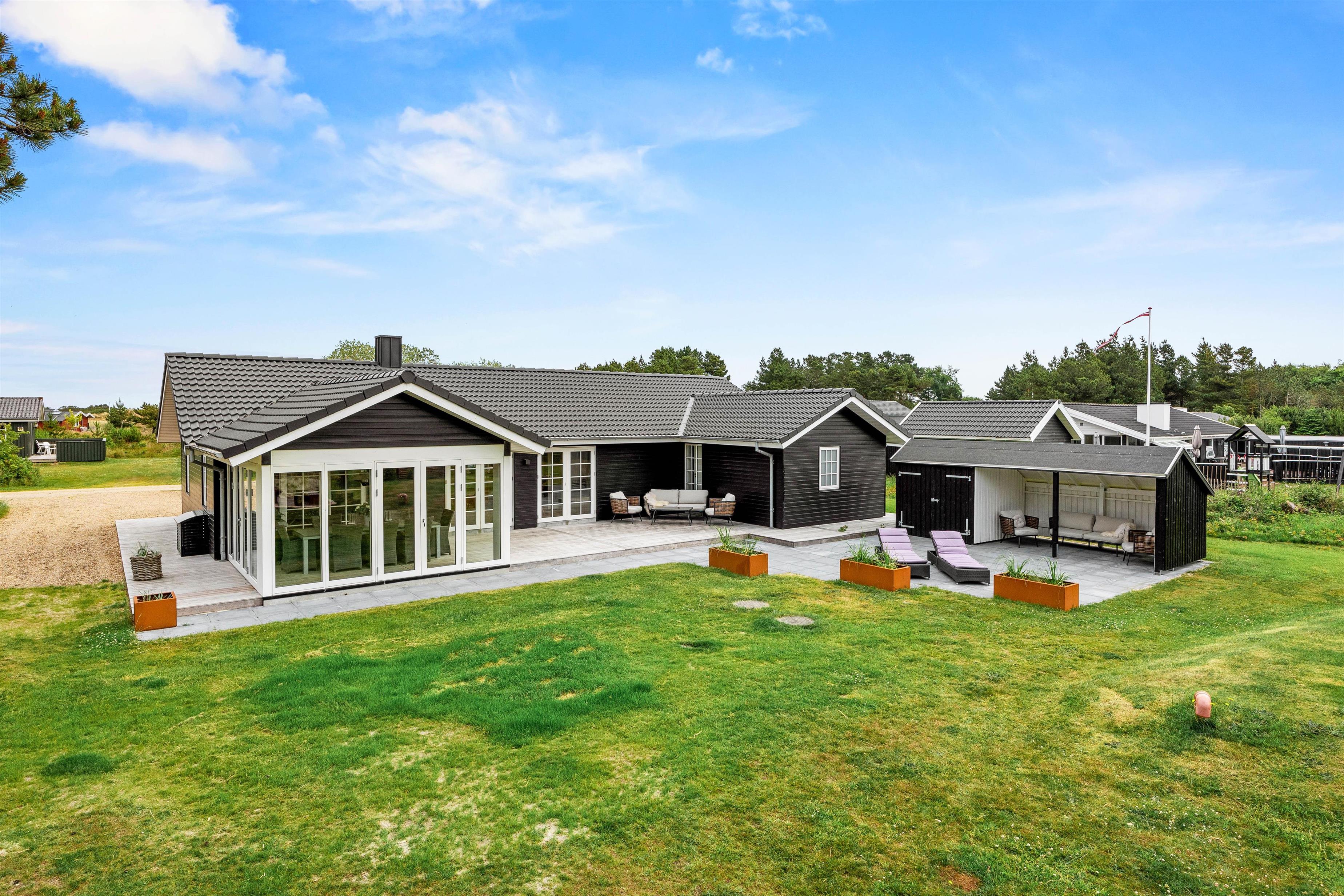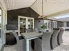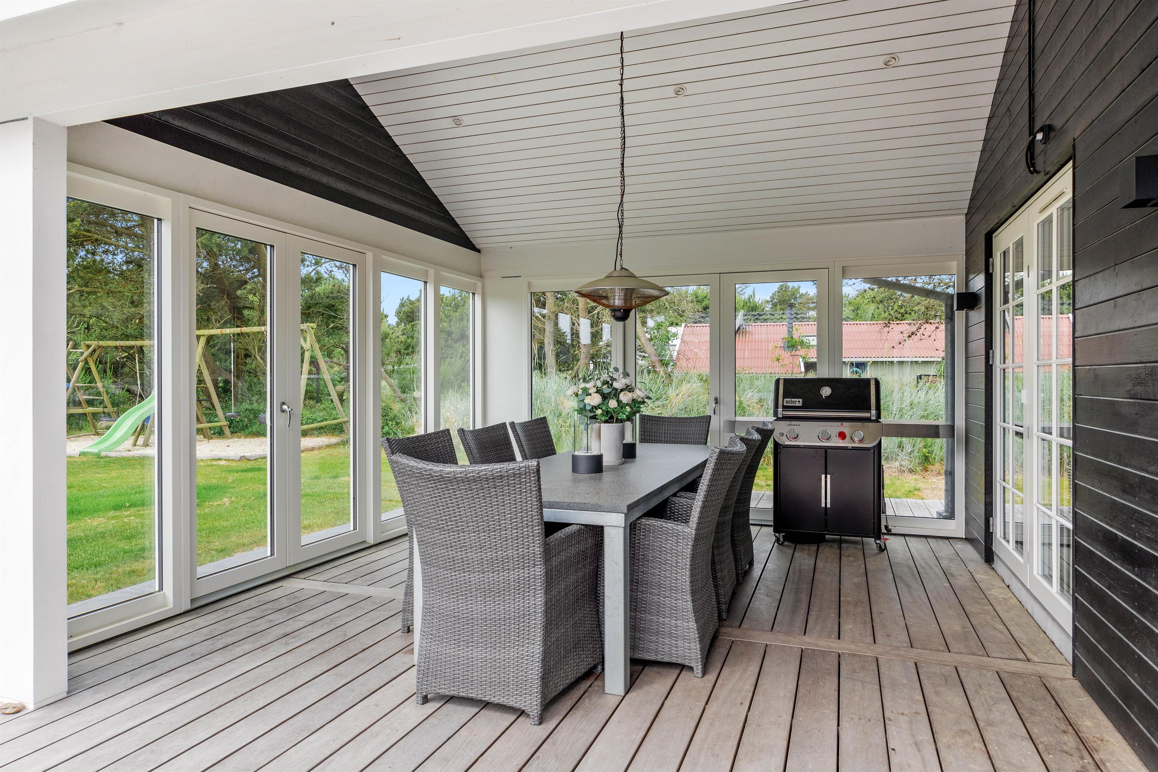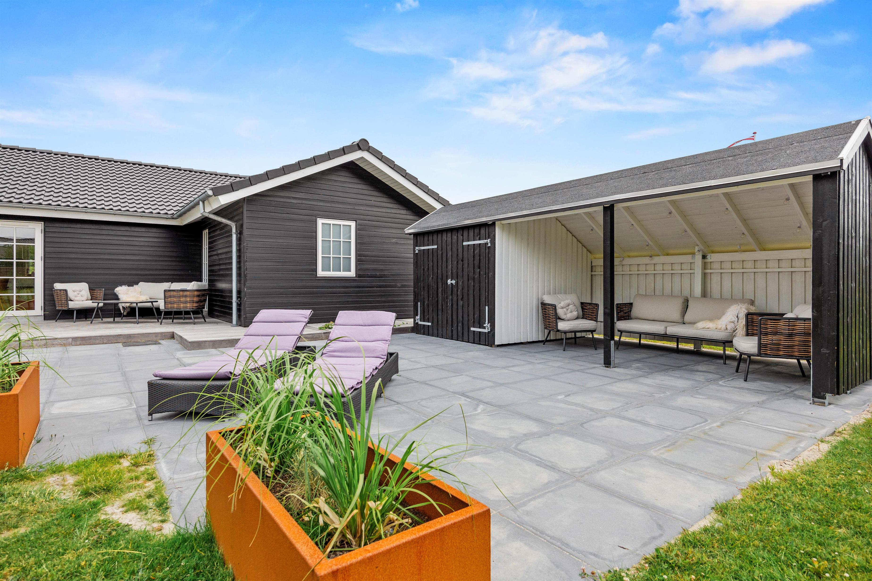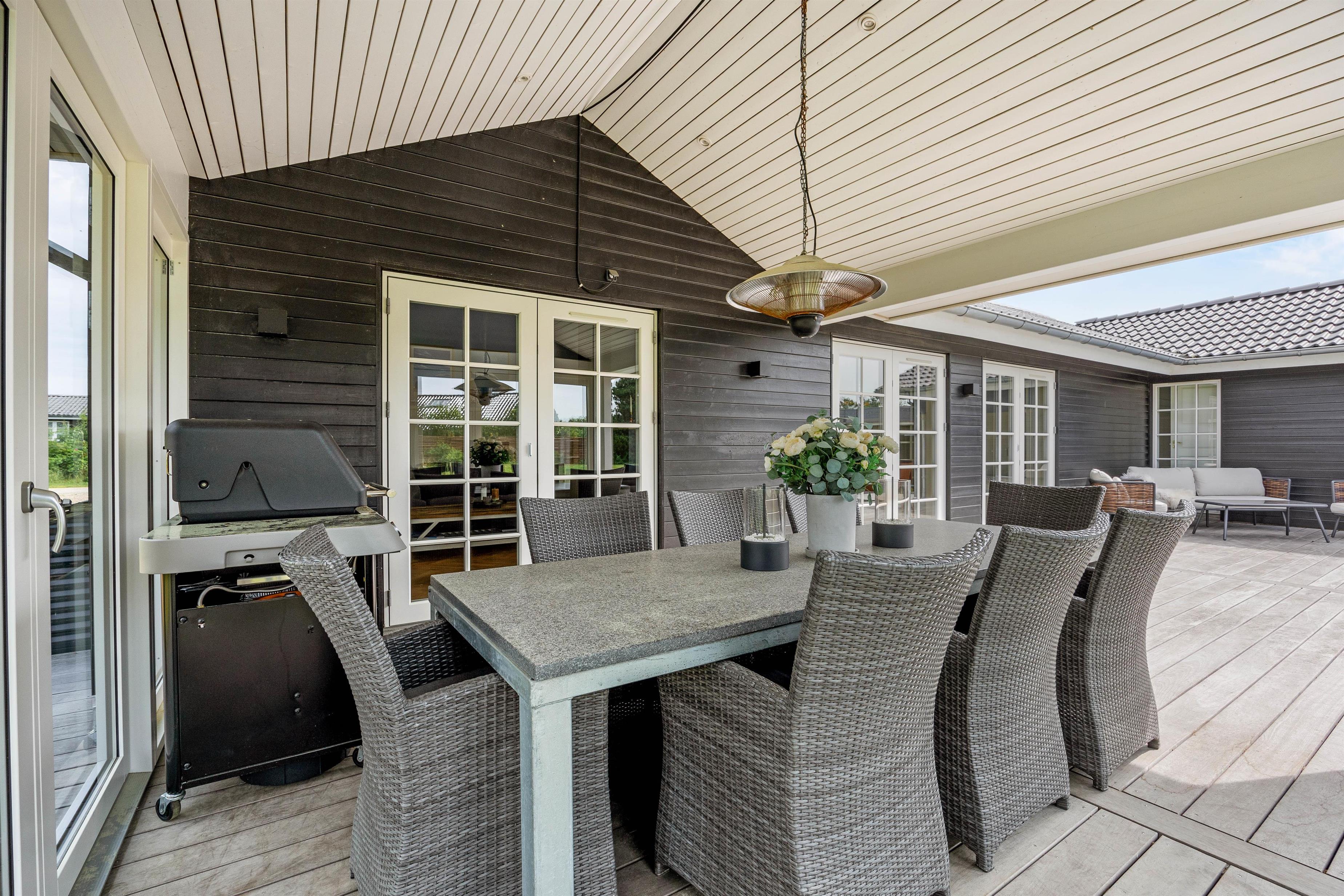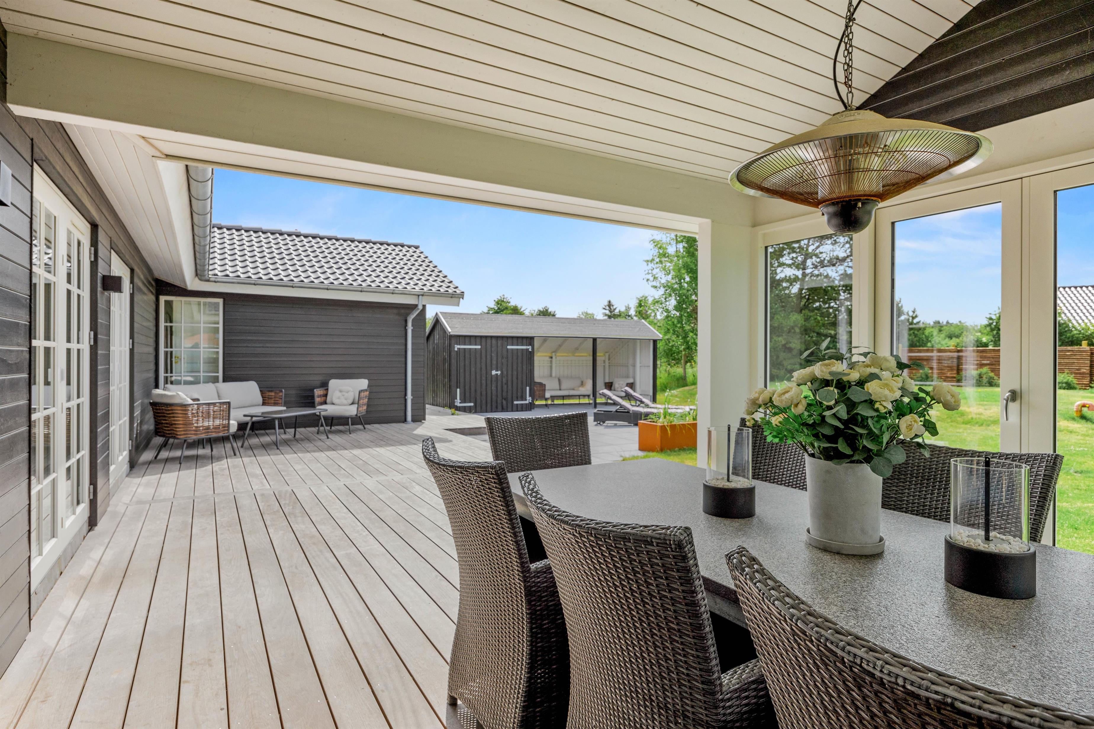 Fra opholdsstuen er der flere udgange til den store træterrasse, hvor I både kan slikke sol og samles om aftenen til hygge ved gasgrillen og dermed afrunde en dejlig feriedag. Der er i 2025 etableret ca. 60 m2 terrasse med et havehus og et overdækket lounge-område med komfortable havemøbler, og den overdækkede terrasse er afskærmet med glas på syd- og vestsiden, så der er læ for vinden. Skulle I have brug for ekstra varme, kan I blot tænde for varmelampen.