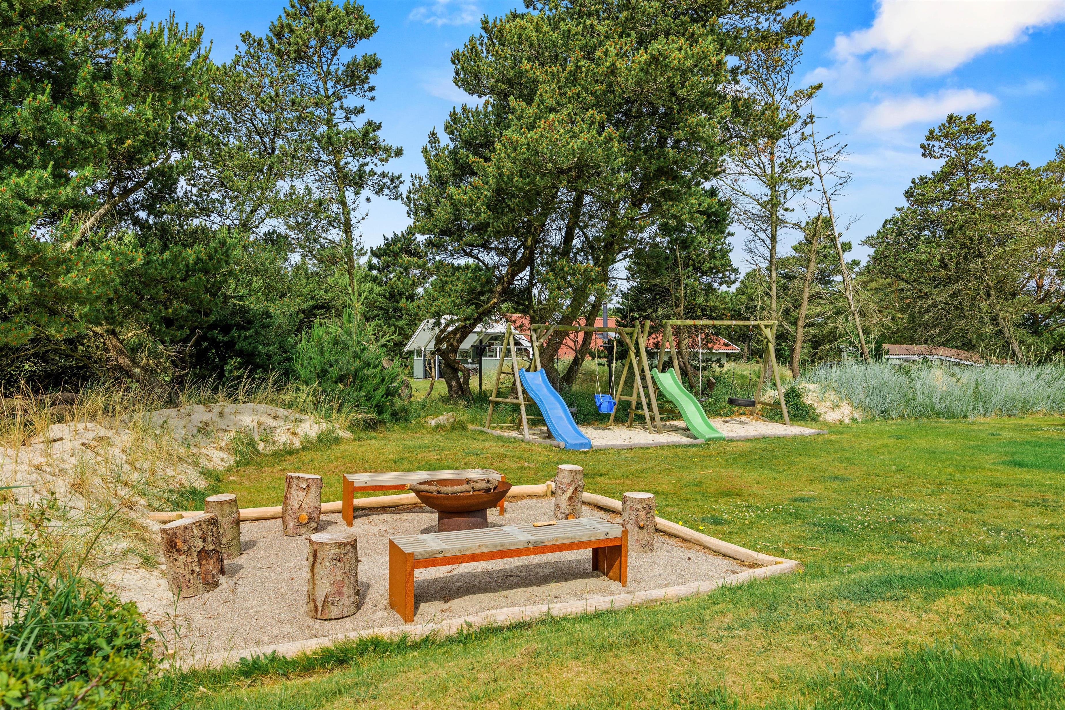 Der er også masser af plads for børn på den 1500 m² store naturgrund med gynger og sandkasse til de yngste gæster, og når I har lyst til hygge med bål og skumfiduser kan I samles ved den hyggelige bålplads bagerst i haven.