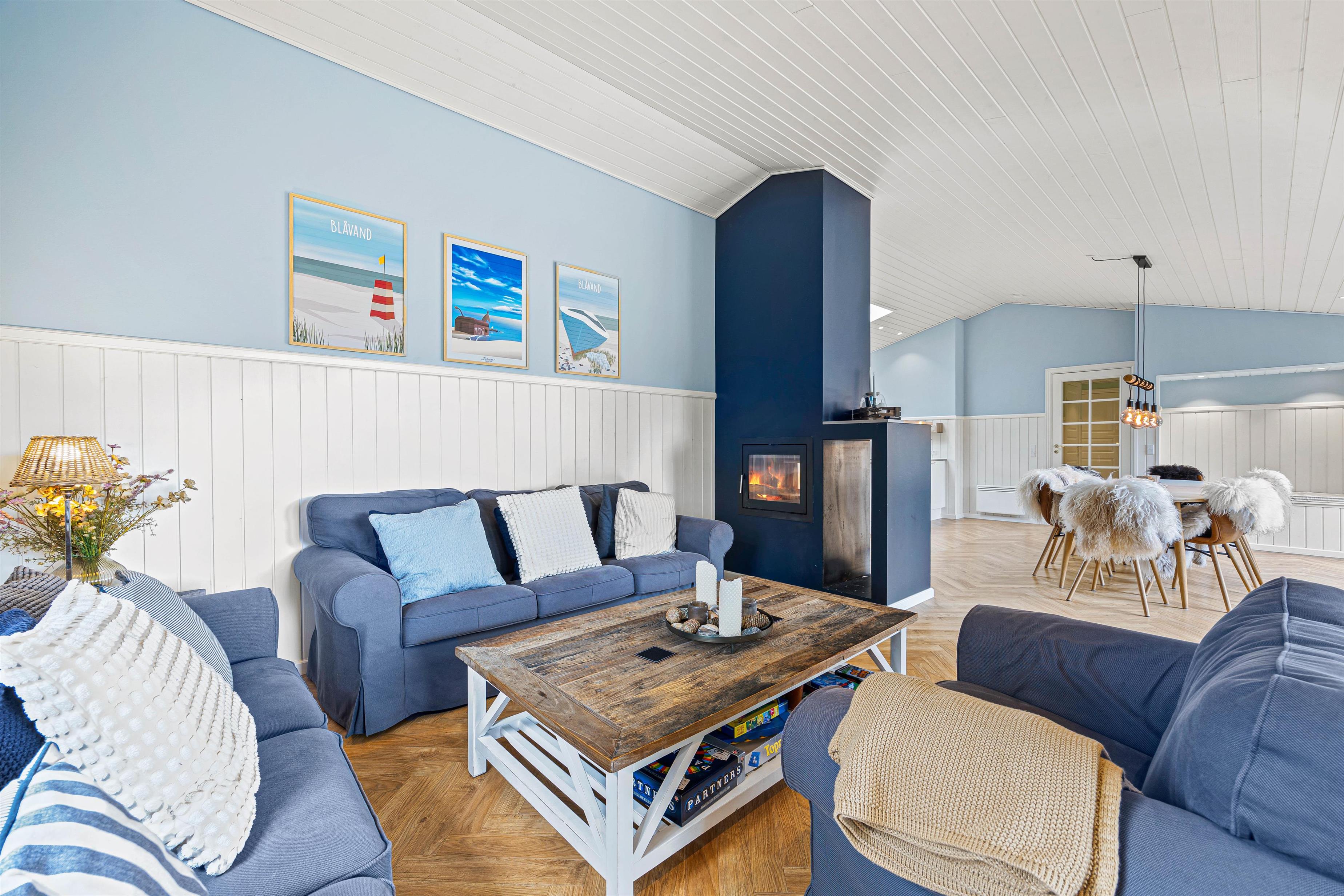 Om aftenen kan I hygge jer i de behagelige sofaer, drikke et glas vin eller se en film sammen, mens ilden knitrer i brændeovnen og spreder en hyggelig stemning. Om nødvendigt kan I tænde for den energibesparende varmepumpe, som hurtigt sørger for behagelige temperaturer i feriehuset. Skulle I have lyst til lidt aktivitet, kan I tage jer en lille dyst i bordfodbold, bob eller på shuffle-boardet.