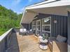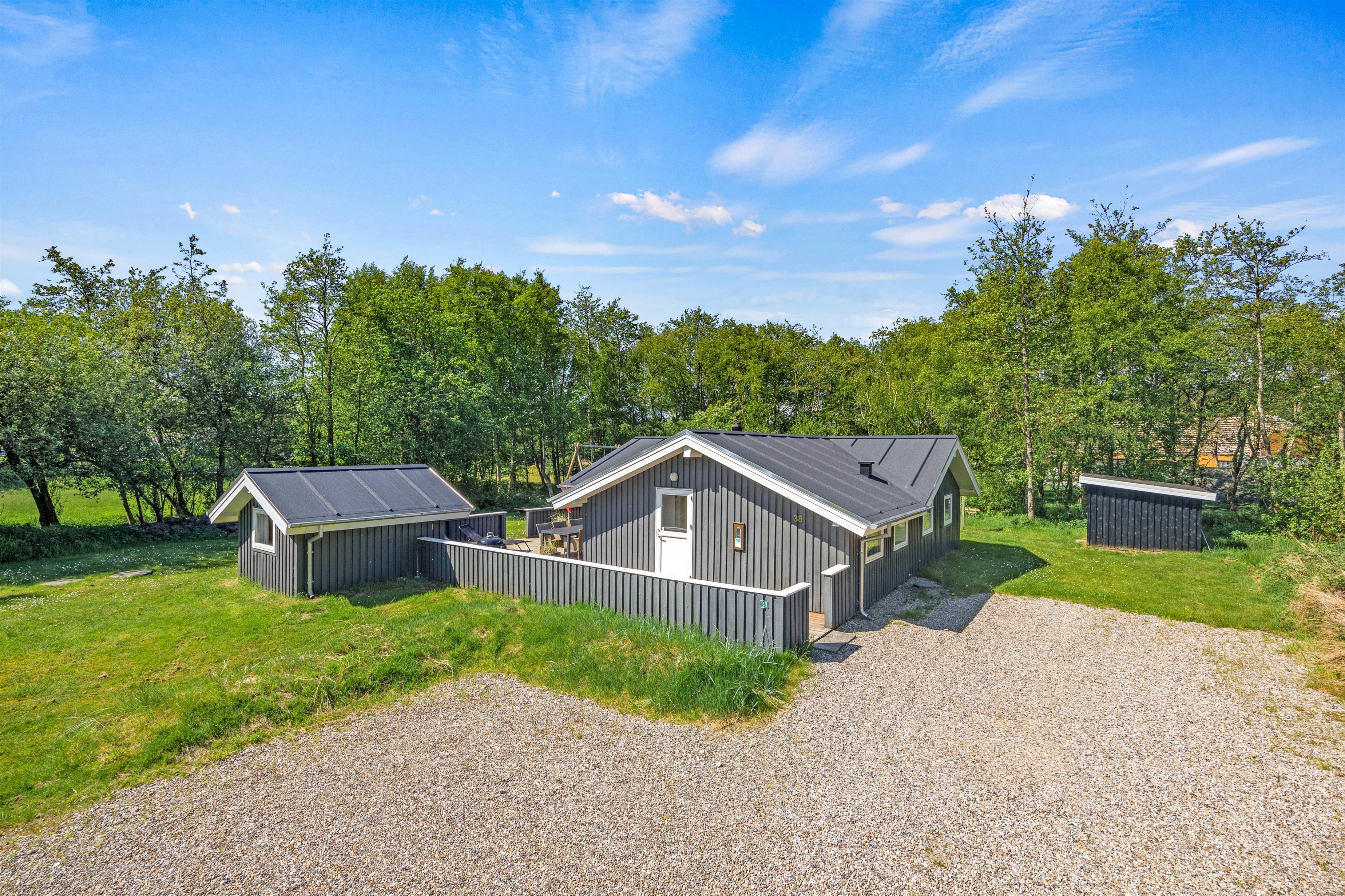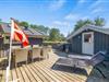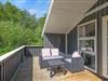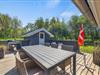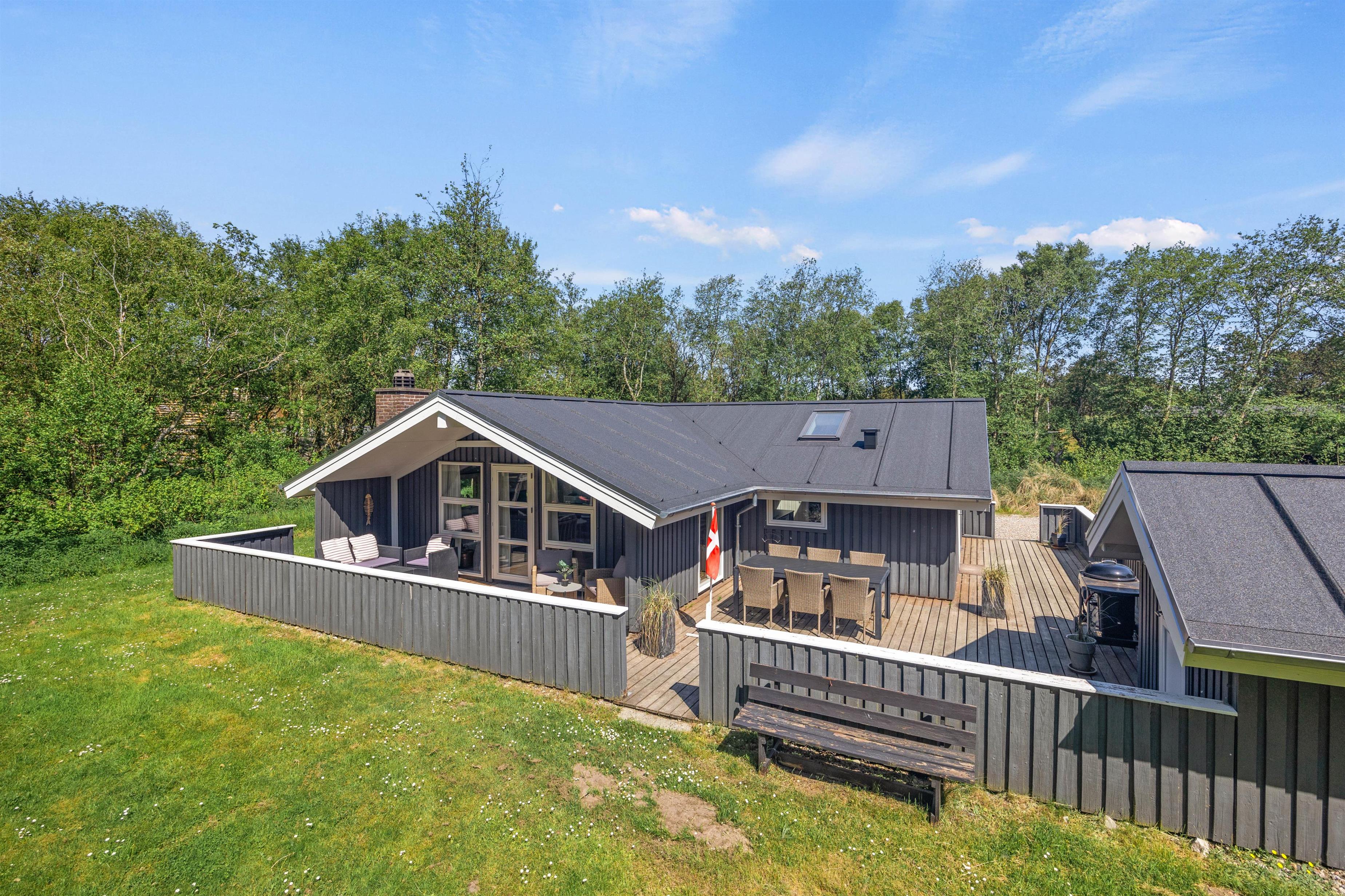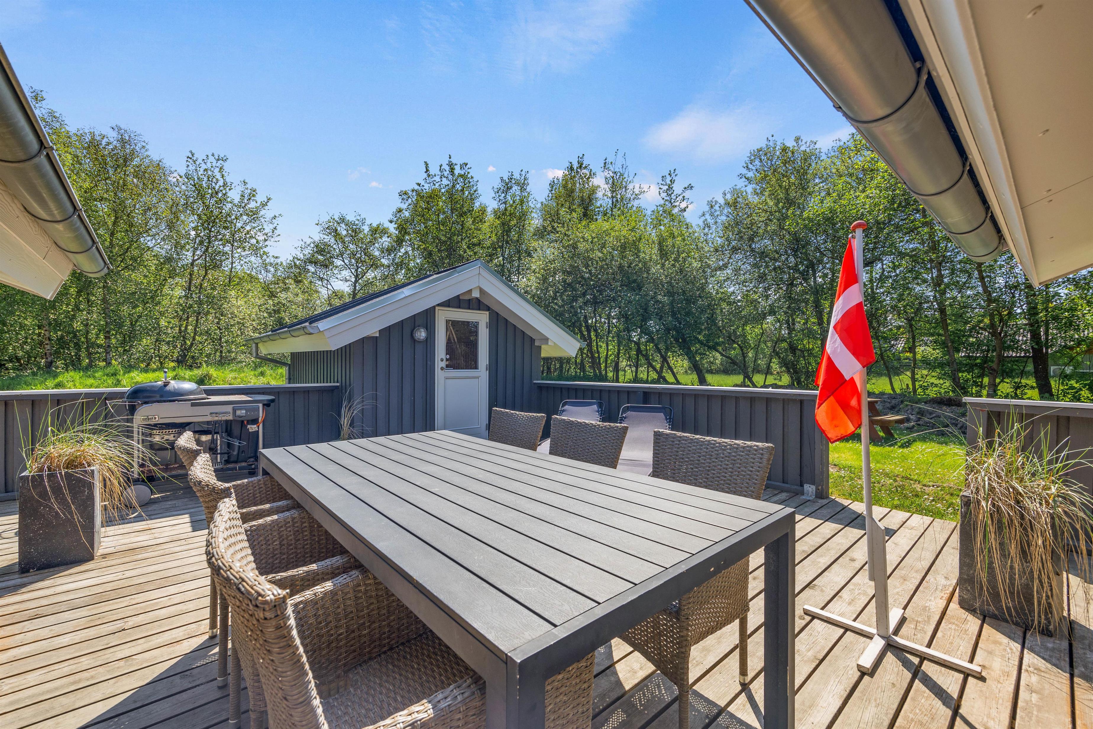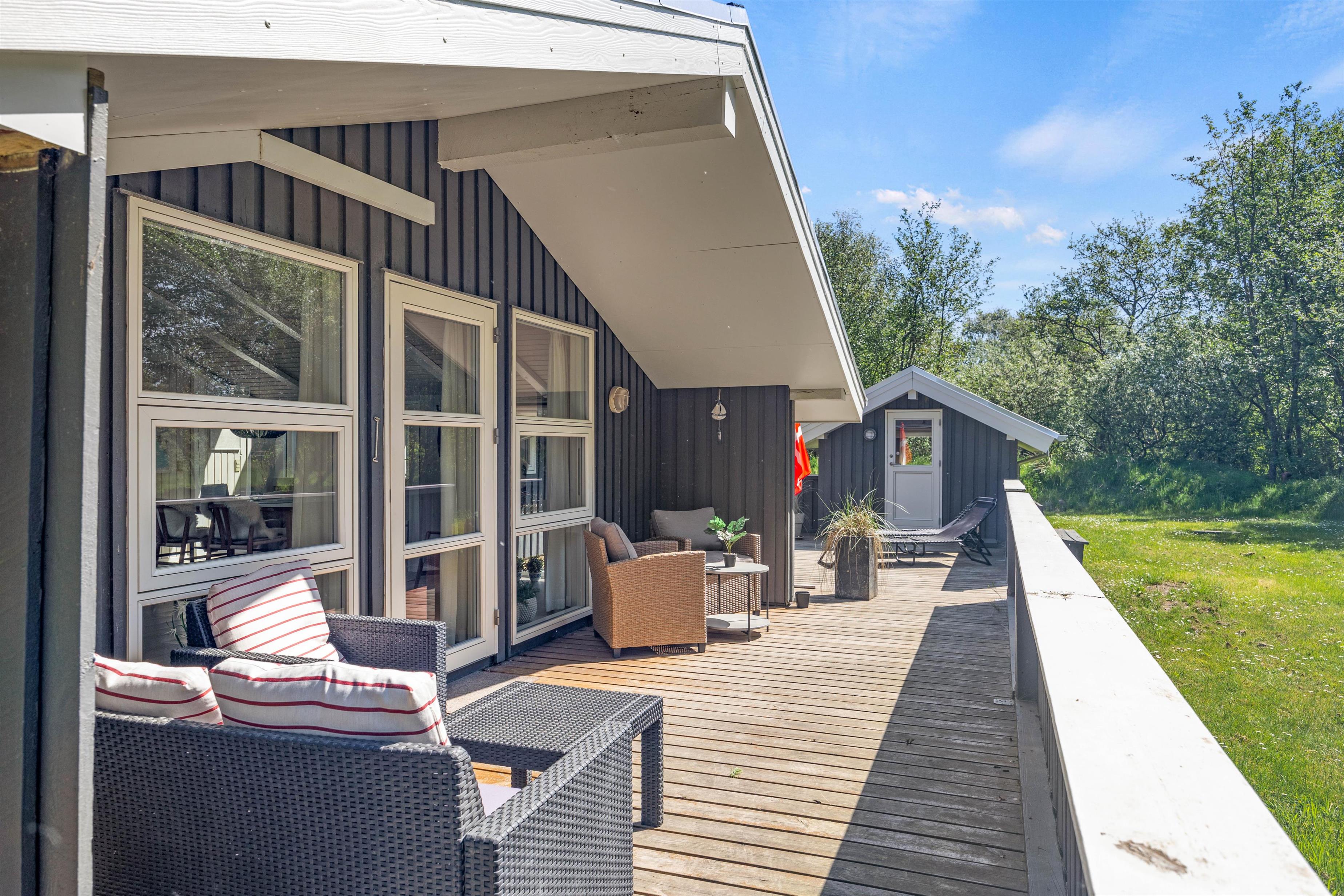 Fra opholdsrummet træder I ud på sommerhusets fine afskærmede terrasse. Terrassen har både en overdækket og en åben del, og ligegyldigt om I er til sol eller skygge, finder I det perfekte spot her. Hele grunden er omgivet af høje træer, så I får en fuldstændig ugeneret beliggenhed med god ro til at nyde jeres fridage – måske endda akkompagneret af lidt fuglesang fra trætoppene.