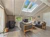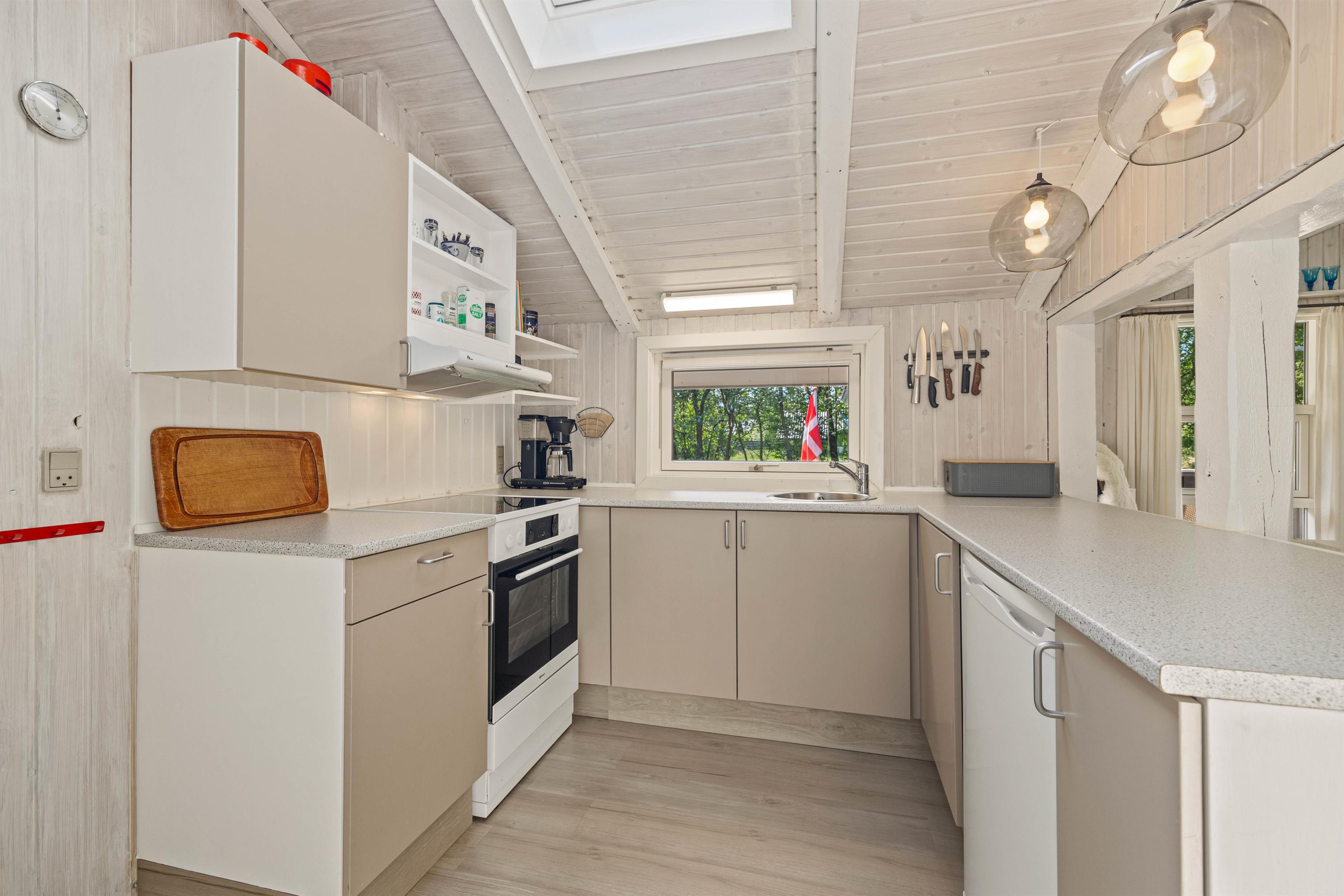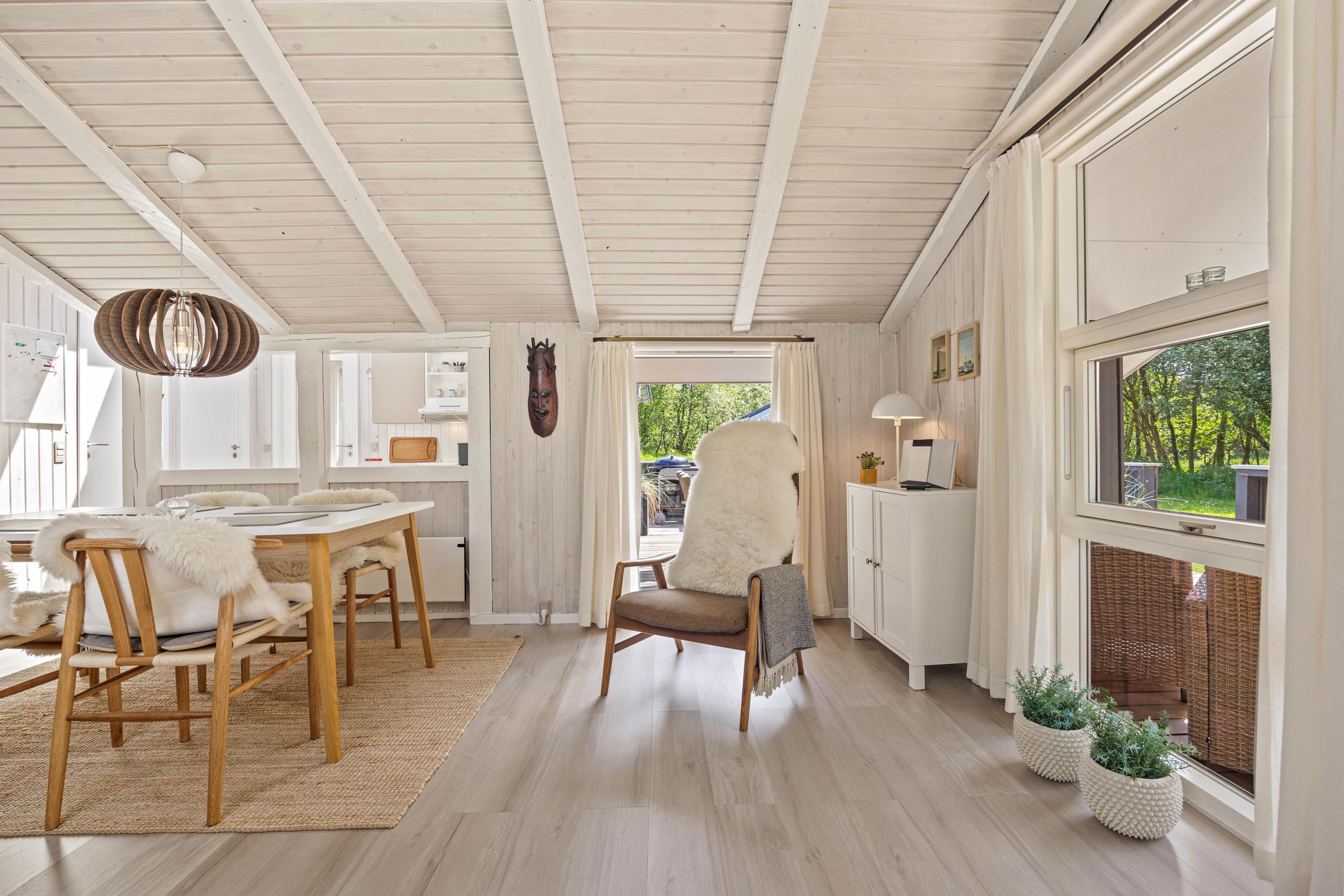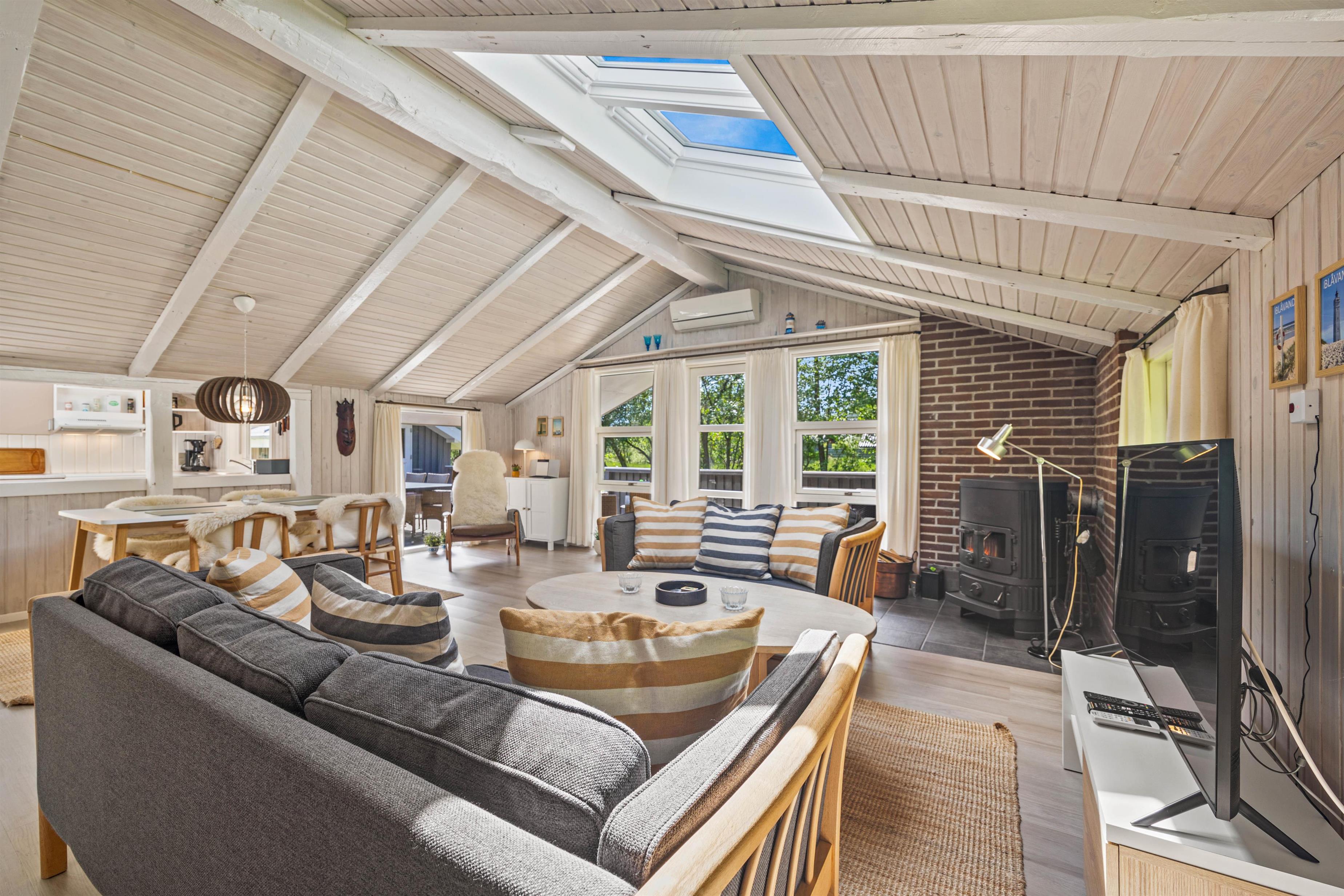 Sommerhusets hjerte er opholdsrummet. Her ligger køkkenet i åben forbindelse med stue og spiseafdeling, og der er på den måde skabt et samlet fællesrum, hvor I rigtigt kan sætte samværet i centrum og nyde feriedagene med hinanden. I stuehjørnet står brændeovnen, som altid er en ægte hyggespreder. Med en hurtig internetforbindelse og en Chromecast i stuen har I desuden alt, hvad I skal bruge for at arrangere en hyggelig filmaften i stuen.