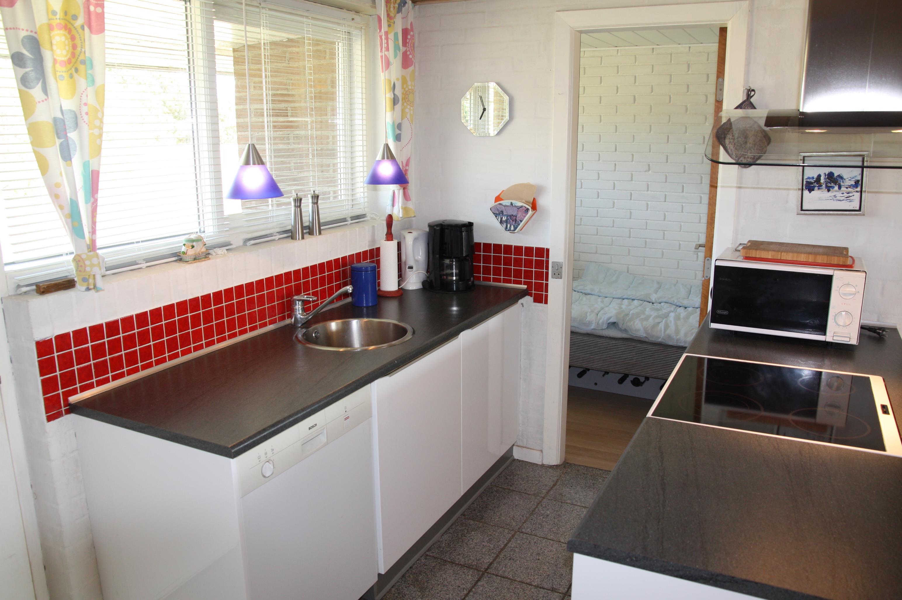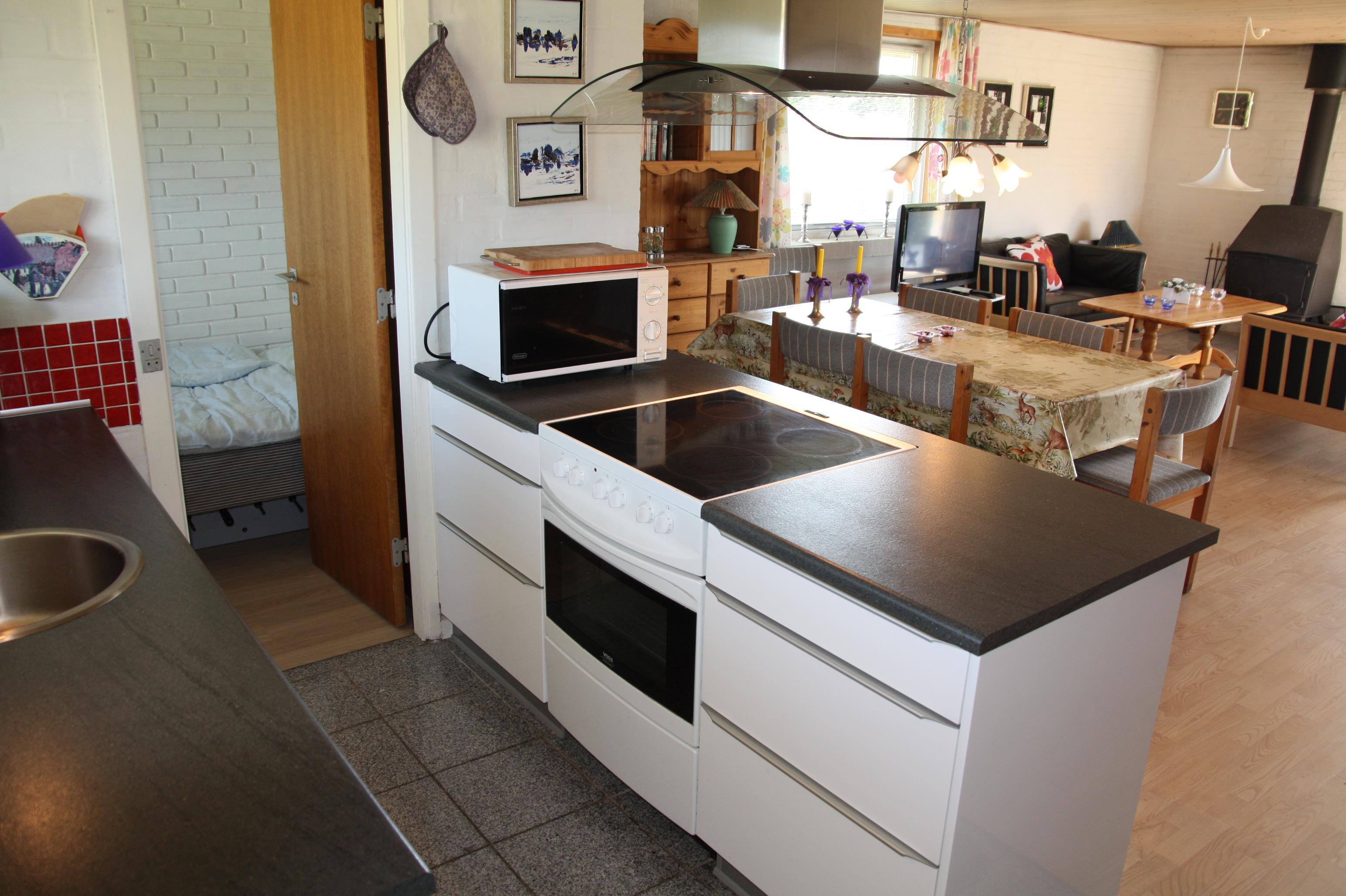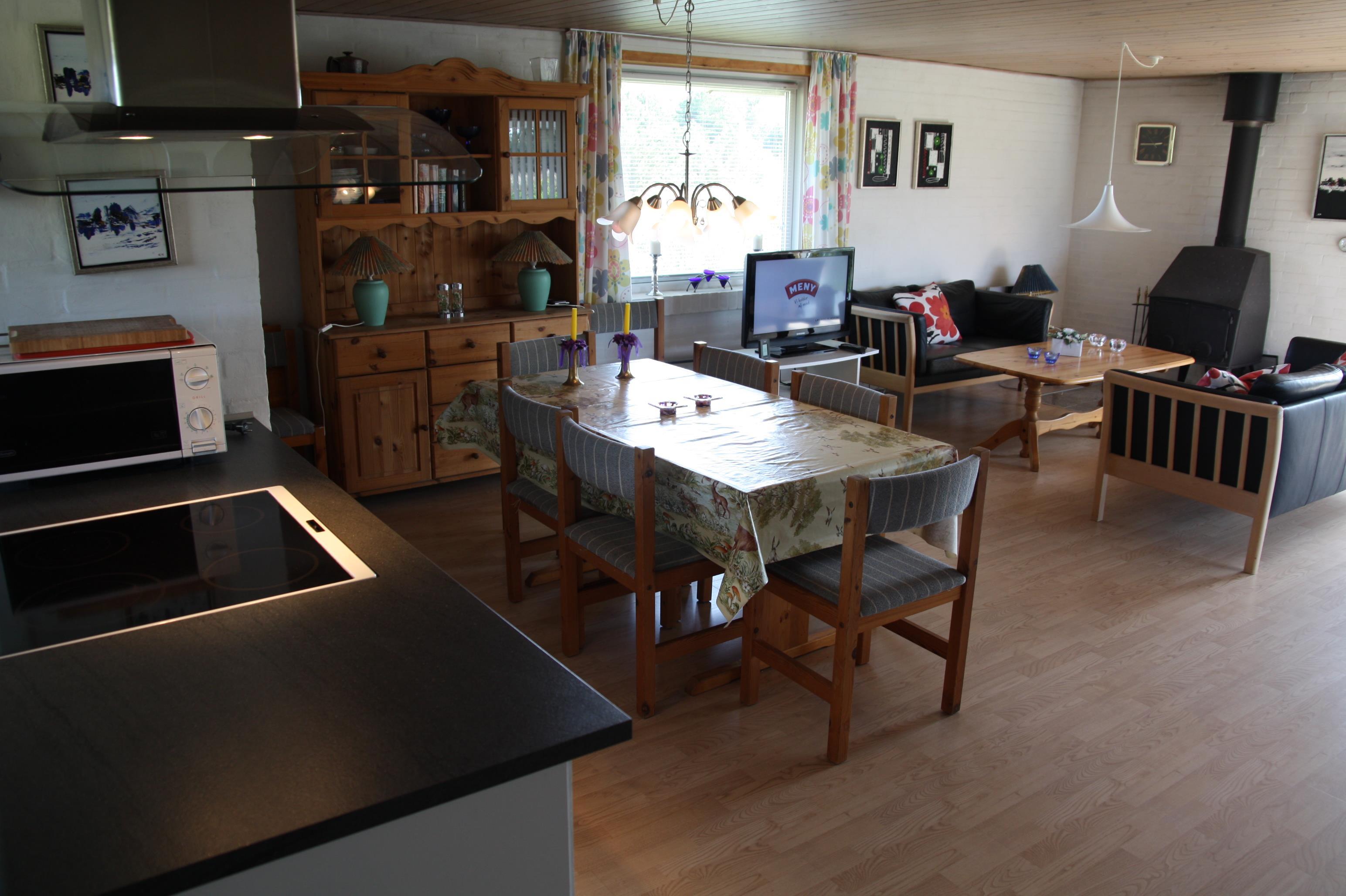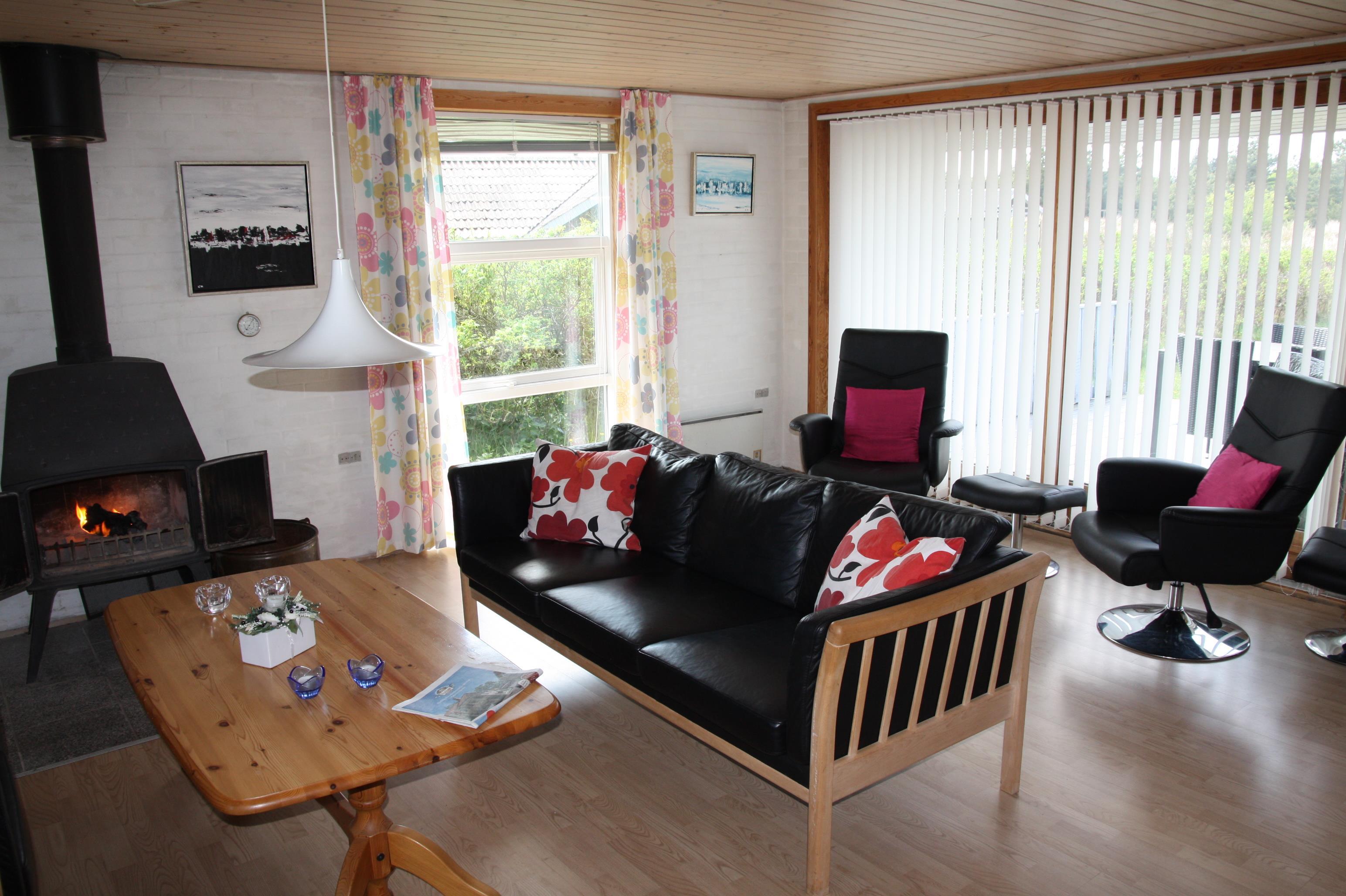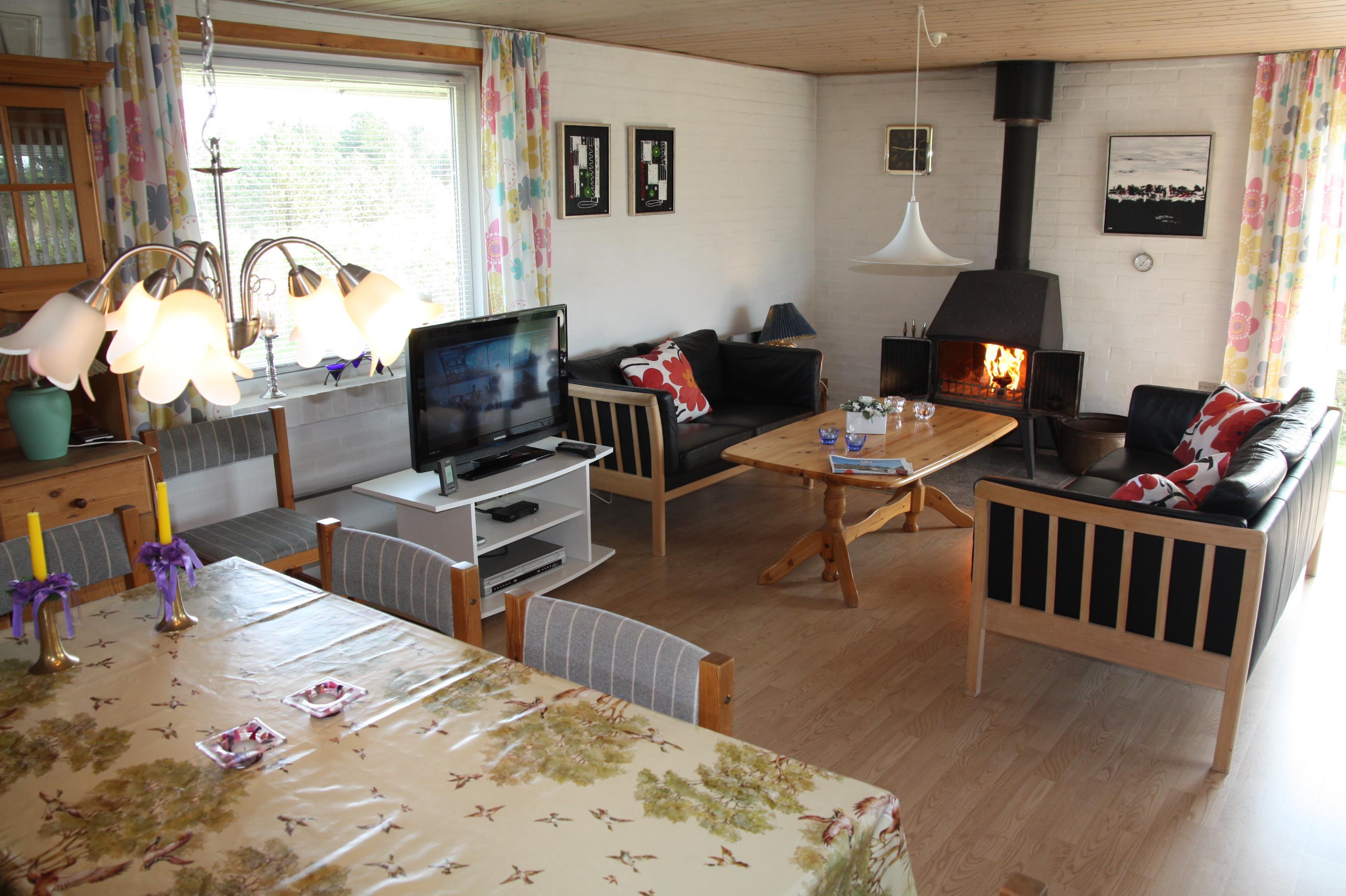Ældre delvis moderniseret fritidshus med stor græsgrund med gynge og sandkasse. Køkkenet har opvaskemaskine og mikroovn. I stuen er der DVD-afspiller, fjernsyn med parabol, radio og brændeovn. Der er barnestol og barneseng i huset. Der er tre soveværelser, alle med dobbeltsenge. Der er et overdækket areal ved indgangsdøren. Prisen er incl. vand. 1 dobbeltseng. 1 dobbeltseng. 1 dobbeltseng. Byggeår 1974, stenhus, barnestol, barneseng. Mikroovn, opvaskemaskine. DVD-afspiller, farve-TV og parabol, brændeovn, video, CD-afspiller, radio. Naturgrund, gynge, sandkasse.