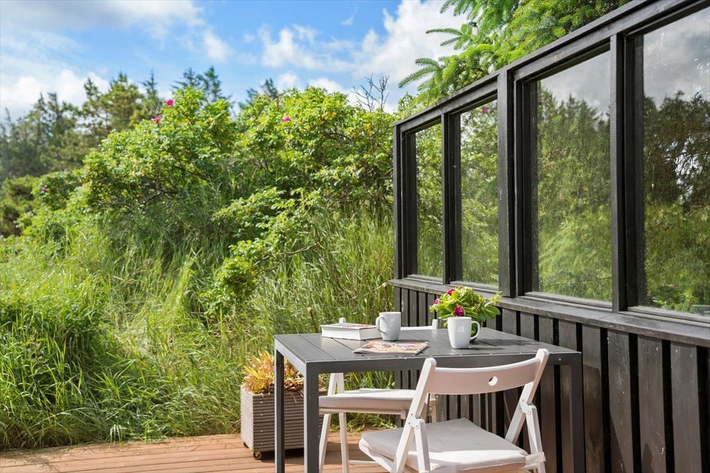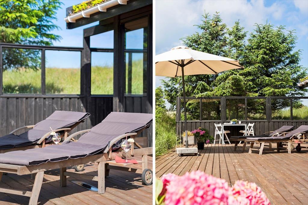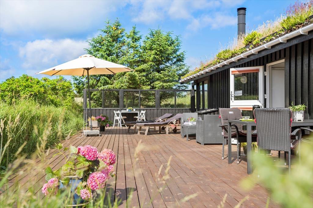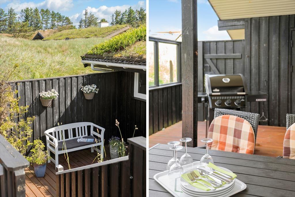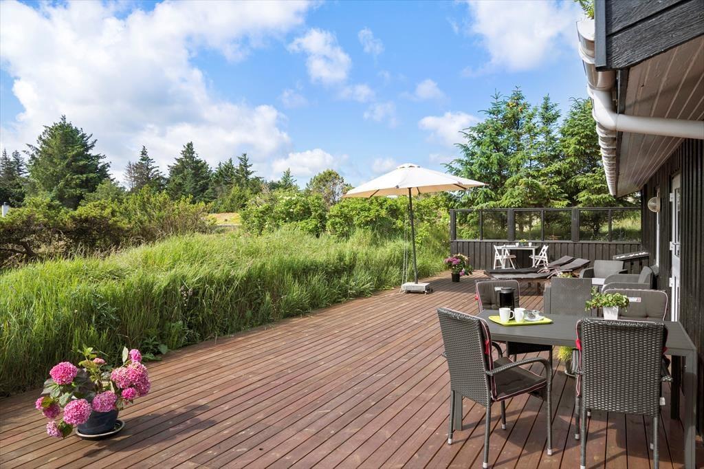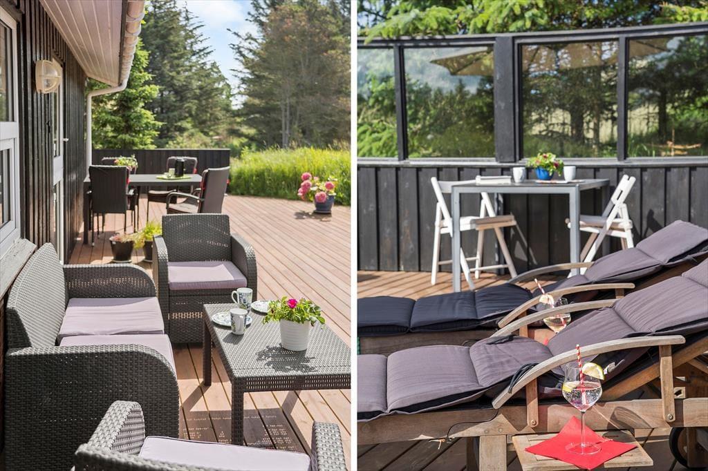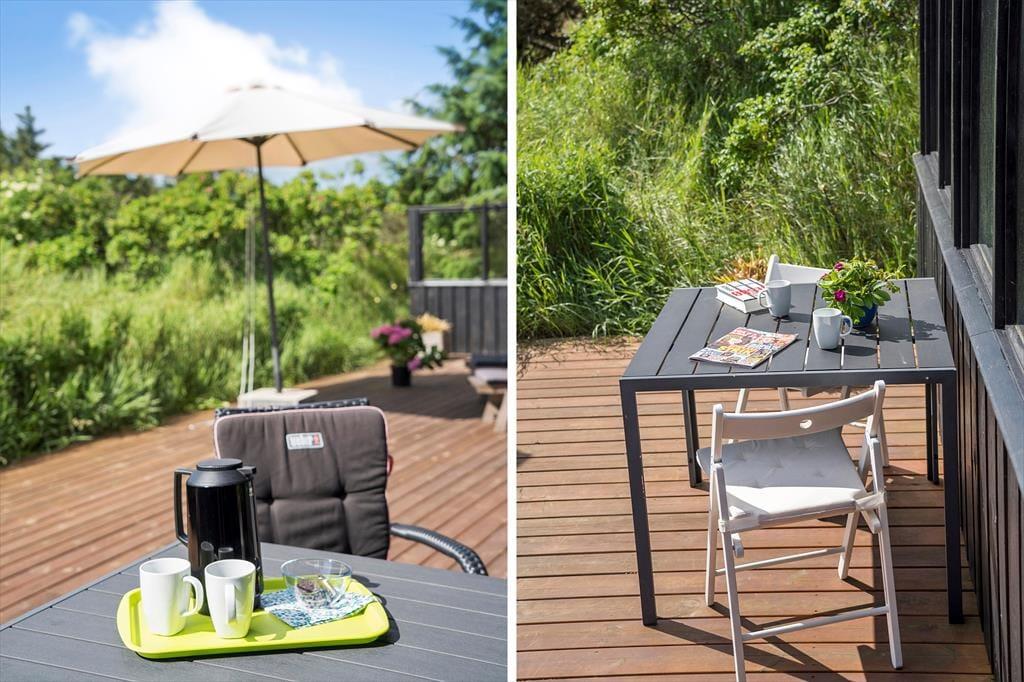 Når vejret er for godt til at blive inden døre, kan det meste af ferielivet foregå ude i det fri på husets store terrassemiljø. Terrassen er stor og delvist overdækket, og både træhegnet og naturgrundens viltre bevoksning sørger for at skærme opholdsarealerne af, så I kan sole jer og grille i helt ugenerede omgivelser.