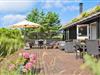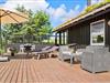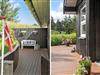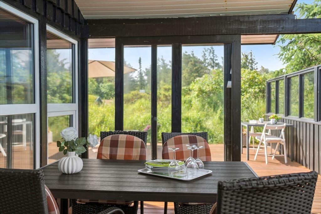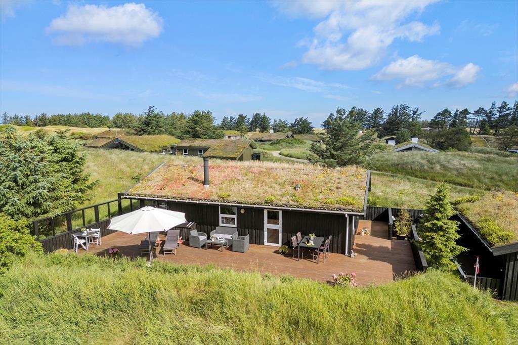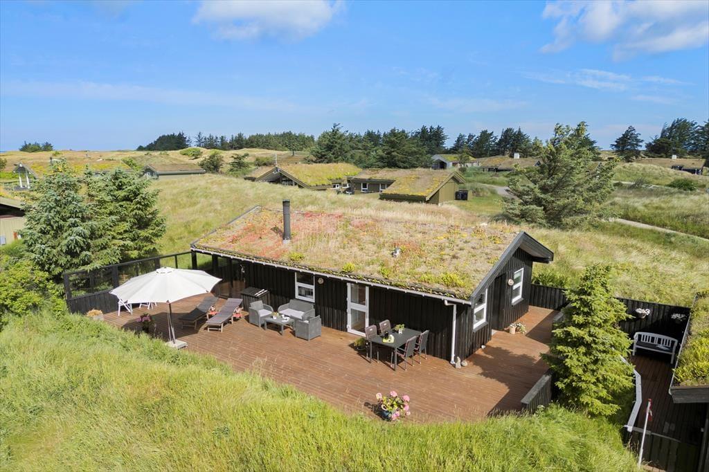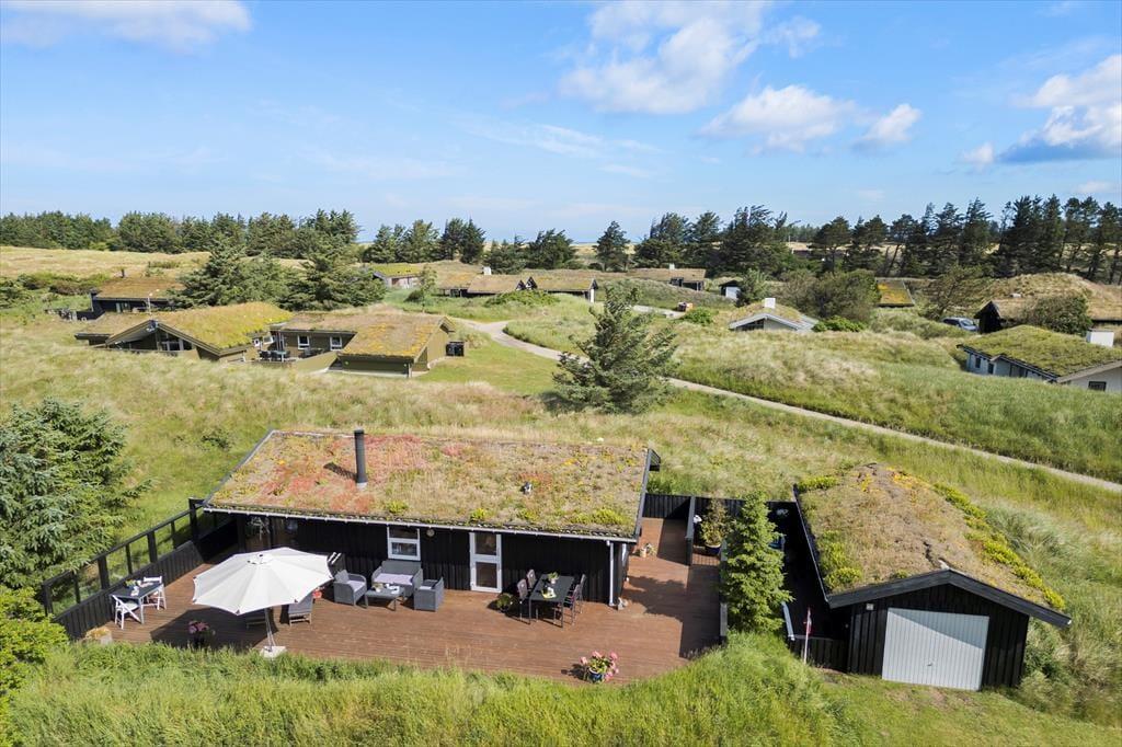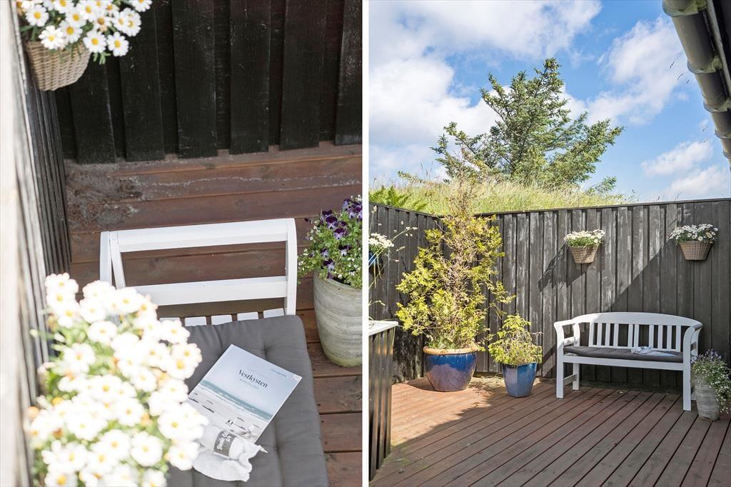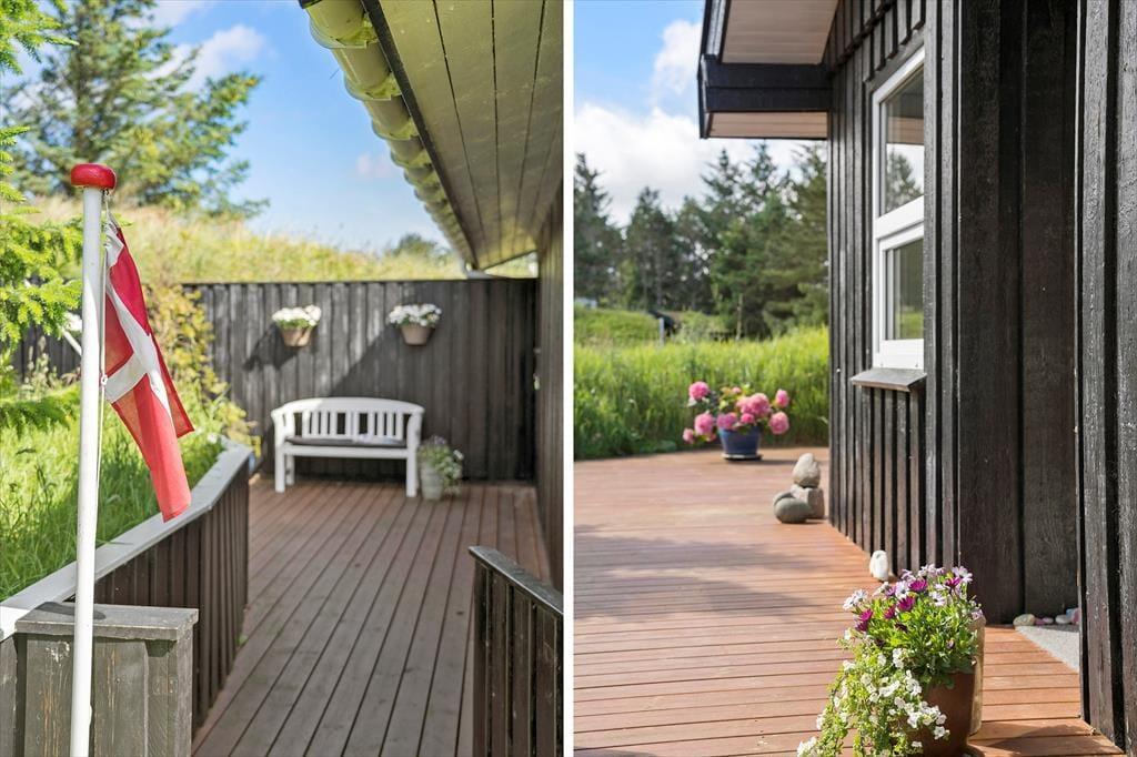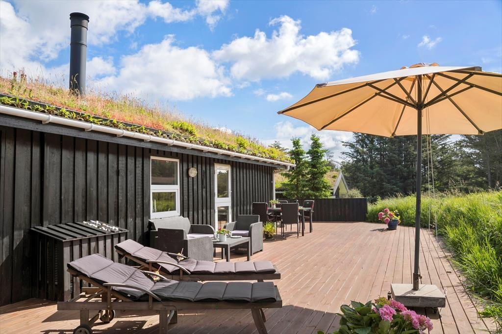Når vejret er for godt til at blive inden døre, kan det meste af ferielivet foregå ude i det fri på husets store terrassemiljø. Terrassen er stor og delvist overdækket, og både træhegnet og naturgrundens viltre bevoksning sørger for at skærme opholdsarealerne af, så I kan sole jer og grille i helt ugenerede omgivelser.