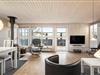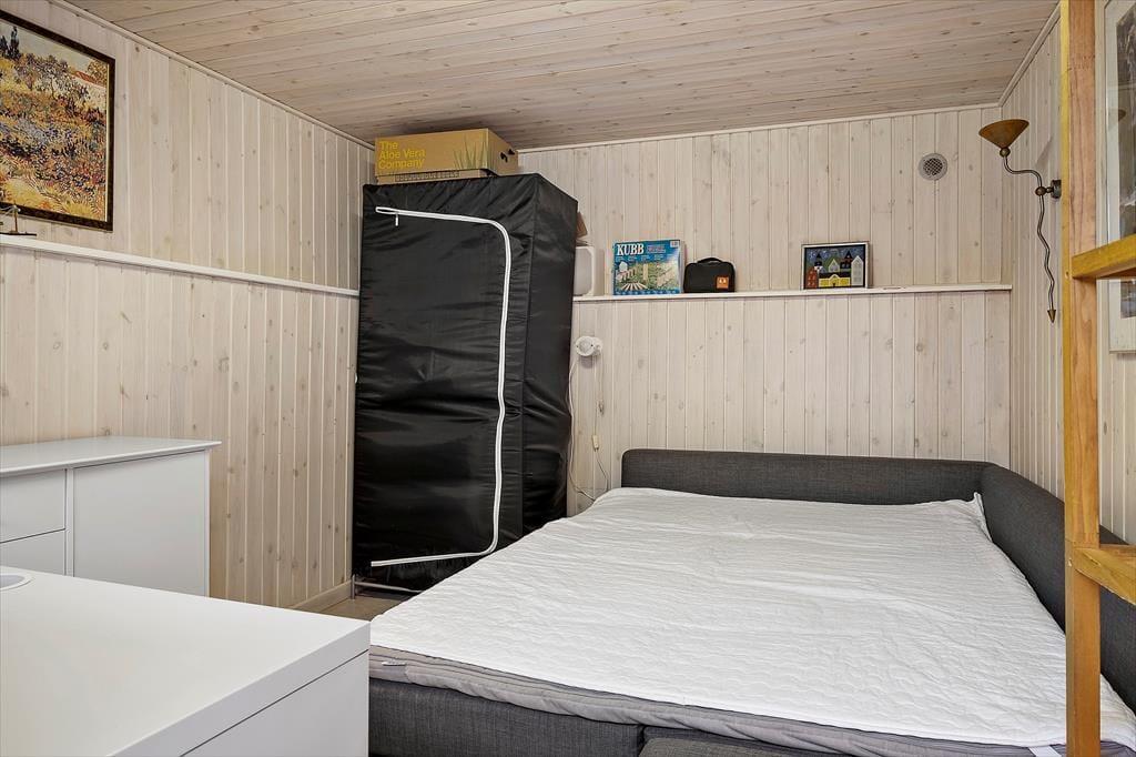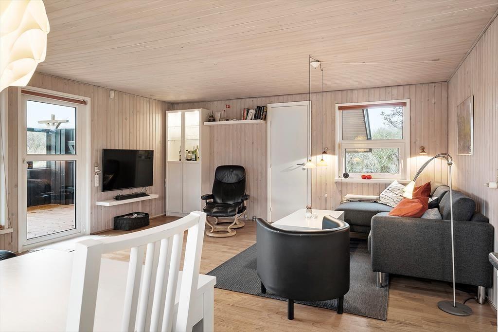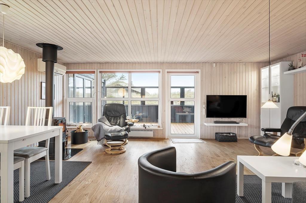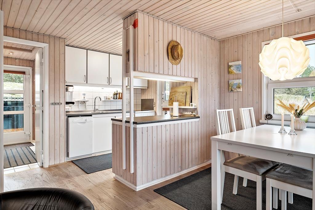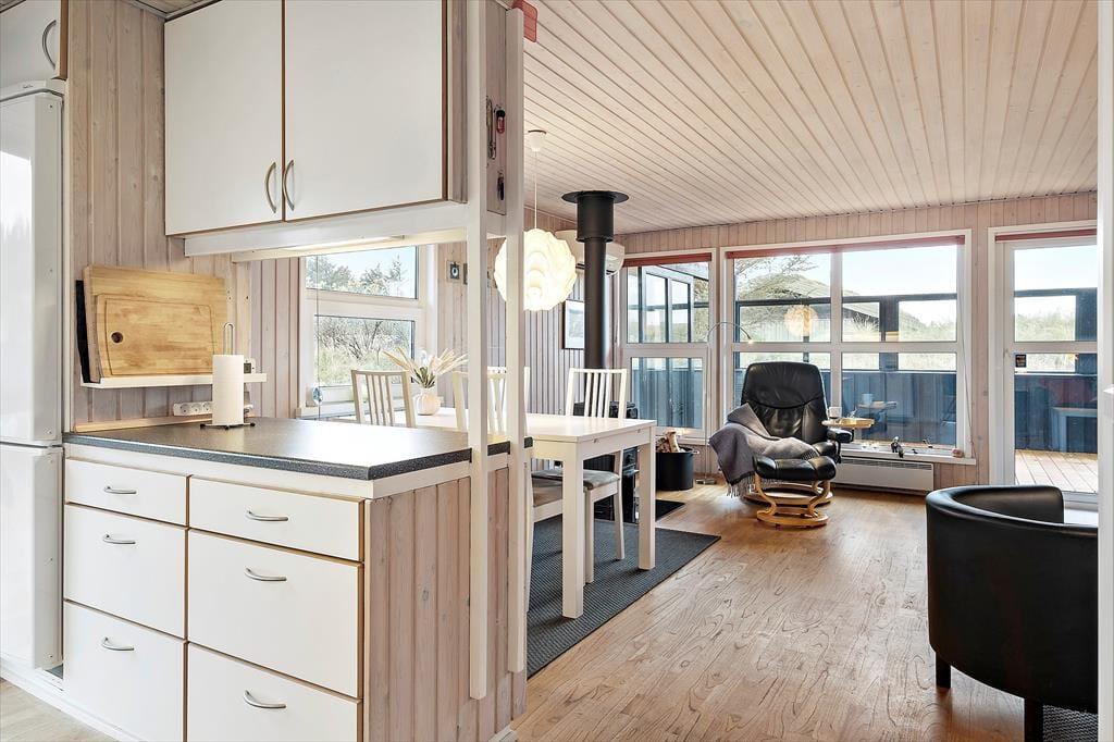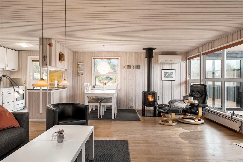 Sommerhuset er et pænt og velholdt eksemplar på 69 m2, og dertil kommer et anneks på 12 m2. Sidstnævnte er udstyret med en dobbeltseng, mens selve sommerhuset byder på tre soveværelser, så selv hvis I er seks personer samlet, kan I sove godt og uforstyrret om natten. Badeværelset er pænt indrettet med moderne inventar, og der er både vaskemaskine og tørretumbler til rådighed, hvis I får brug for at vaske strandhåndklæder eller andet i løbet af ferien. I opholdsrummet ligger køkken og stue i åben forbindelse. Her er der lagt op til ren hygge og afslapning, når der er ild i brændeovnen, en spændende film på fladskærmen og måske endda nybagte boller eller andre lækkerier på vej ud af ovnen.