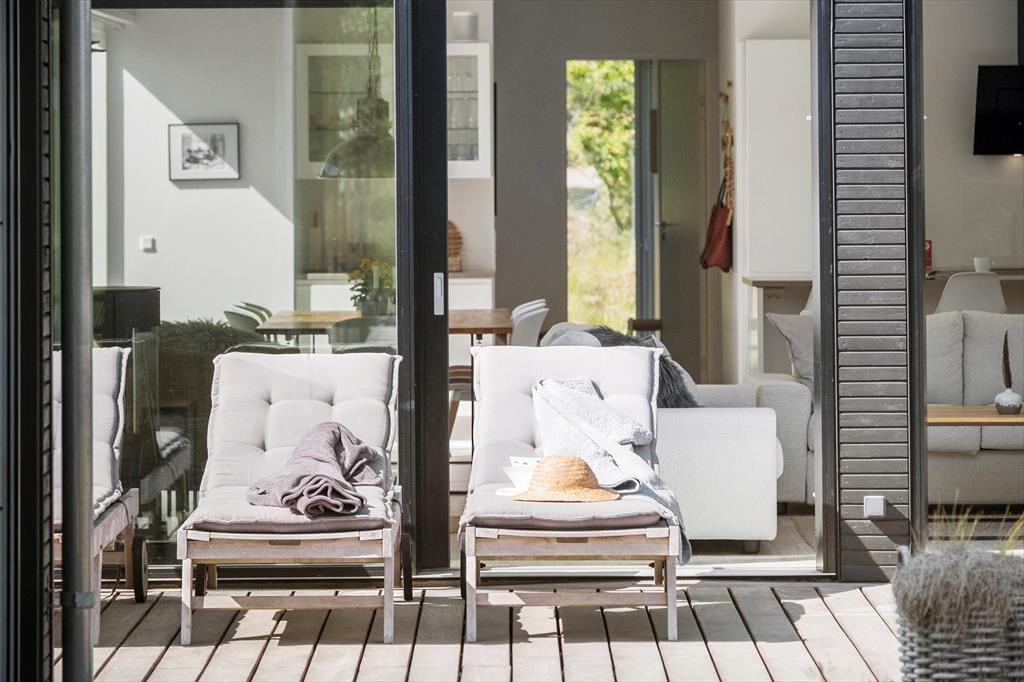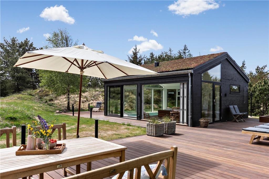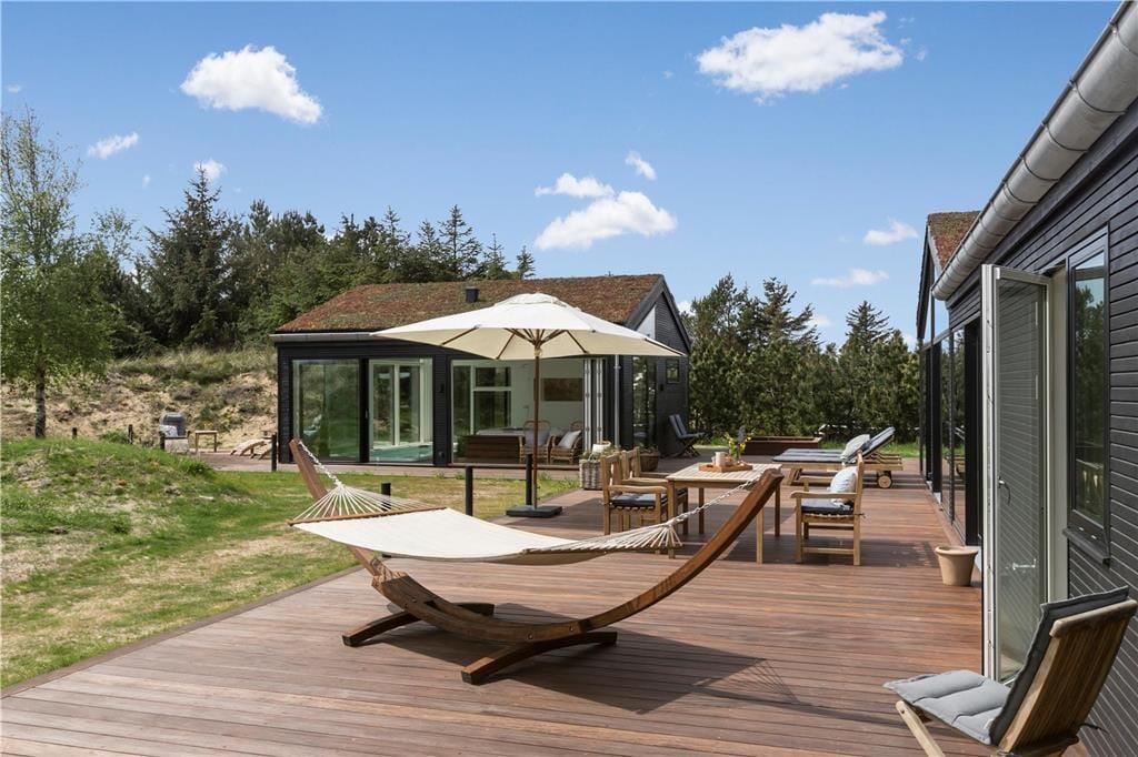 Ude på den store terrasse er der masser af plads til at slappe af og nyde den friske luft. Den flotte terrasse er perfekt til både afslapning og samvær, og med flere solrige og skyggefulde kroge, finder du helt sikkert din foretrukne siddeplads. Terrassen er ideelt placeret, så du kan nyde solen hele dagen lang, eller sidde i den bløde aftenbrise og lade dig omslutte af sommerens varme. Den idylliske og rolige grund omkring sommerhuset giver en følelse af privatliv, samtidig med at du stadig er tæt på Blokhus’ vidunderlige naturoplevelser.