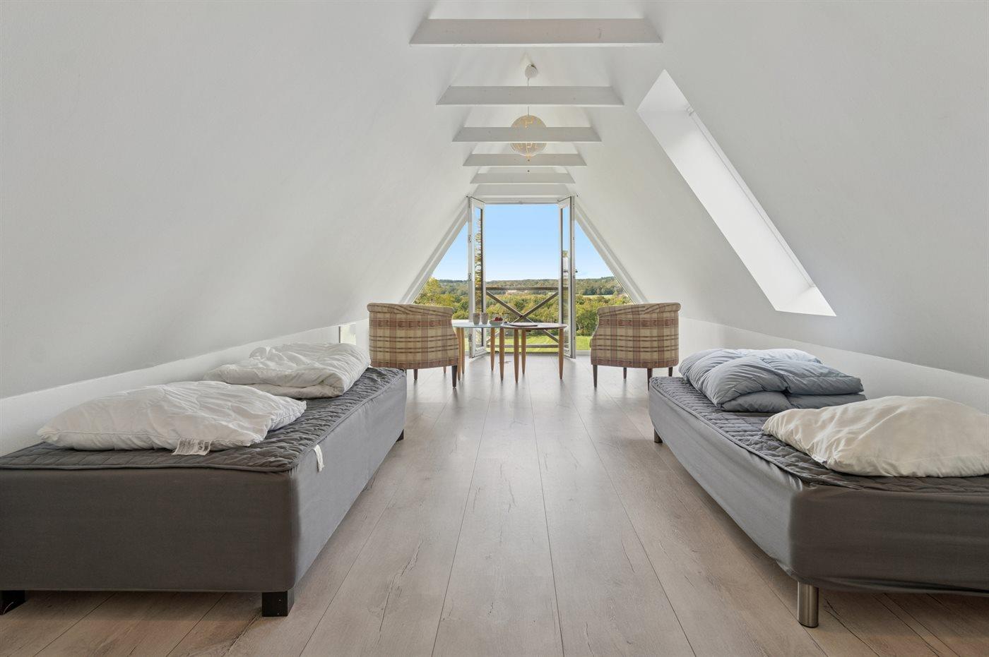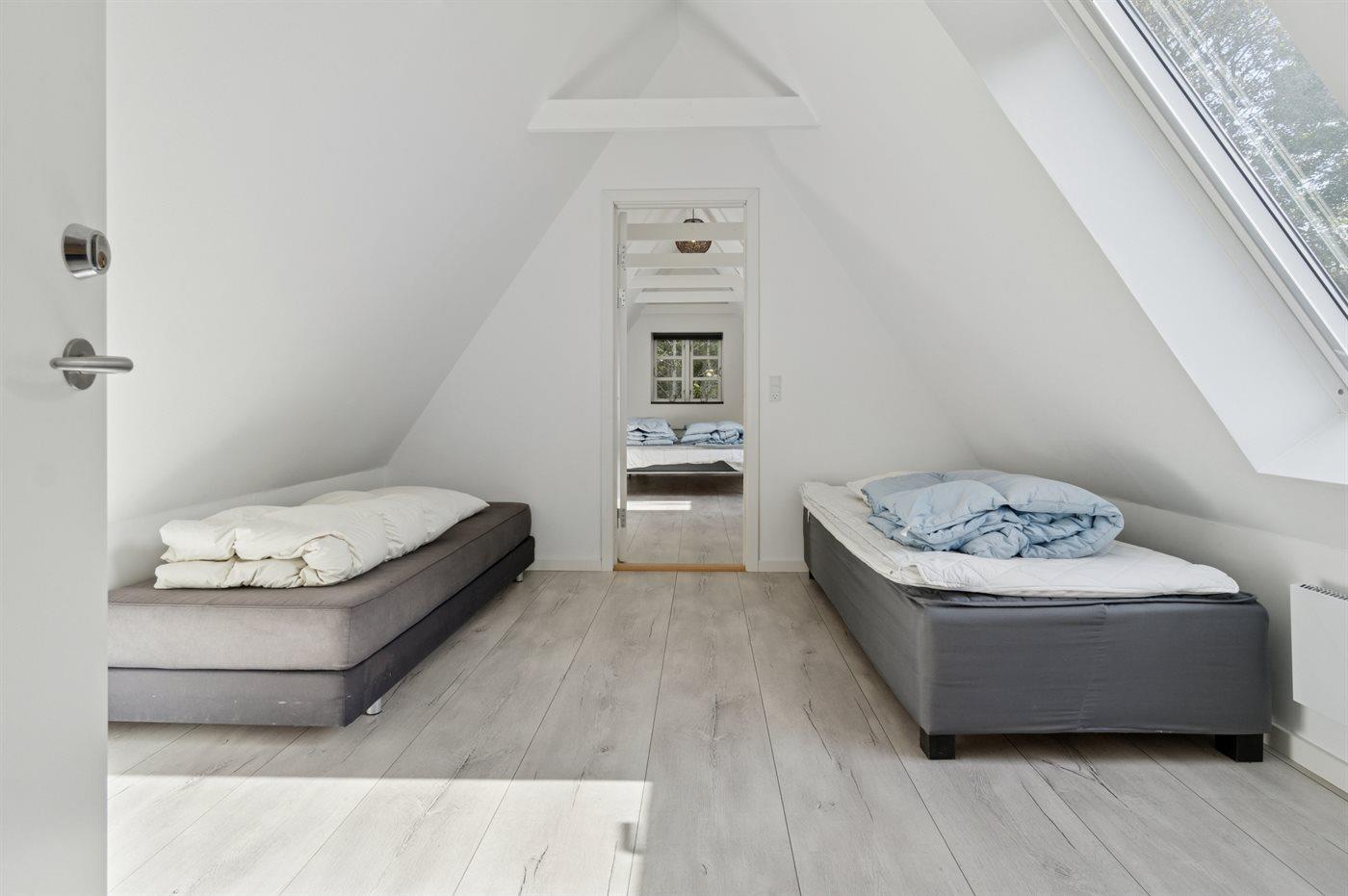 Der er i alt 4 soveværelser. Sovepladserne fordeler sig på: 6 sovepladser i dobbeltsenge. 2 sovepladser i enkeltsenge.