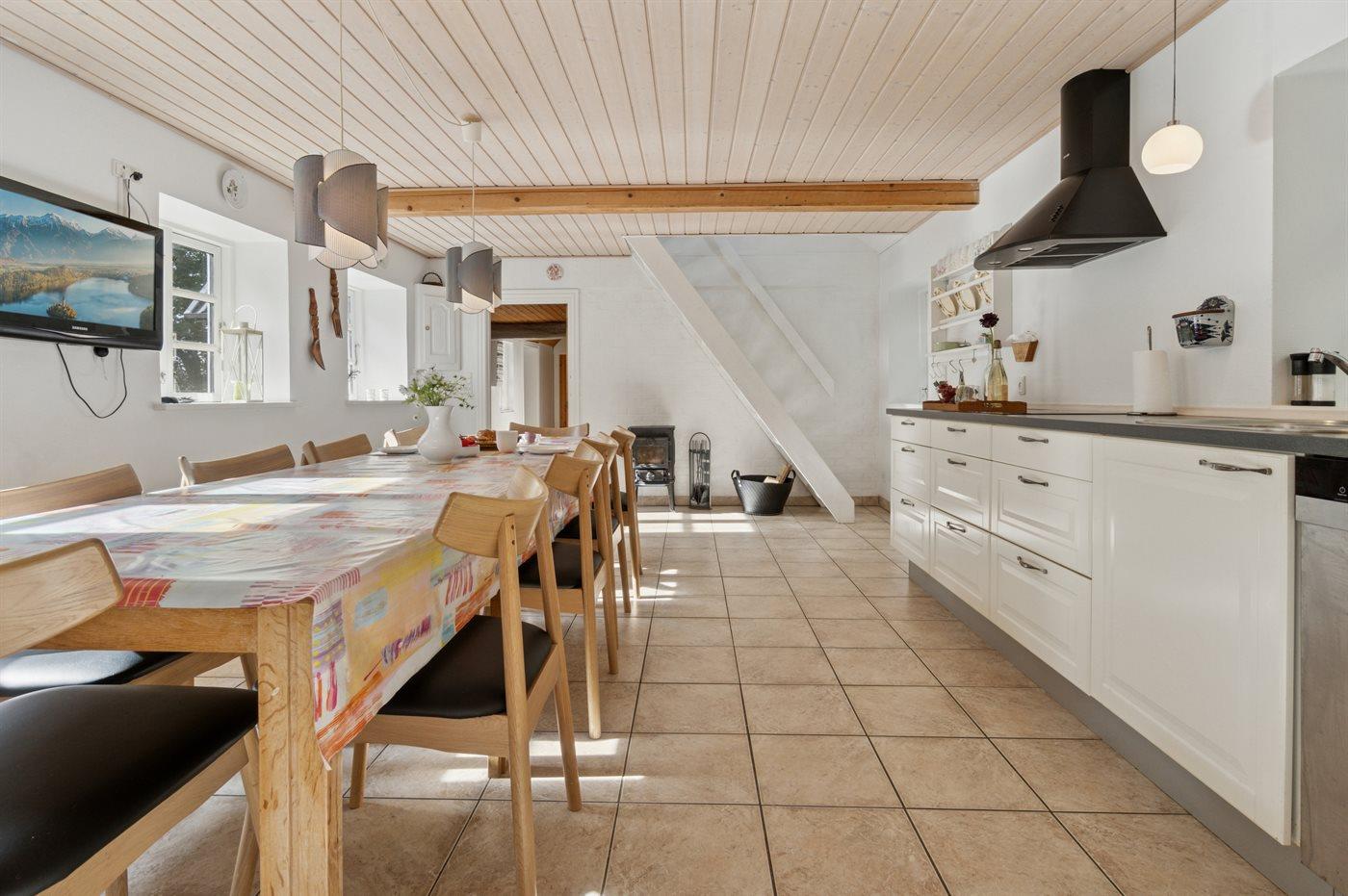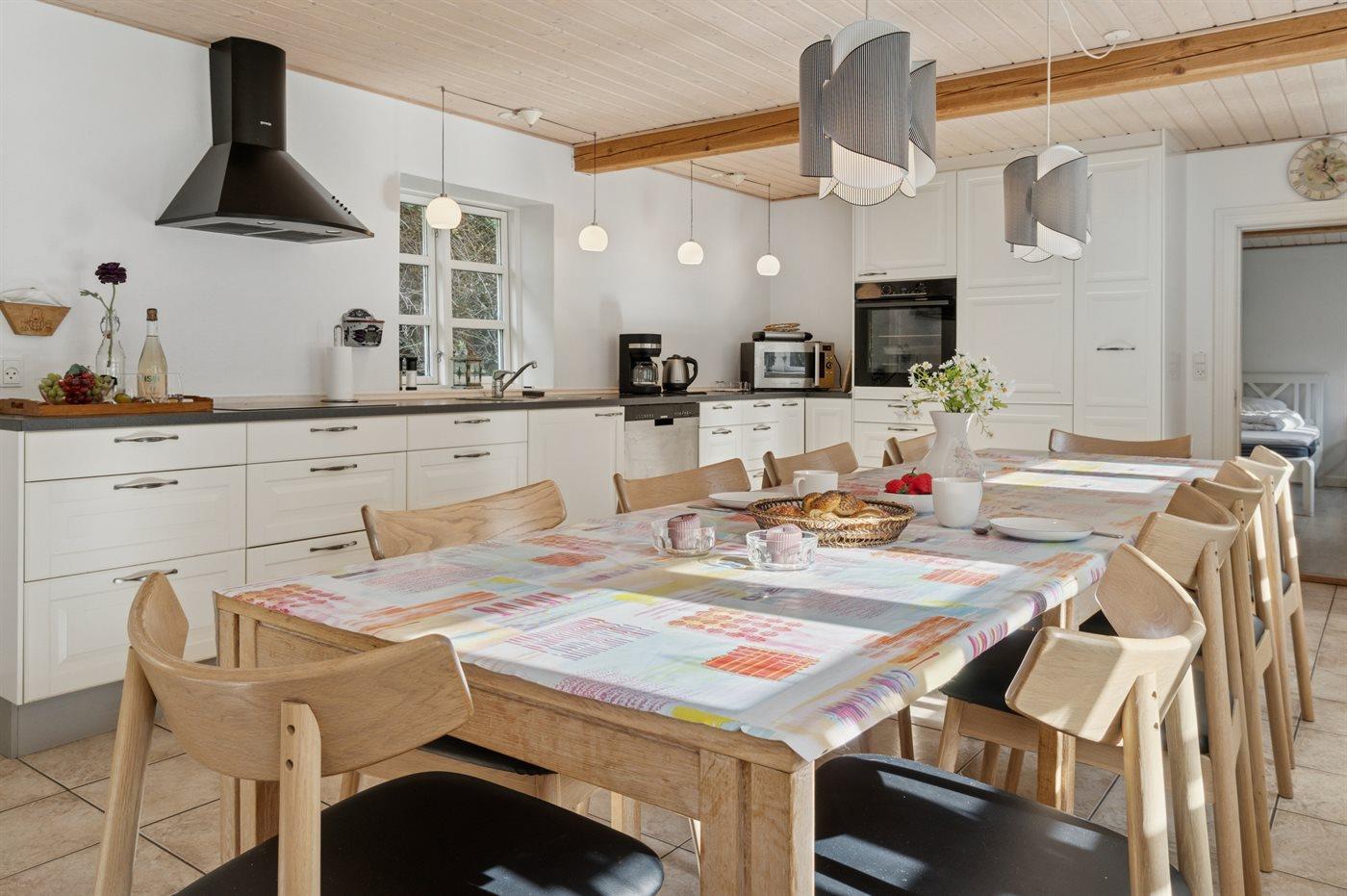 Køkkenet er udstyret med 2 køleskabe. Der er 4 keramiske kogeplader, varmluftovn, mikrobølgeovn samt opvaskemaskine Der er gulvvarme i køkkenet.