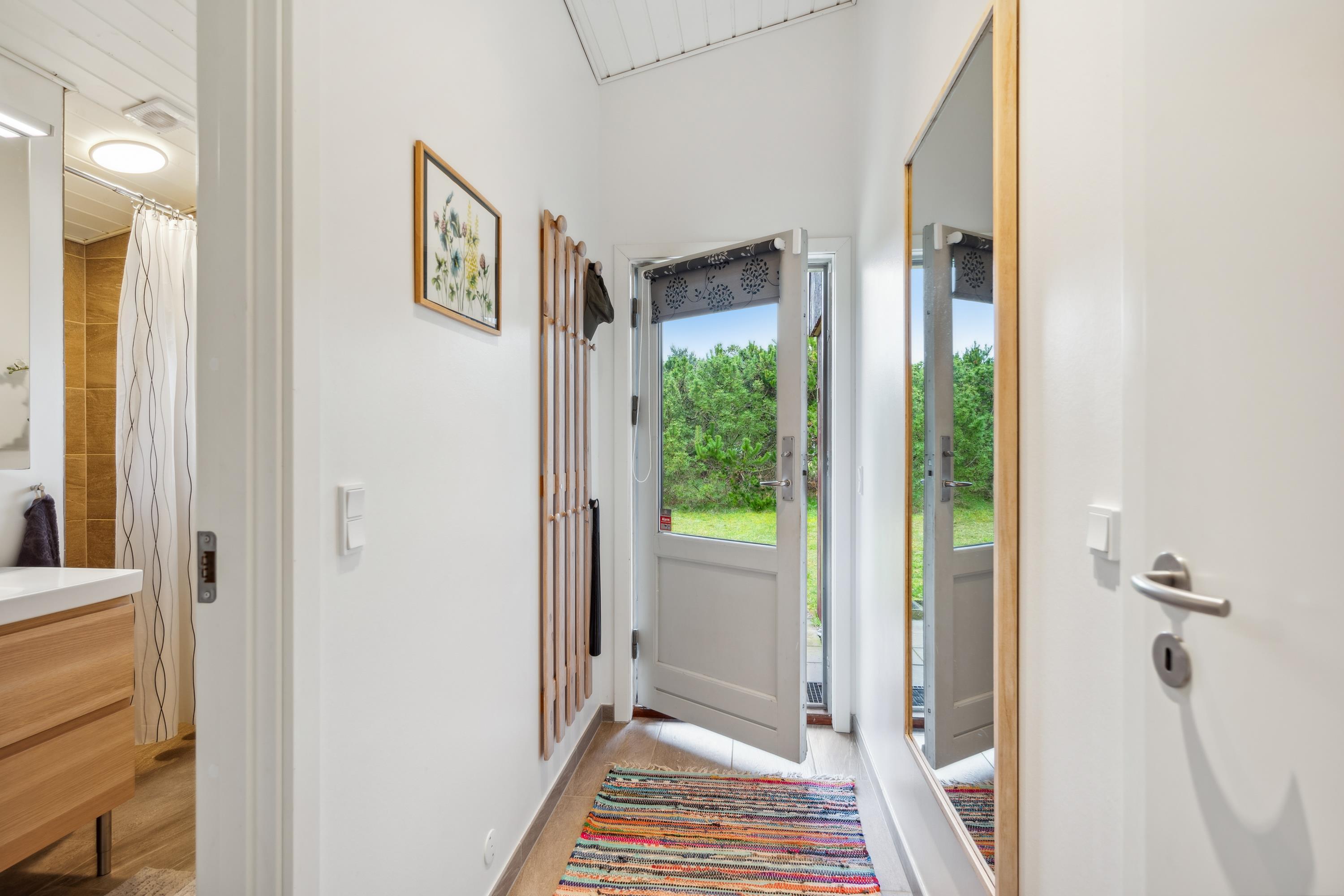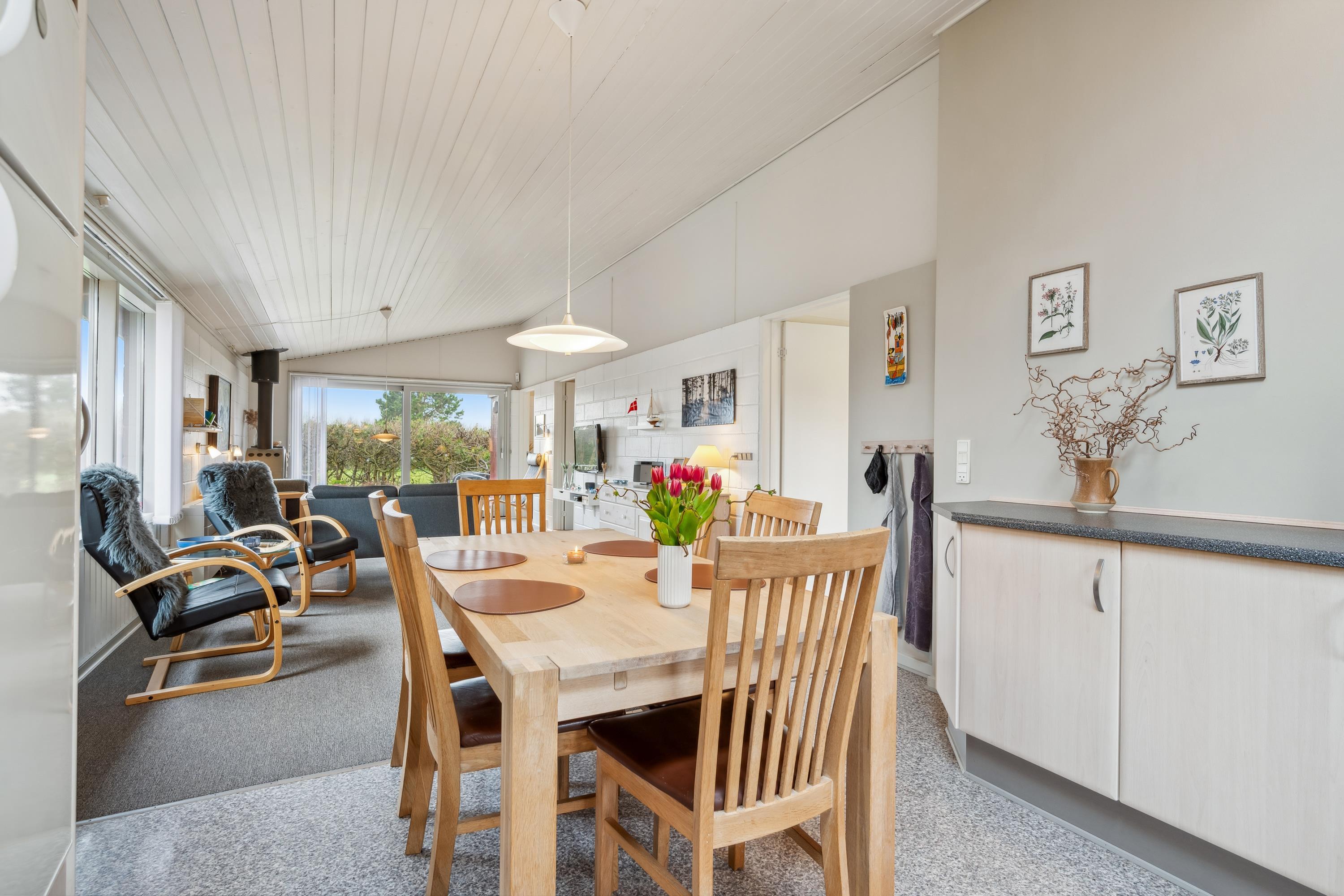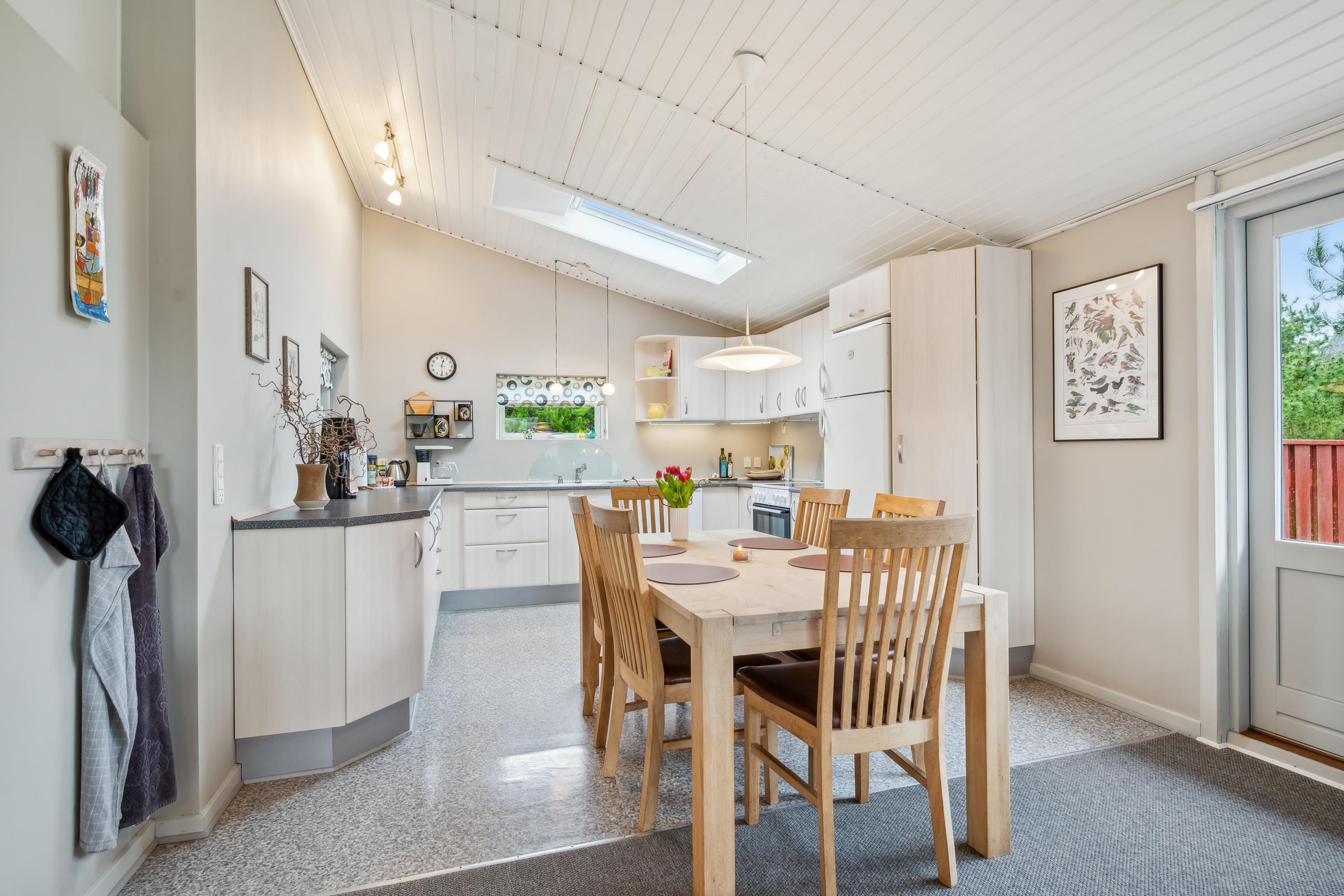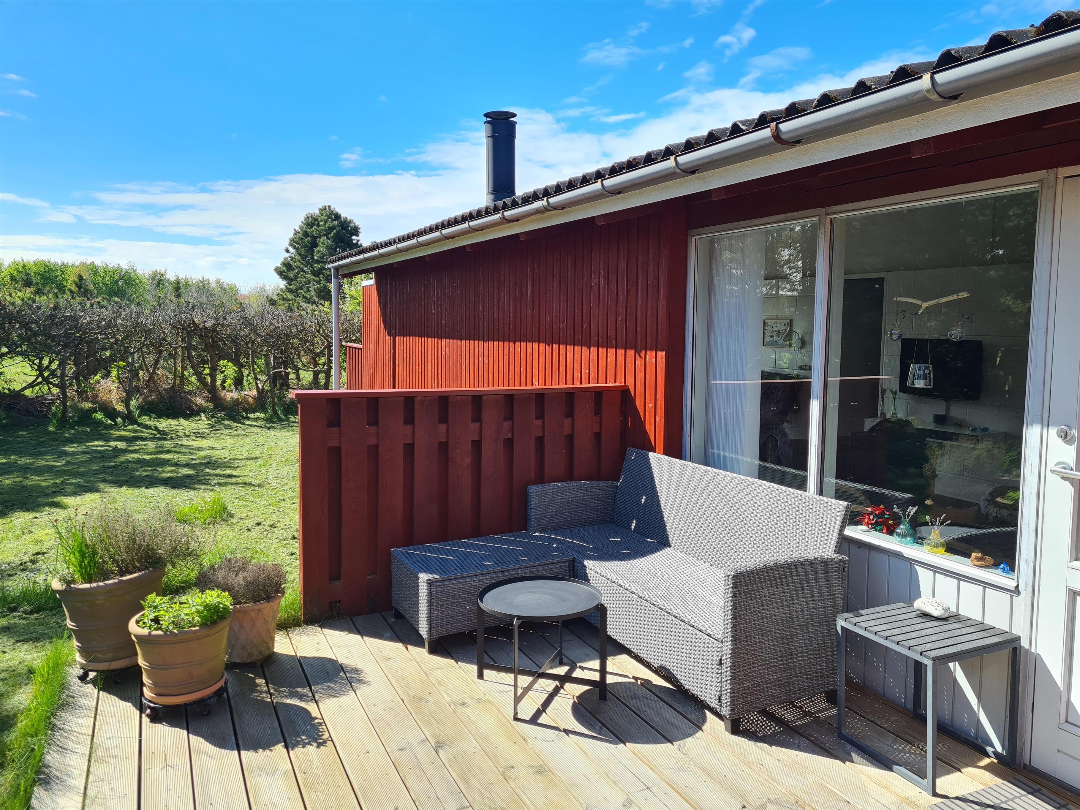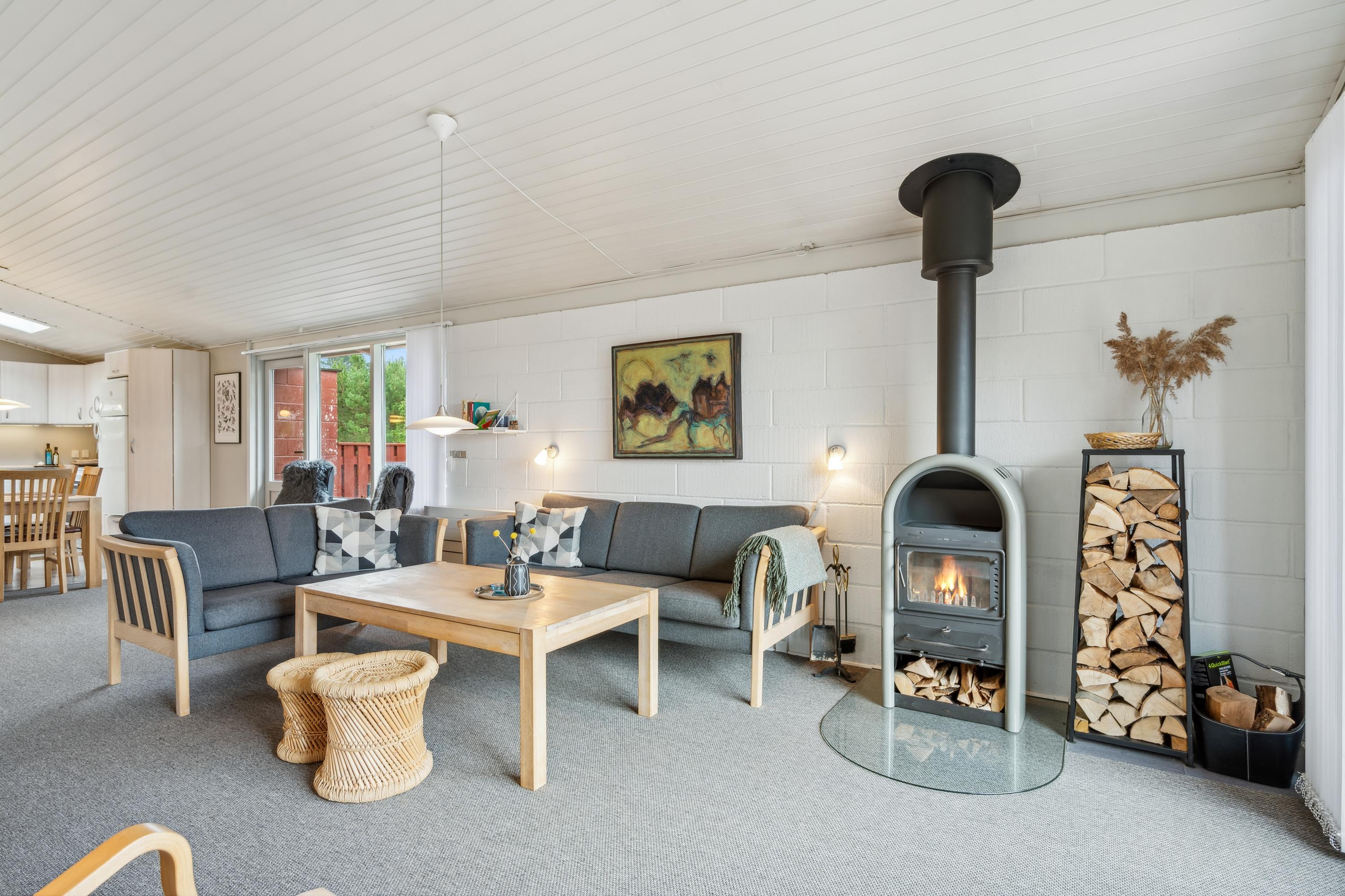 Dejligt sommerhus beliggende i strandnære omgivelser på en naturgrund med træer og buske med delvis overdækket terrasse med havemøbler og grill. Hyggelig opholdsstue med brændeovn, TV med kabel-TV (bl.a. TV2) og stereoanlæg med CD. Køkken med elkomfur, køleskab med lille fryser og opvaskemaskine. Badeværelse med bruseniche. Husets sovepladser fordeler sig på 3 soverum: 2 med enkeltsenge og 1 mindre seng 120x200. Til de små feriegæster findes barneseng og barnestol. Carport til bilen er tilgængelig.