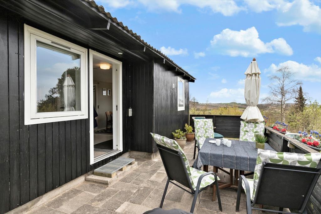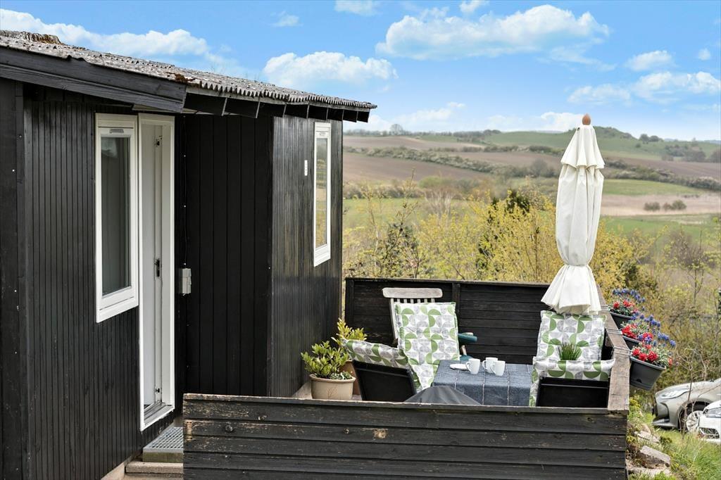 Huset har også en dejlig terrasse med havemøbler og grill, så når vejret tillader det, er det bare med at finde noget godt at lægge på grillen og dække havebordet, så naturen kan komme helt tæt på. Og er man mere til bål, er der også en bålplads nederst i haven.