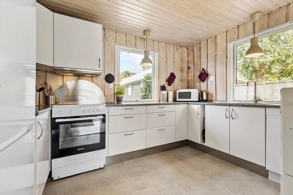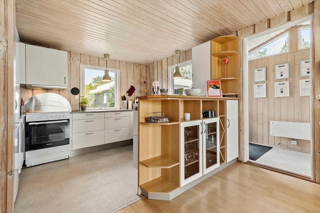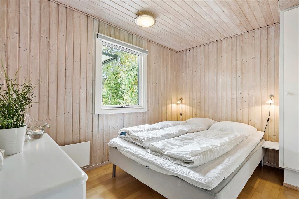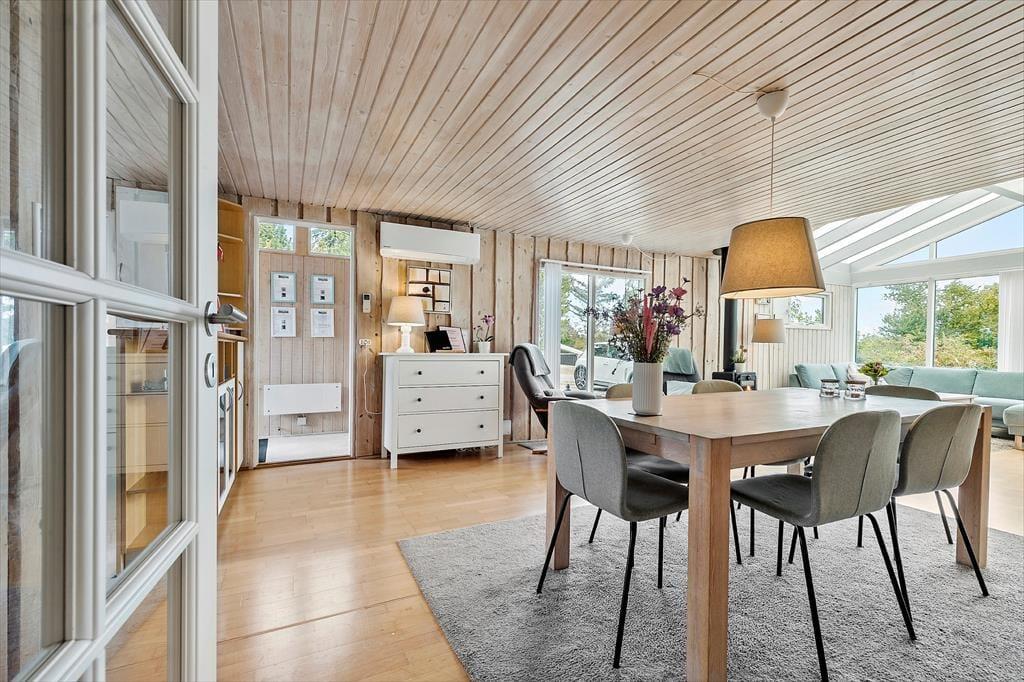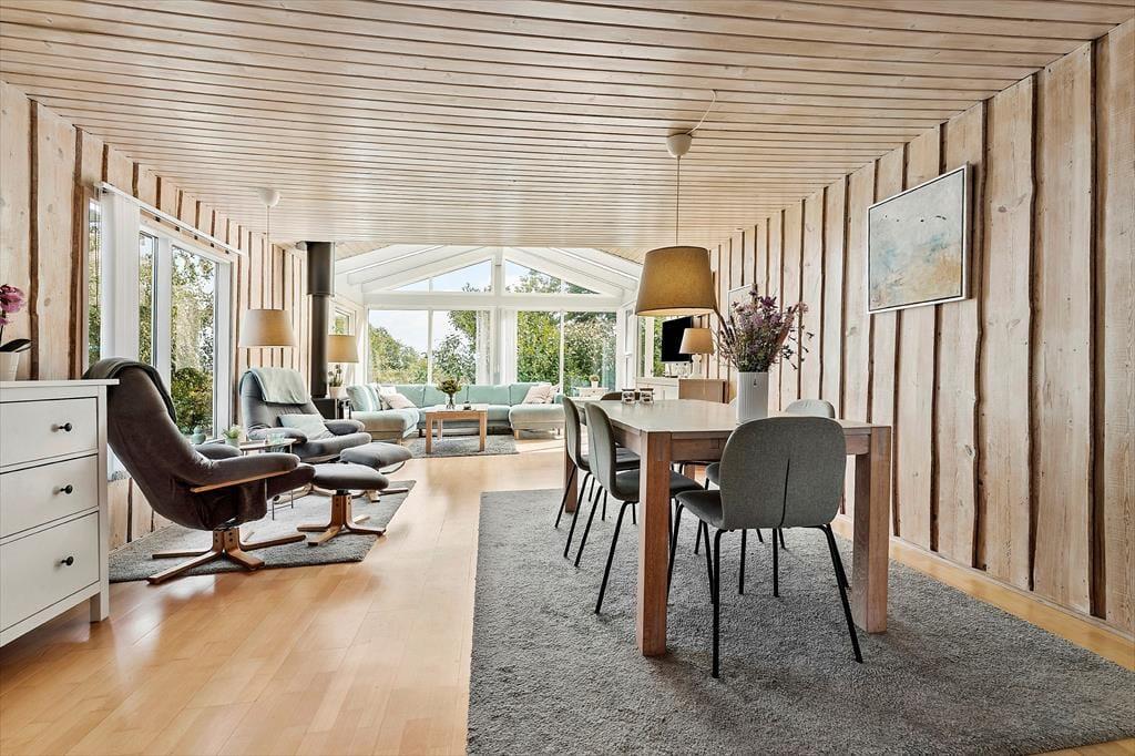 Her får I en lys og indbydende base til jeres næste ferie – perfekt til både afslapning og hyggelige stunder med familien. Det velholdte træhus byder på en dejlig atmosfære, hvor loft til kip og store vinduespartier skaber luft og lys i opholdsrummet. Her kan I læne jer tilbage i sofaen med udsigt til haven, mens brændeovnen knitrer i baggrunden og bidrager med ekstra hygge. Køkkenet er praktisk indrettet og en del af det åbne opholdsrum, så I kan lave mad og samtidig være en del af snakken. Huset har tre gode soveværelser med komfortable senge og plads til i alt seks personer – og badeværelset byder på bademulighed i en bruseniche, så I kan forkæle jer selv efter en lang gåtur ved vandet.