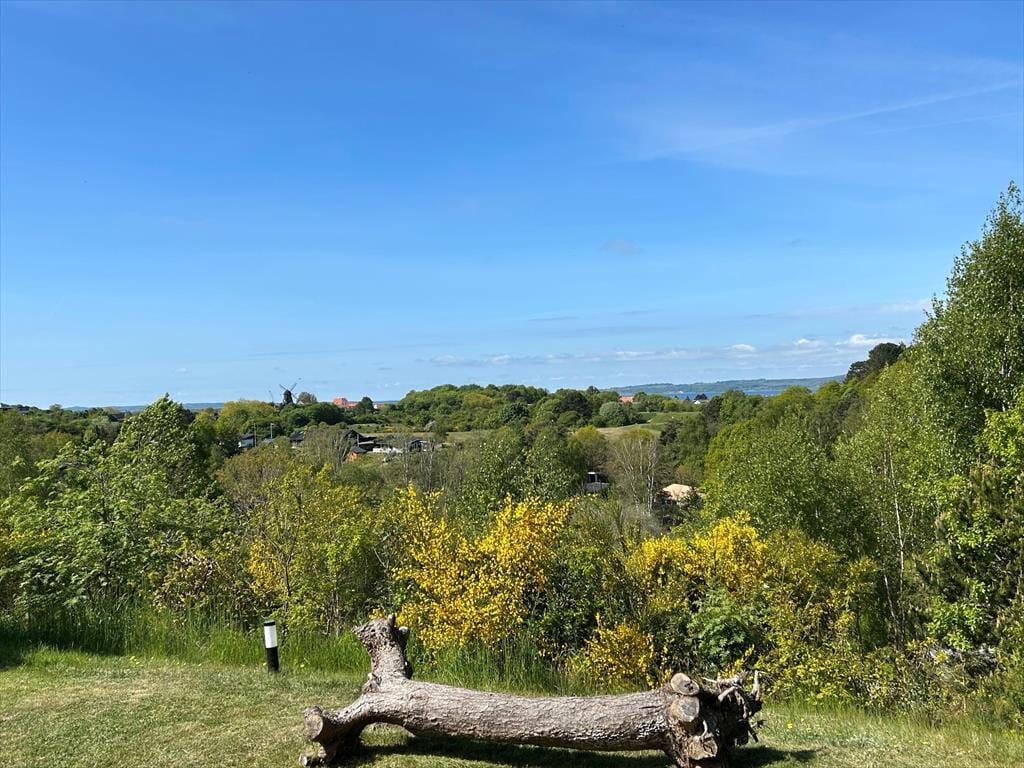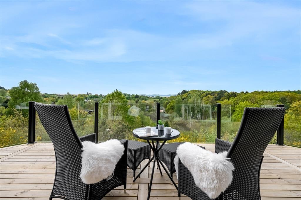Så snart du træder ud på terrassen, forstår du, hvorfor denne beliggenhed er noget helt særligt. Her kan du nyde en betagende panoramaudsigt over bakkerne, det grønne landskab og havglimtet, der skifter karakter fra morgenens bløde lys til solnedgangens varme farver.