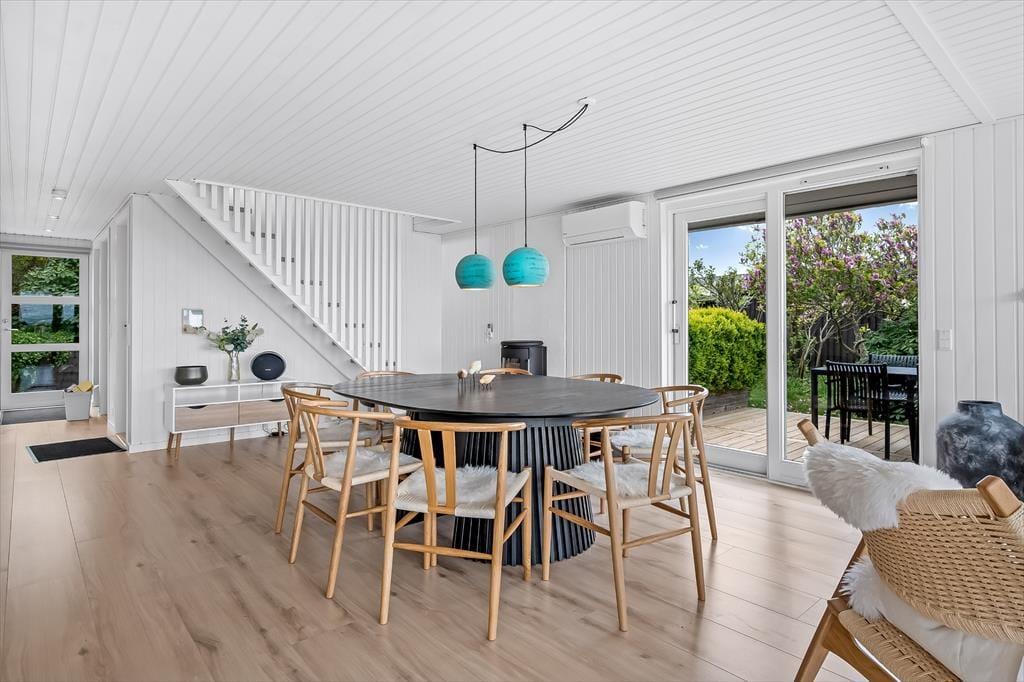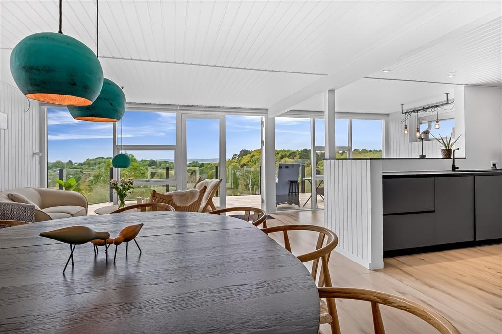 Når du træder indenfor i dette nyrenoverede og lyse sommerhus, bliver du mødt af en atmosfære af ro, komfort og rummelighed. Fra entreen kan du allerede ane den fantastiske udsigt, der følger dig gennem hjemmet – et sjældent kig over det kuperede Djurslands-landskab og helt ud mod havet i horisonten.