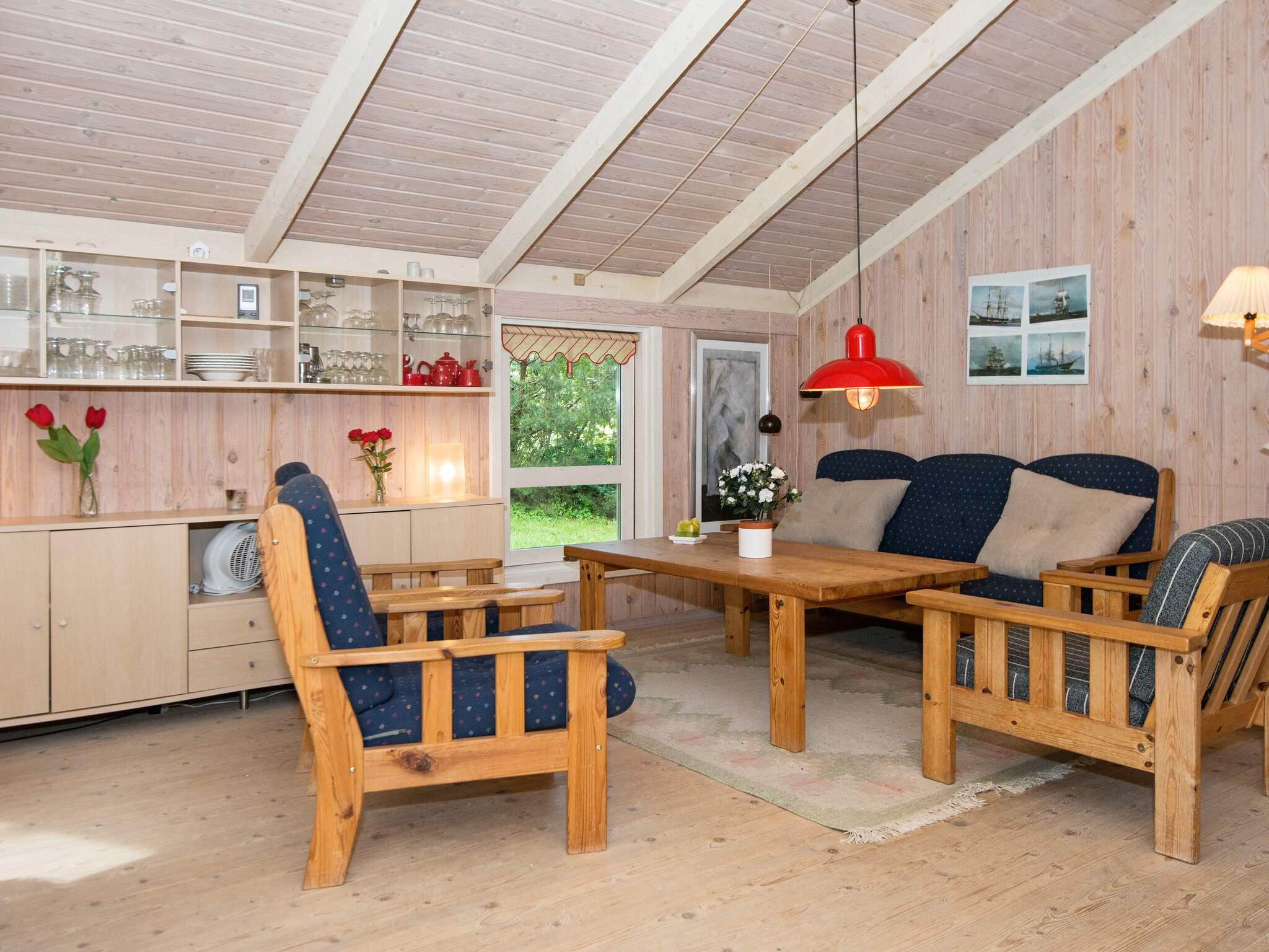 Lyst sommerhus i Boeslum Bakker med hyggelig stue, overdækket terrasse og smuk natur på Djursland.