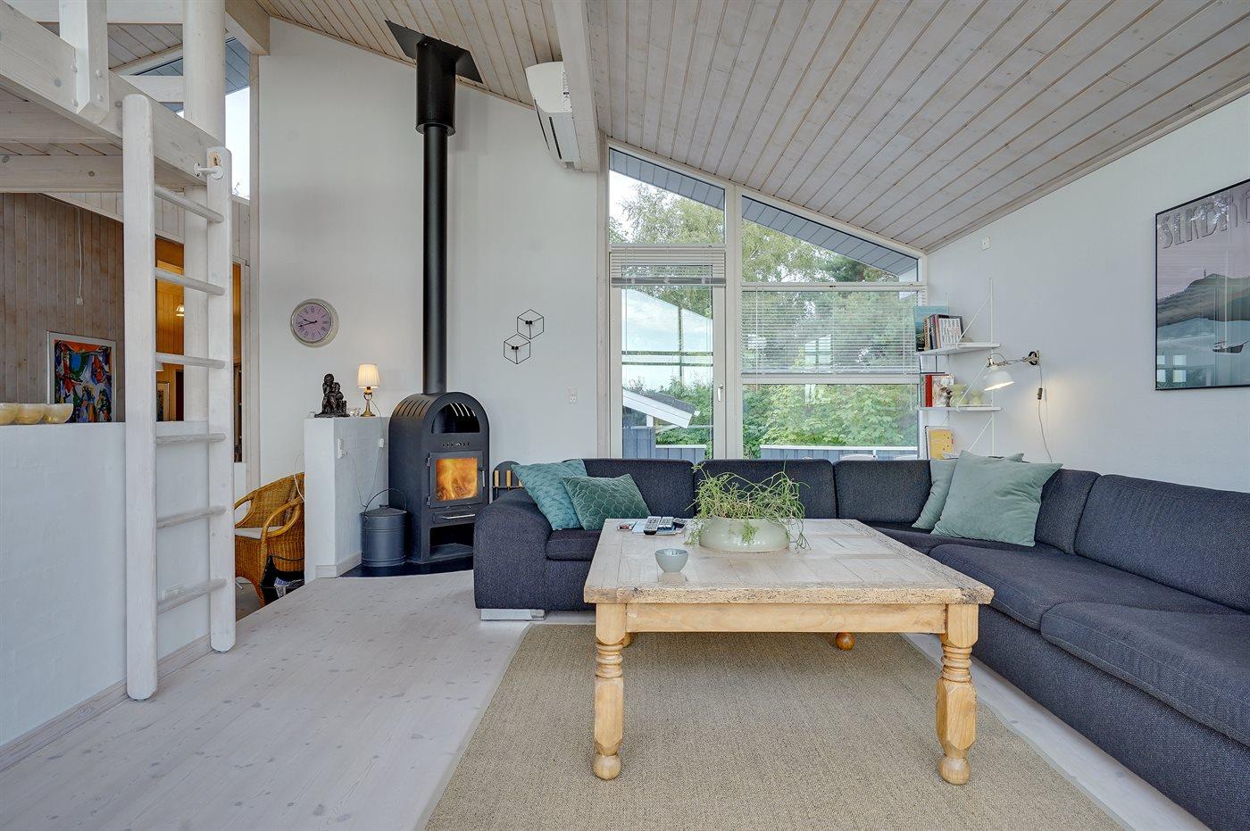 Skønt, rummeligt og velindrettet sommerhus bygget i flere forskudte plan med udsigt til vandet fra såvel hus som grund. Huset ligger på en meget stor grund med en del træer og med flere lukkede og læfyldte terrasser omkring huset. Indvendigt er huset indrettet med hems, hvor 1 soveplads befinder sig.