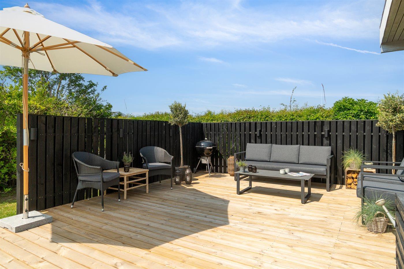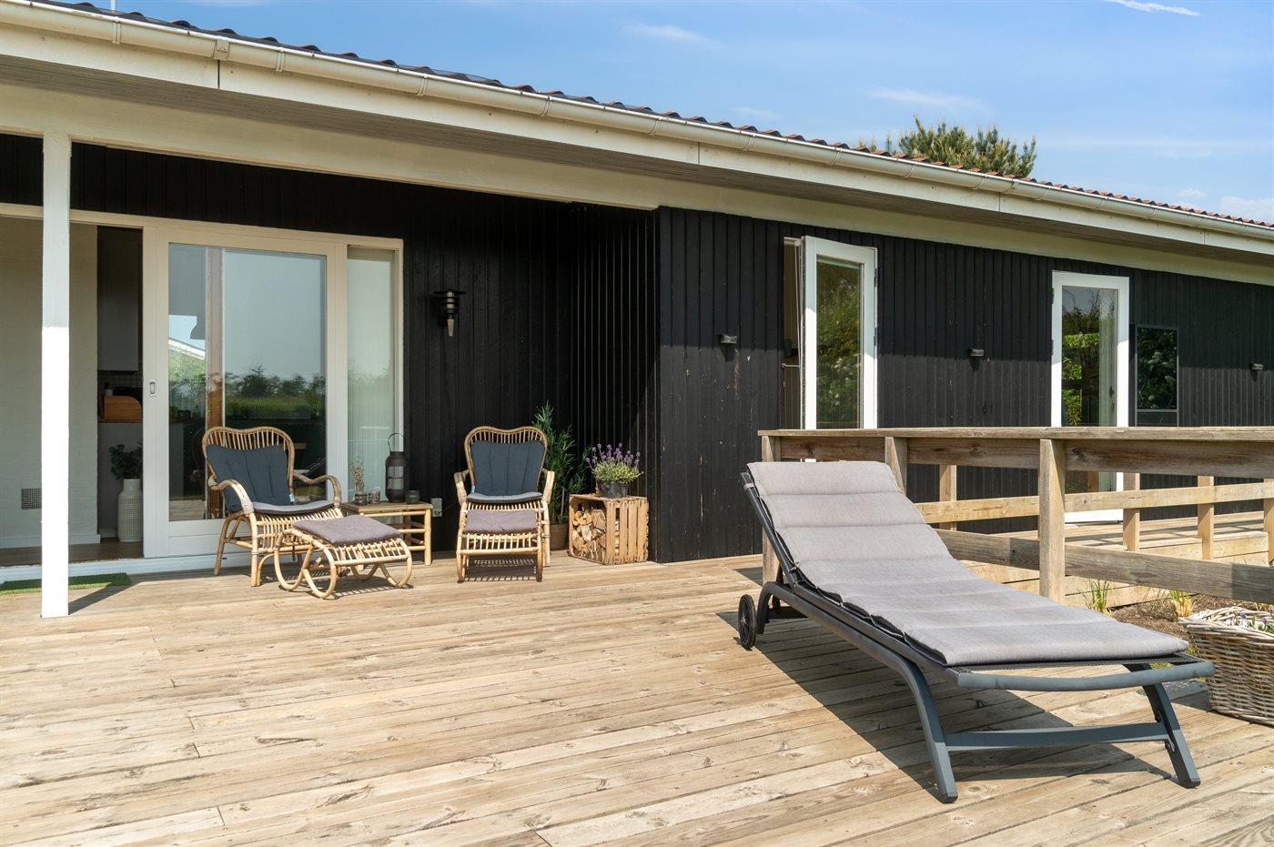 Moderne sommerhus nær Dråby Strand med stor terrasse og indhegnet have.