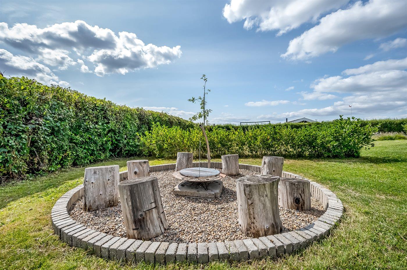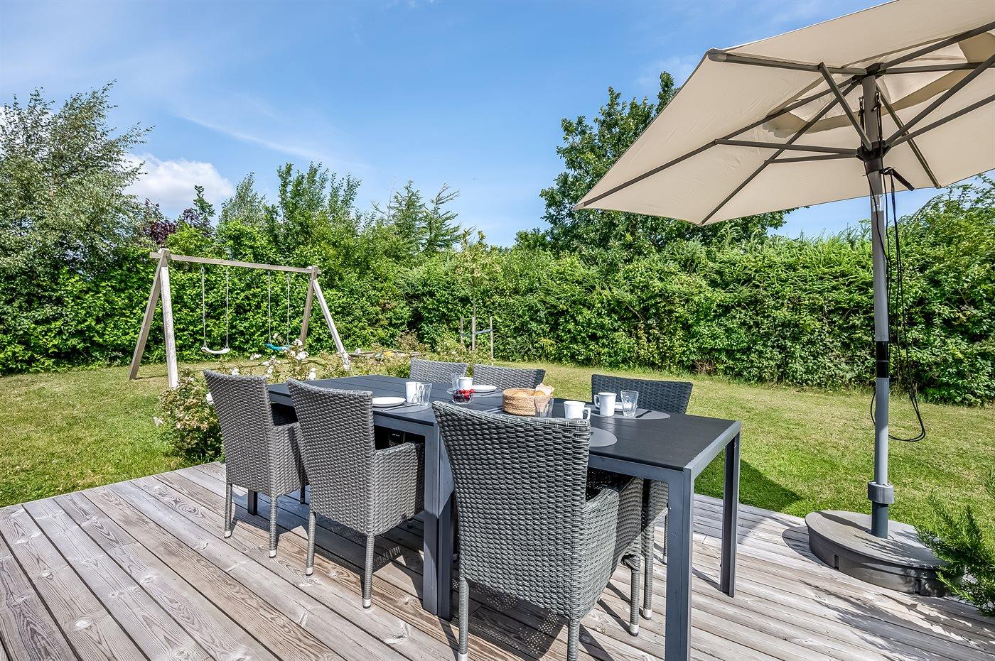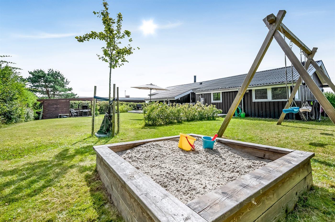 Den store grund har en dejlig lukket have med mulighed for at nyde udelivet under private forhold. Rundt om huset findes skøn terrasse, hvorfra solen kan nydes hele dagen. Der er også en overdækket pergola, hvor I kan nyde udsigten og de skønne sommeraftener. Der er Weber kulgrill og Napoleon gasgrill samt et hyggeligt bålsted med rist. Til børnene er der nyt fodboldmål, nye gynger og sandkasse.