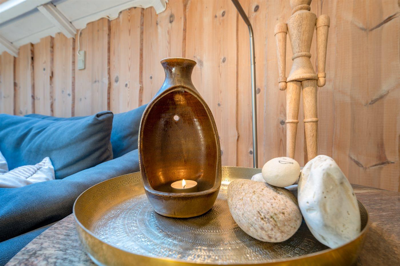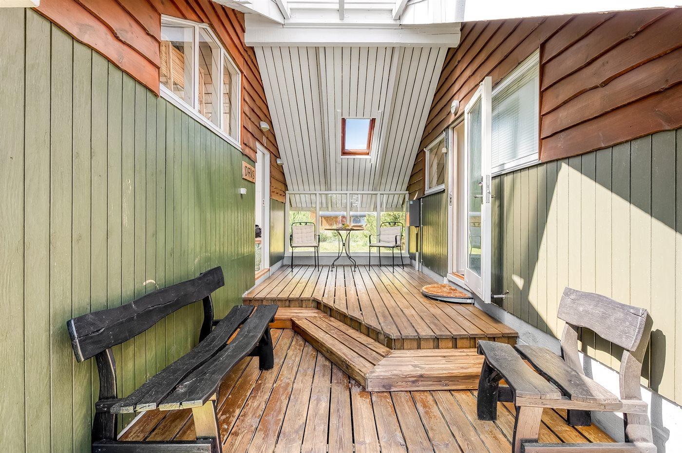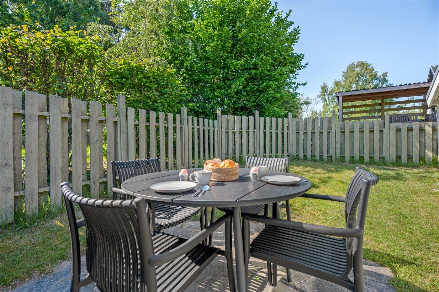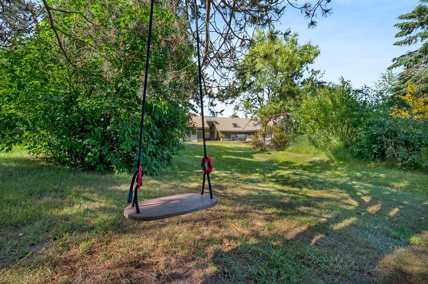 Udenfor ligger huset på en dejlig naturgrund med flere hyggelige stier på den delvist bevoksede grund. Her findes gode terrasser og et hyggeligt bålsted midt i naturen.