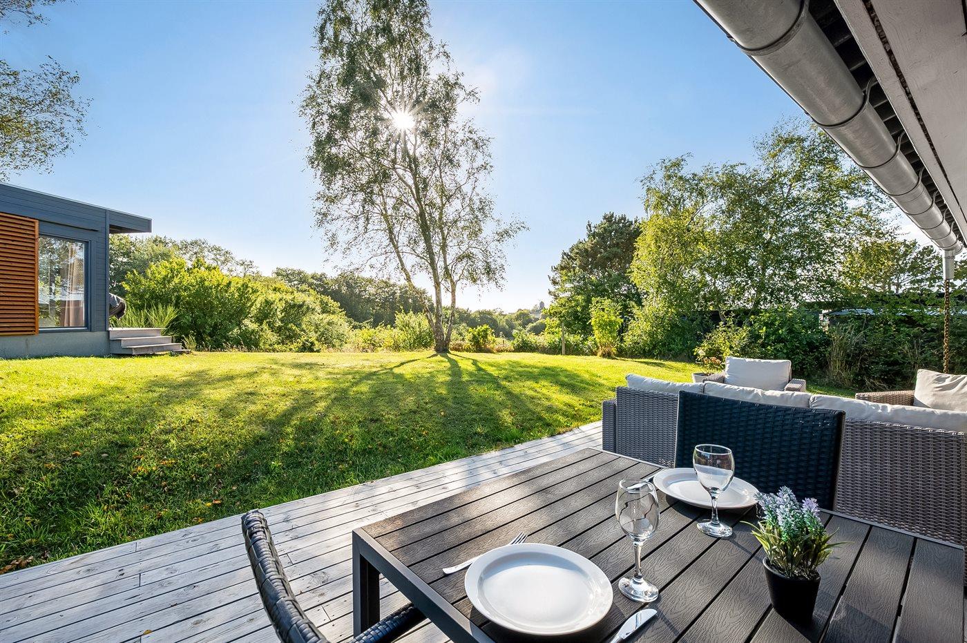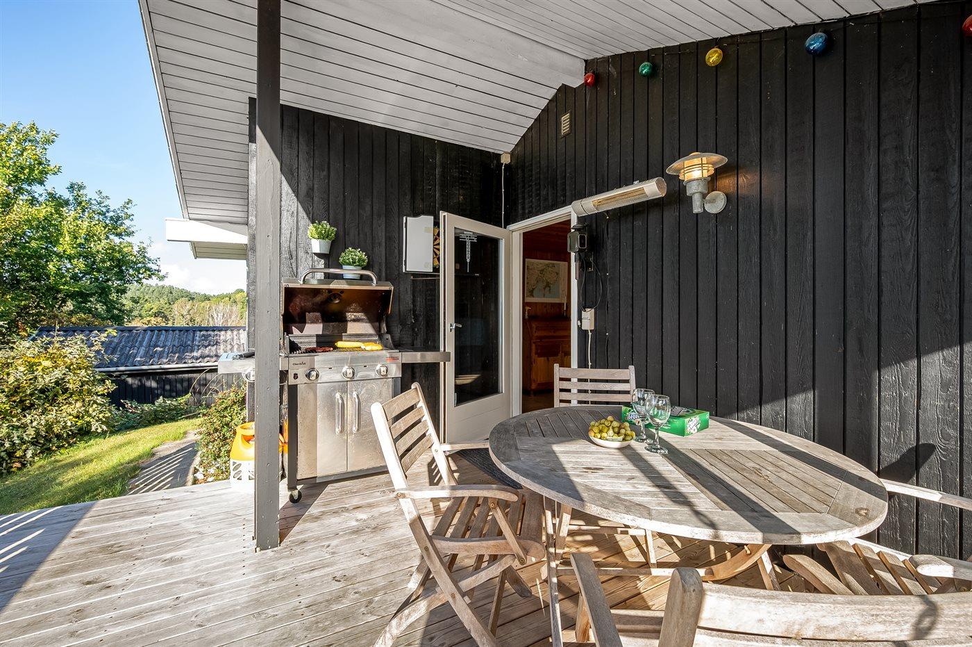 Sommerhuset ligger ganske ugenert på en stor og skøn naturgrund, hvorfra udsigten udover landskabet er helt fantastisk. På flere side af huset er der nogle utrolig gode terrassearealer - således der altid er mulighed for at nyde solen og finde et hjørne i læ, hvis vejret ikke helt skulle arte sig. Den ene af terrasserne er endda overdækket.