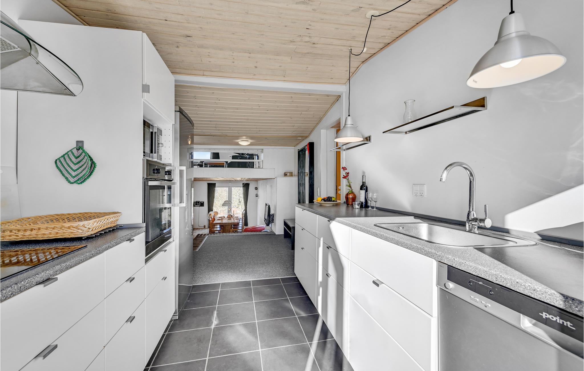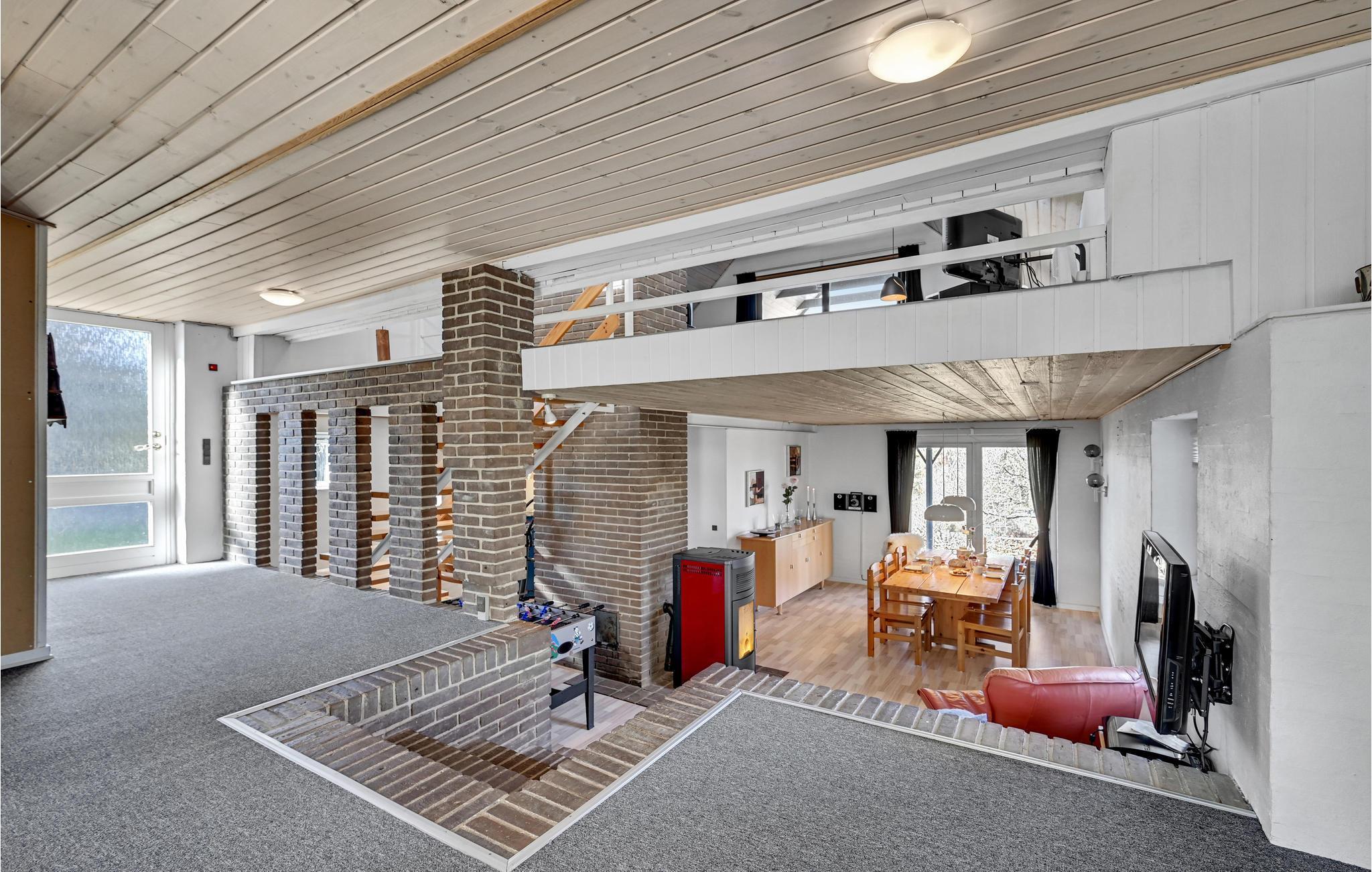 Dette hyggelige sommerhus med 3 soveværelser har plads til 8 gæster, der kan have det hyggeligt sammen her. Værelserne strækker sig over 2 etager og 4 trin fører ned til spisestuen. Køkkenet er åbent ud til spisestuen. Der er en pilleovn og en brændeovn, så I kan gøre jer komfortable på køligere aftener.