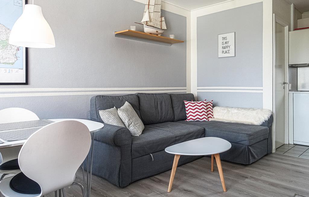 Lejligheden er lyst og venligt indrettet med sovesofa for to personer (150 cm) og en hems med to boksmadrasser (ikke ståhøjde). Fra stuen er der udgang til en privat terrasse med havemøbler og grill, så der er basis for mange skønne sommeraftener under åben himmel.
