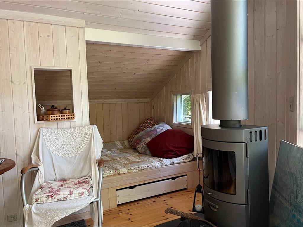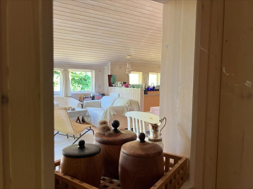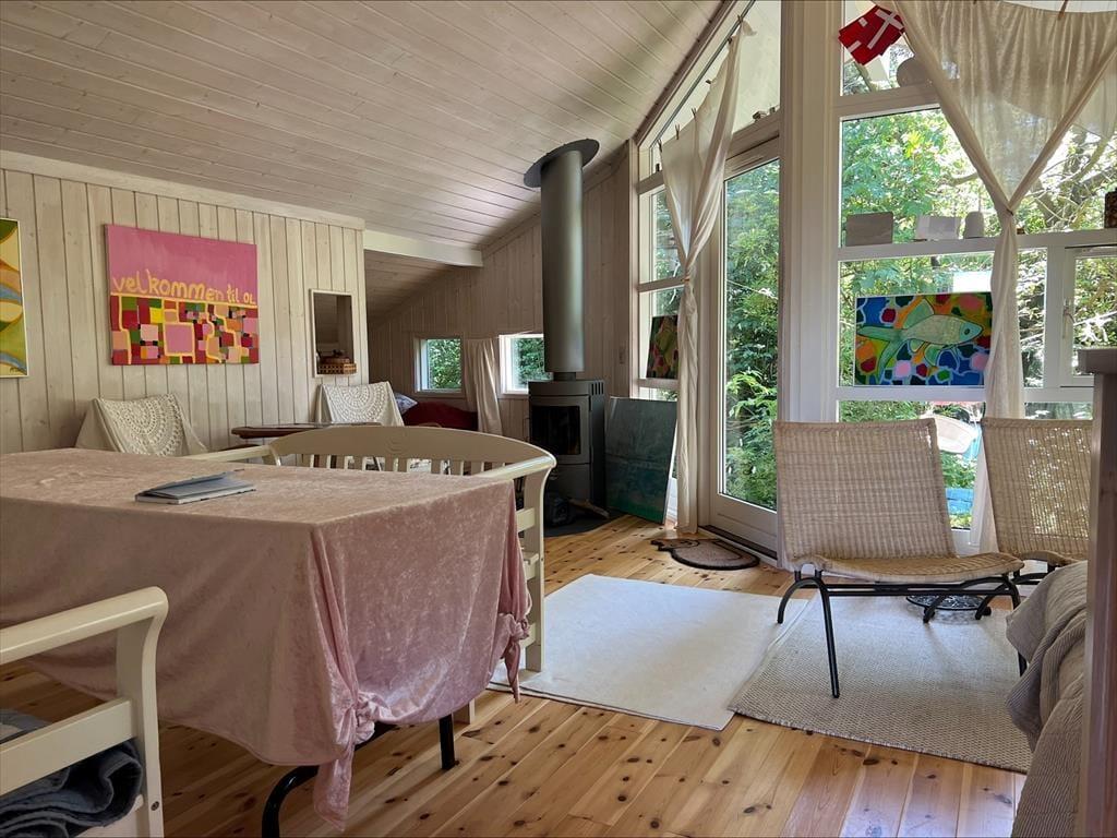 Åben køkken-stue med brændeovn, alkove med 1½ madras