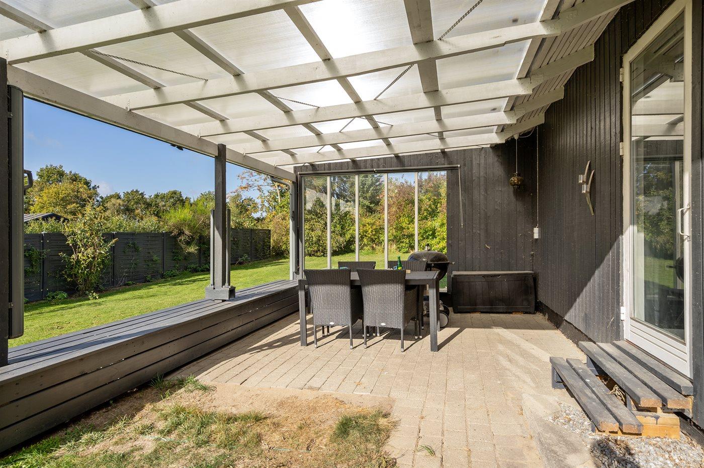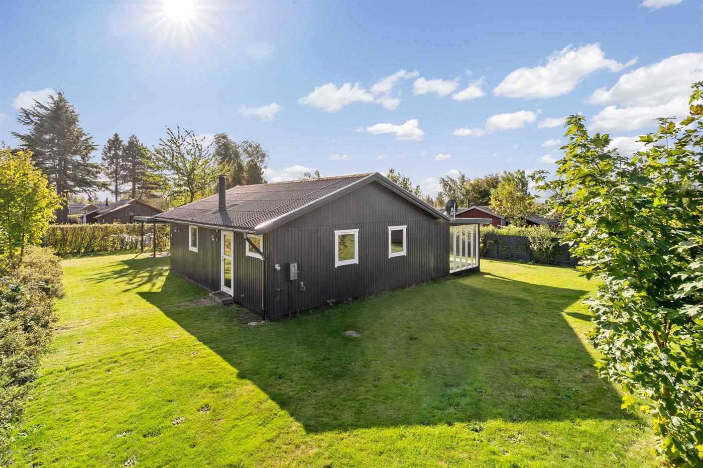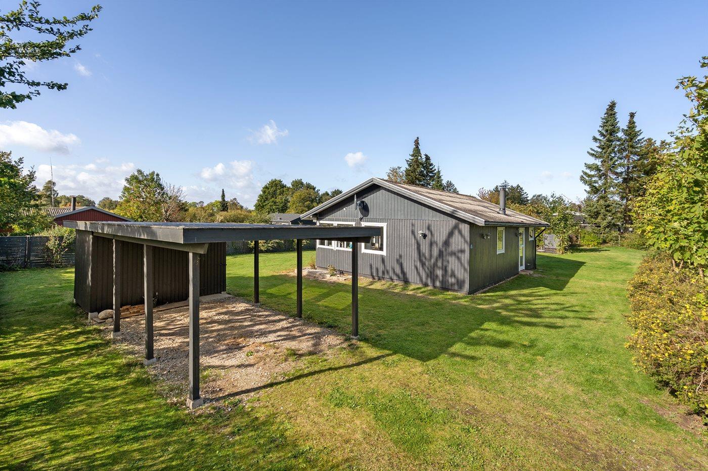 Ferieboligen er beliggende på en 800 m² stor havegrund. Grunden er indhegnet. Der er 1000 m til havet. Nærmeste forretning er beliggende i en afstand af 900 m. Til ferieboligen hører åbent terrasseareal. Desuden er der overdækket terrasse. Bålsted. Grill til rådighed. Der er carport til rådighed. Parkering ved ferieboligen.