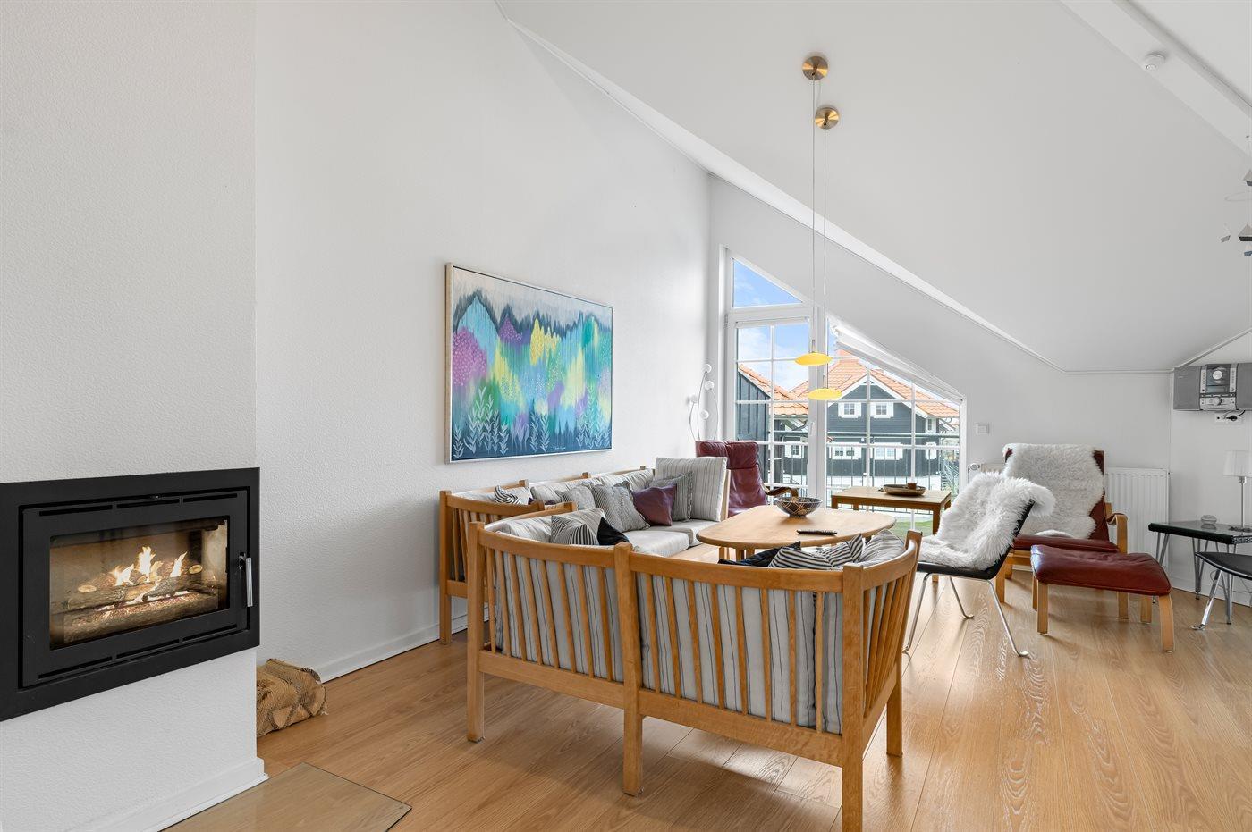 Lejligheden er godt indrettet med flere værelser fordelt på de 2 etager, køkken-alrum på 1. sal og en hyggelig stue på 2. sal. Der findes desuden hems, hvor de to af sovepladserne befinder sig i en dobbeltseng. Der er bad og toilet på begge etager, og på badeværelset på 1. sal er der både spa og sauna!