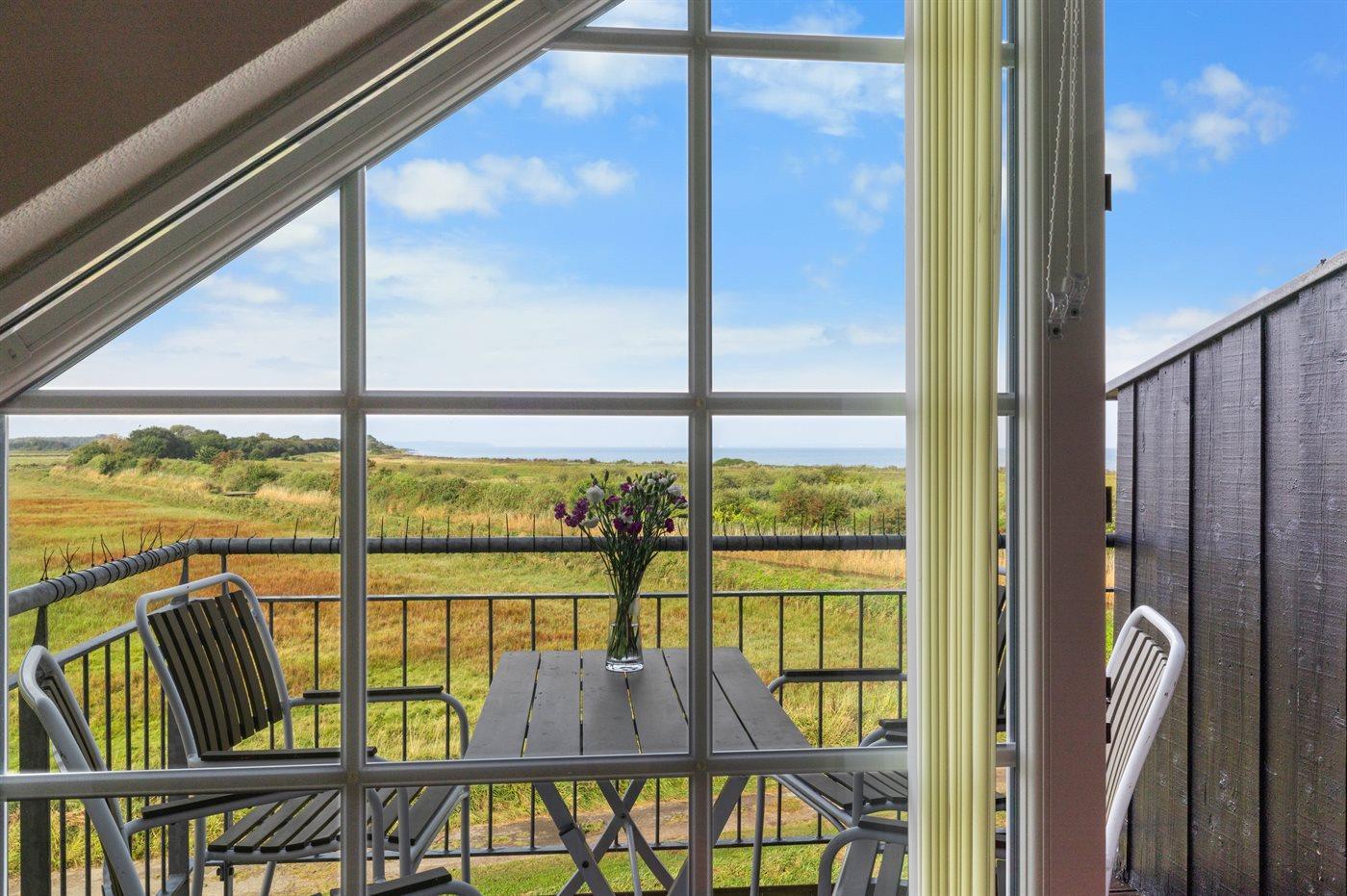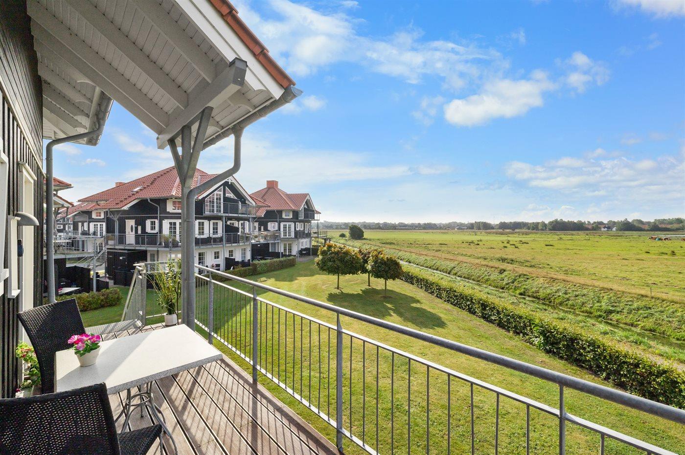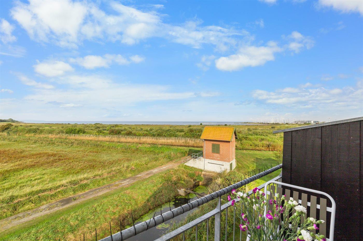 Denne lejlighed udmærker sig ved, at der fra terrasse og altan er fri udsigt ud over det store engområde og vandet og helt til Bogense Marina. Området byder på et meget rigt fugleliv - specielt om foråret - så det anbefales at medbringe kikkert.