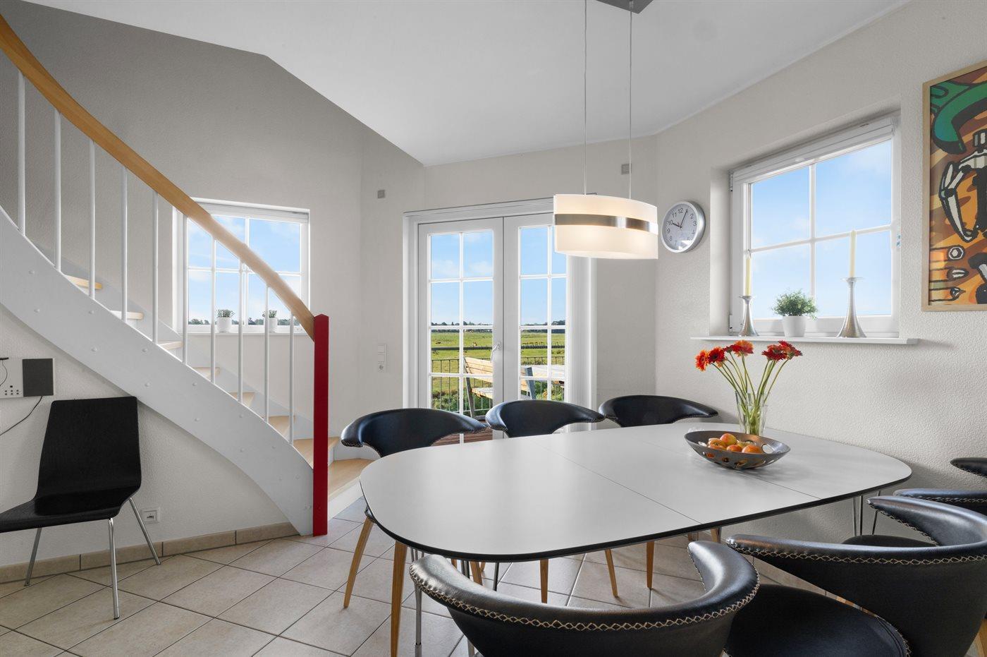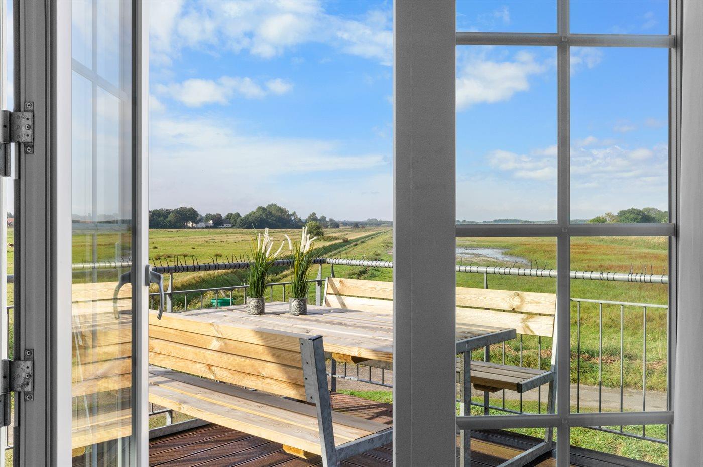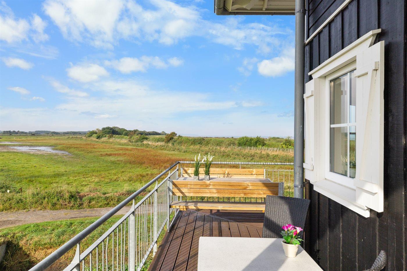 Denne lejlighed udmærker sig ved, at der fra terrasse og altan er fri udsigt ud over det store engområde og vandet og helt til Bogense Marina. Området byder på et meget rigt fugleliv - specielt om foråret - så det anbefales at medbringe kikkert.