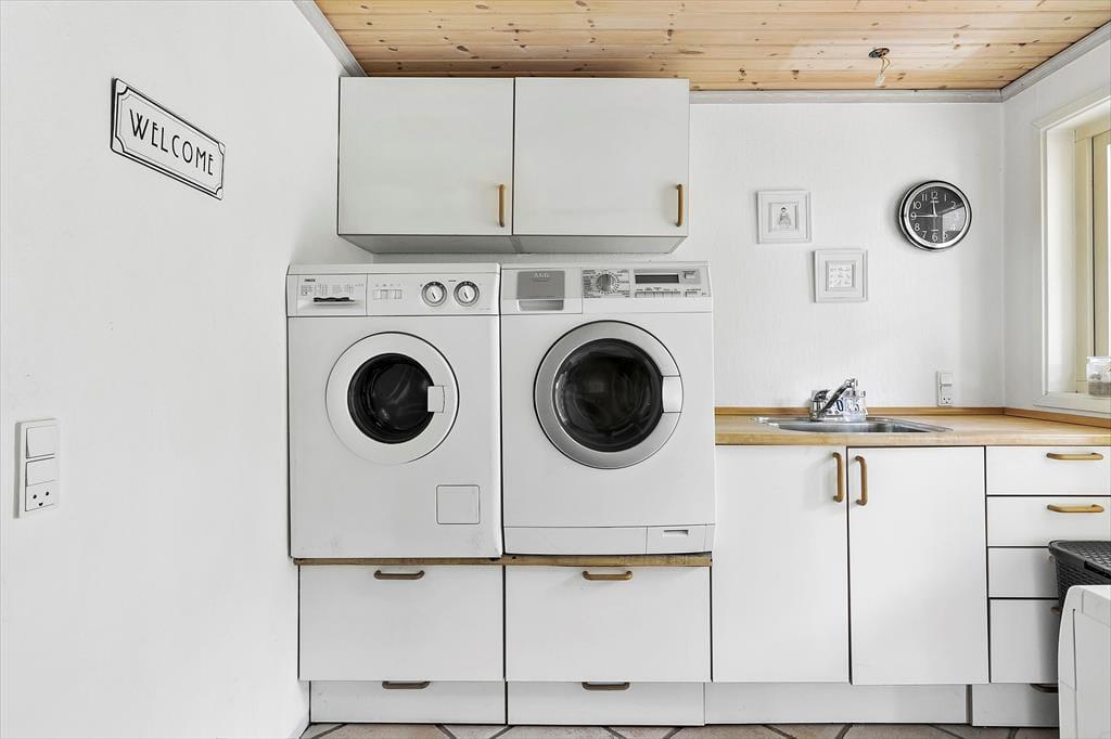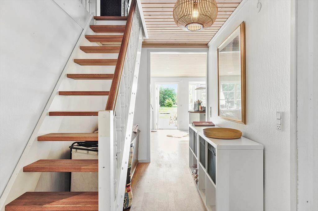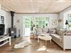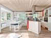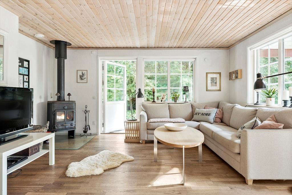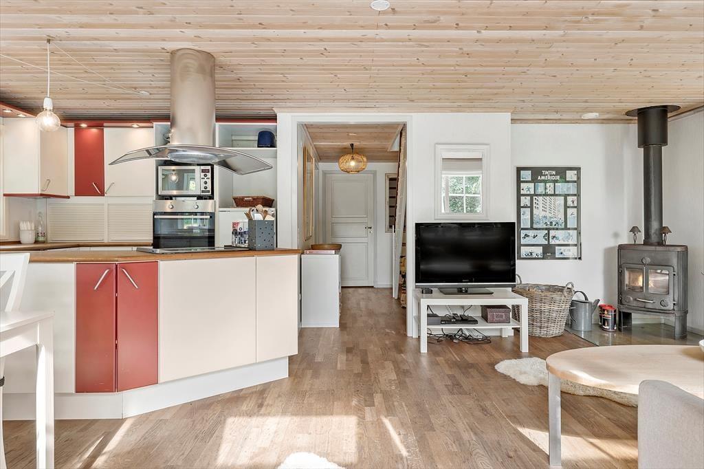 Når du træder indenfor, bliver du mødt af en hyggelig og varm stemning, som hurtigt får dig til at føle dig hjemme. Husets hjerte er den åbne stue, hvor brændeovnen skaber en skøn stemning på kølige aftener. Her kan du læne dig tilbage i de komfortable møbler med en god bog eller samle familien til en hyggelig aften med spil og snak. Stuen ligger i åben forbindelse med køkkenet, som er veludstyret og har alt, hvad du skal bruge for at tilberede lækre måltider til dine kære. Fra køkkenet kan du nemt servere middagen ved spisepladsen, hvor I kan nyde jeres måltider sammen. Derudover er der et praktisk bryggers med både vaskemaskine og tørretumbler, så du nemt kan klare hverdagens små gøremål.