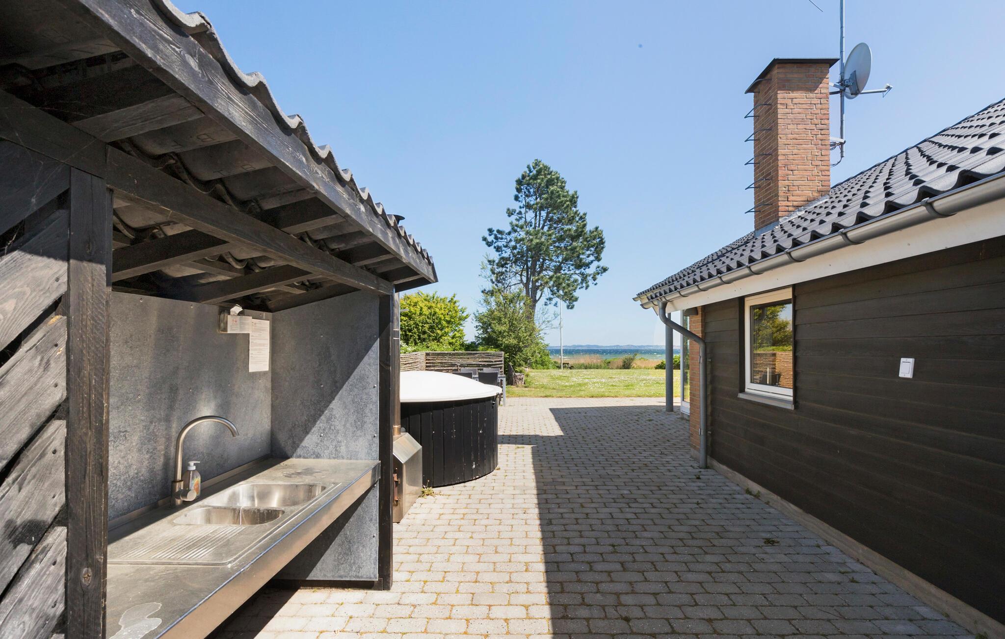 Udendørslivet kan I nyde på den overdækkede terrasse fra morgen til aften. Efter en smuk sommerdag er der intet, der slår en aftentur i det rummelige, brændefyrede vildmarksbad, der har en flot udsigt over Ebeltoft Vig.