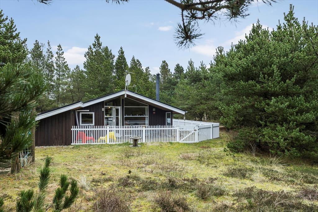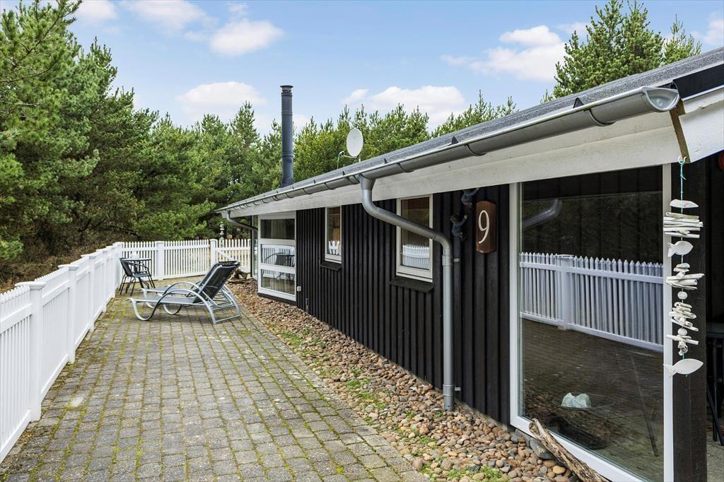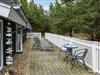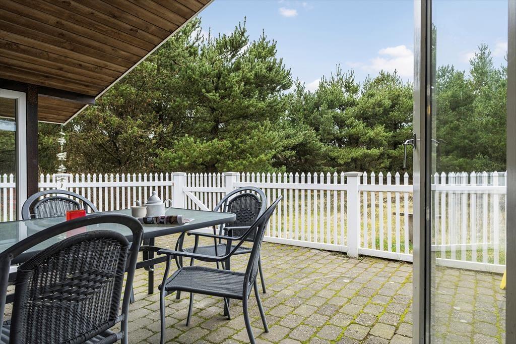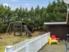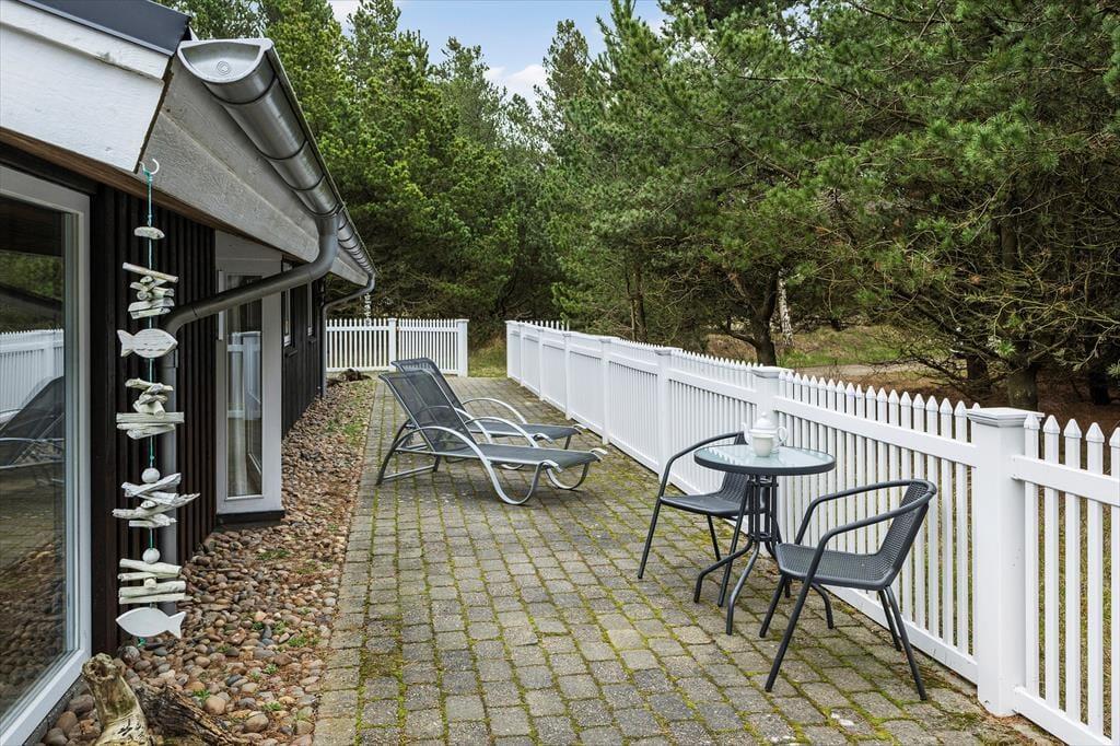En stor og dejlig terrasse, der skærmes af et hvidt stakit, breder sig øst, syd og vest for sommerhuset. Med andre ord får du nemt ved at finde en opholdsplads i solen det meste af dagen – og lige meget hvor du sætter dig, er du omgivet af naturgrundens træer, der rammer udearealerne ind på smukkeste vis. På plænen står der et sjovt legestativ, hvor børnene kan klatre, rutsje og gynge. Og mon ikke de kan bruge lang tid på at lege og boltre sig her, mens de voksne lige snupper en ekstra kop kaffe eller et hvil i havestolene.