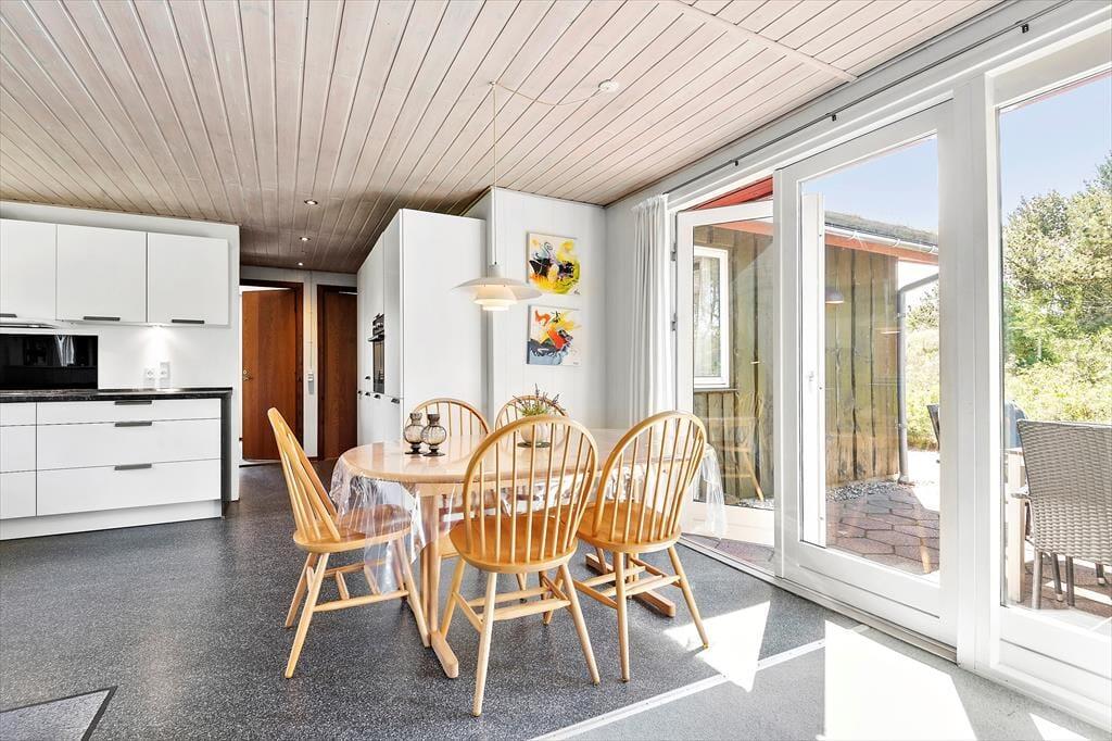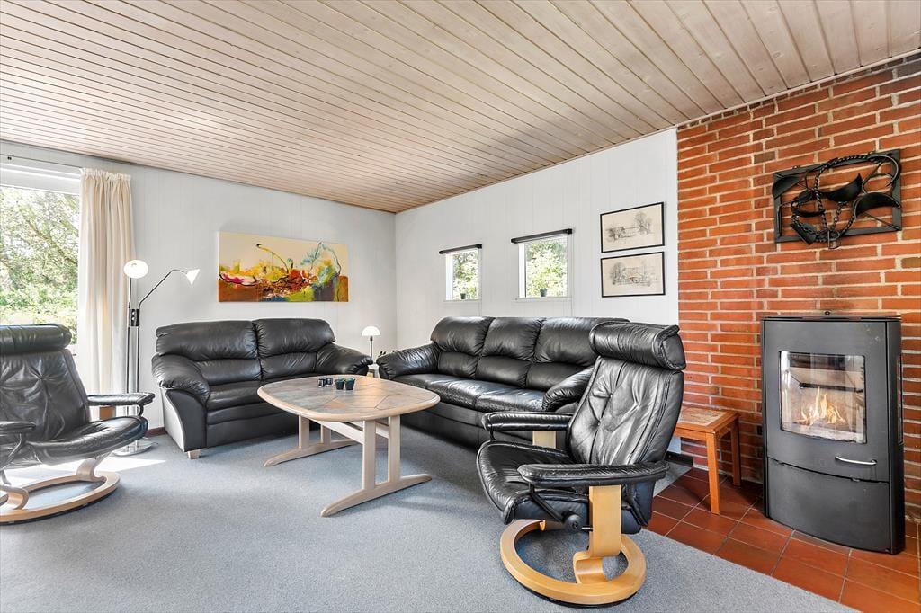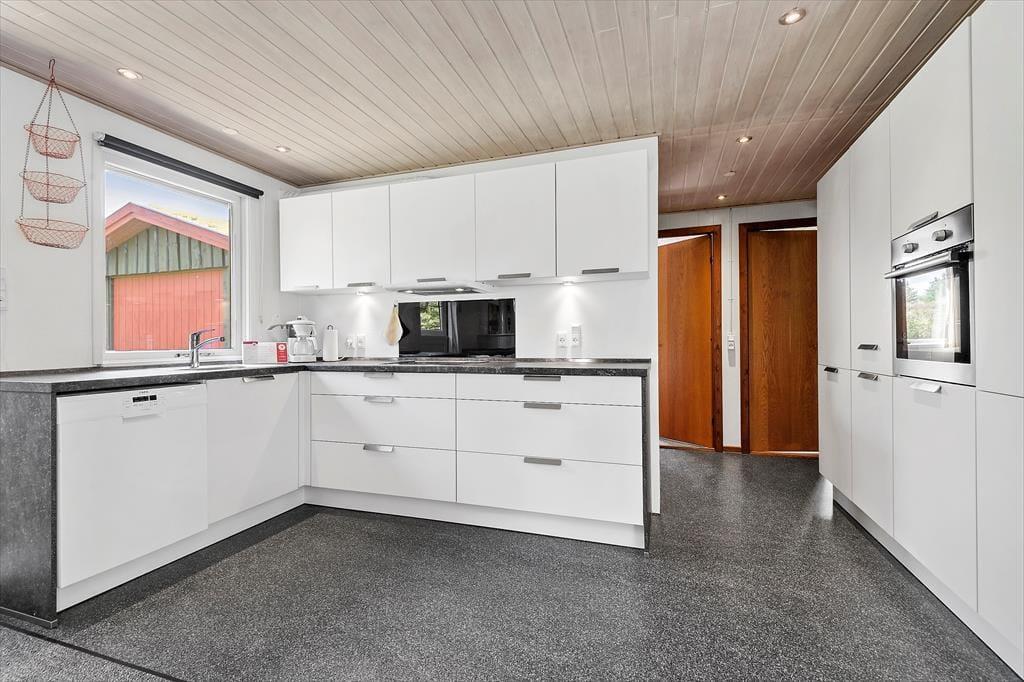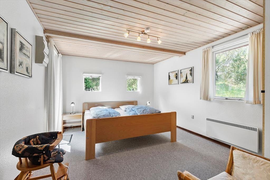 Selv når I opholder jer inden døre, har I fornemmelsen af at være tæt på naturen, for gennem vinduerne kan I se lige ud på grundens krogede fyrretræer og lyngplanter. Udsigten kan blandt andet nydes fra husets store og flot moderniserede opholdsrum, som er udstyret med brændeovn og et lækkert åbent køkken. Køkkenafdelingen er stor, så I kan sagtens hygge jer sammen om madlavningen – eller også kan resten af familien sidde ved spisebordet og holde kokken med selskab. Også husets tre soveværelser, som alle er udstyret med dobbeltseng, præsenterer sig på lys og indbydende vis, og endelig består planløsningen af et godt badeværelse med gulvvarme og bruseniche.