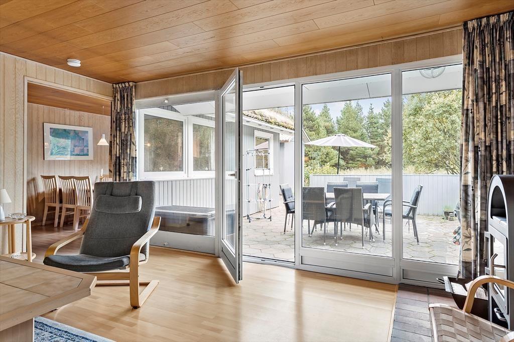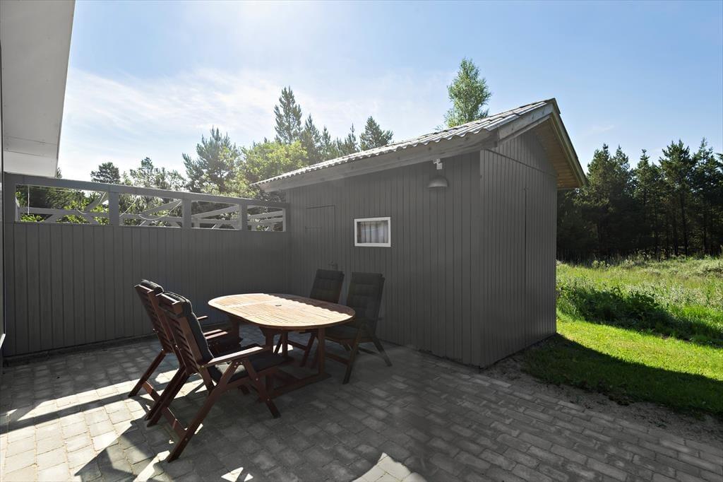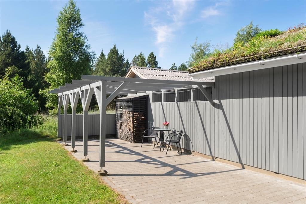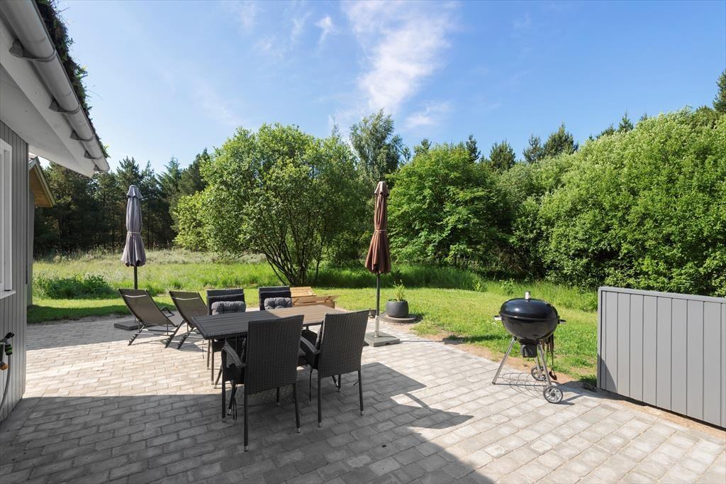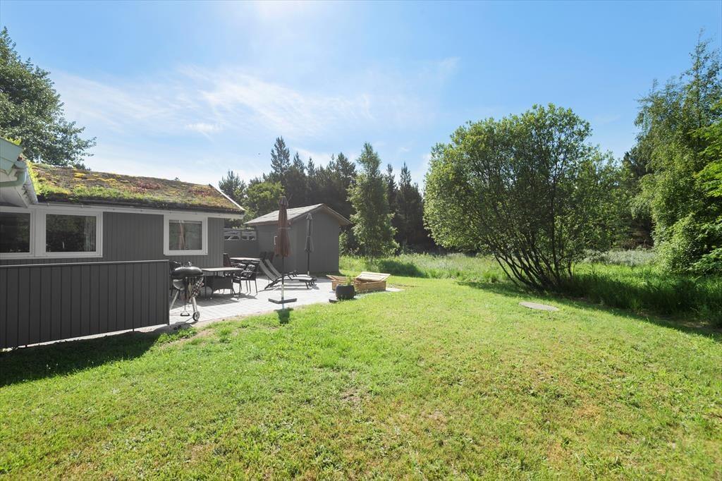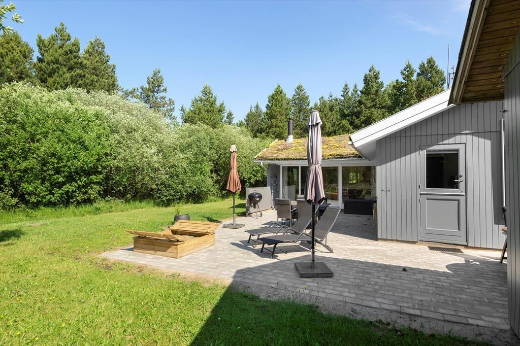 Fra stuen kan I træde lige ud på den sydvestvendte terrasse. Ved siden af ligger en åben fliseterrasse, og her er der både sandkasse og fri adgang til græsplænen, Randbeplantningen skærmer terrassen og grunden af, og så ligger sommerhuset for øvrigt på en lukket vej, så omgivelserne er både flotte og fredelige.