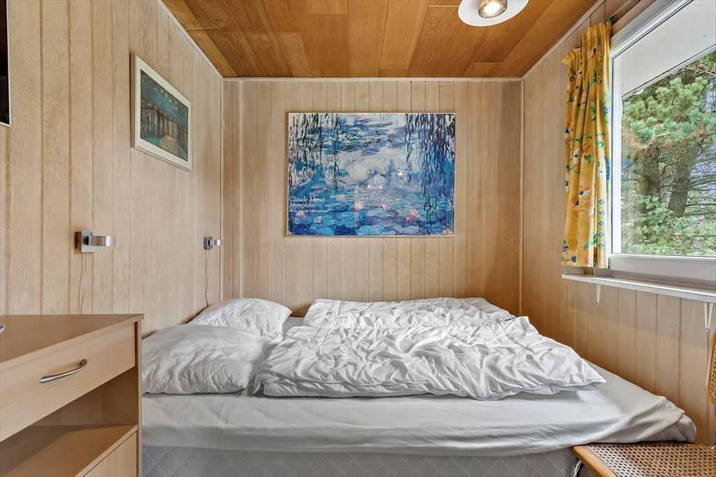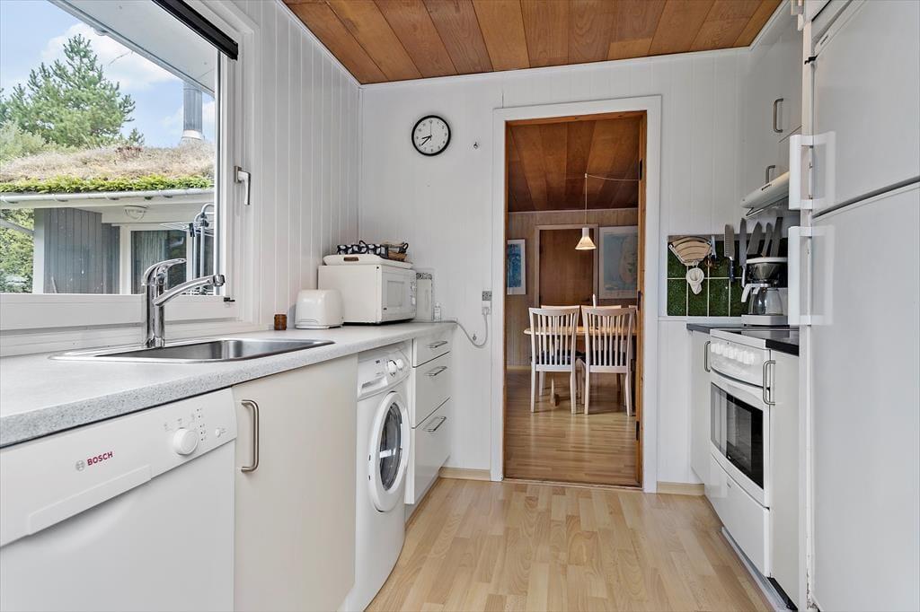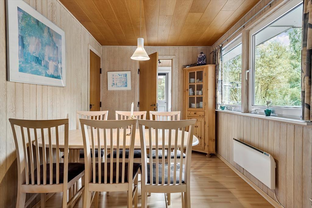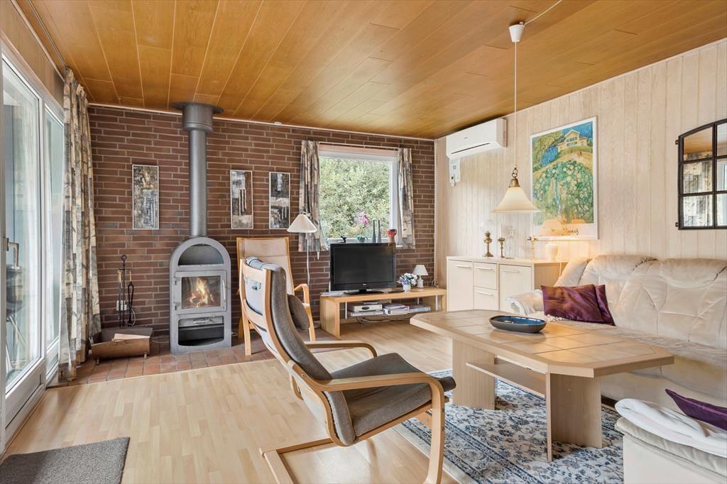 Familie tid og fælles hyggestunder får glimrende vilkår her i sommerhuset, der blandt andet er indrettet med tre komfortable soveværelser og et fint badeværelse. Det allervigtigste ved planløsningen er nu opholdsafdelingen, for det er her i stuen, at I kommer til at tilbringe tiden sammen – for eksempel med brætspil ved spisebordet eller en god film i sofa afdelingen. Er det køligt udenfor, kan I benytte jer af varmepumpen og tænde op i brændeovnen, for det skal nok få varmen og hyggestemningen i vejret. Og når det er ved at være spisetid, kan I smutte ud i det tilstødende køkken, som er udstyret med opvaskemaskine, mikroovn og flere gode hvidevarer, der gør det nemt at smække et lækkert måltid mad sammen.